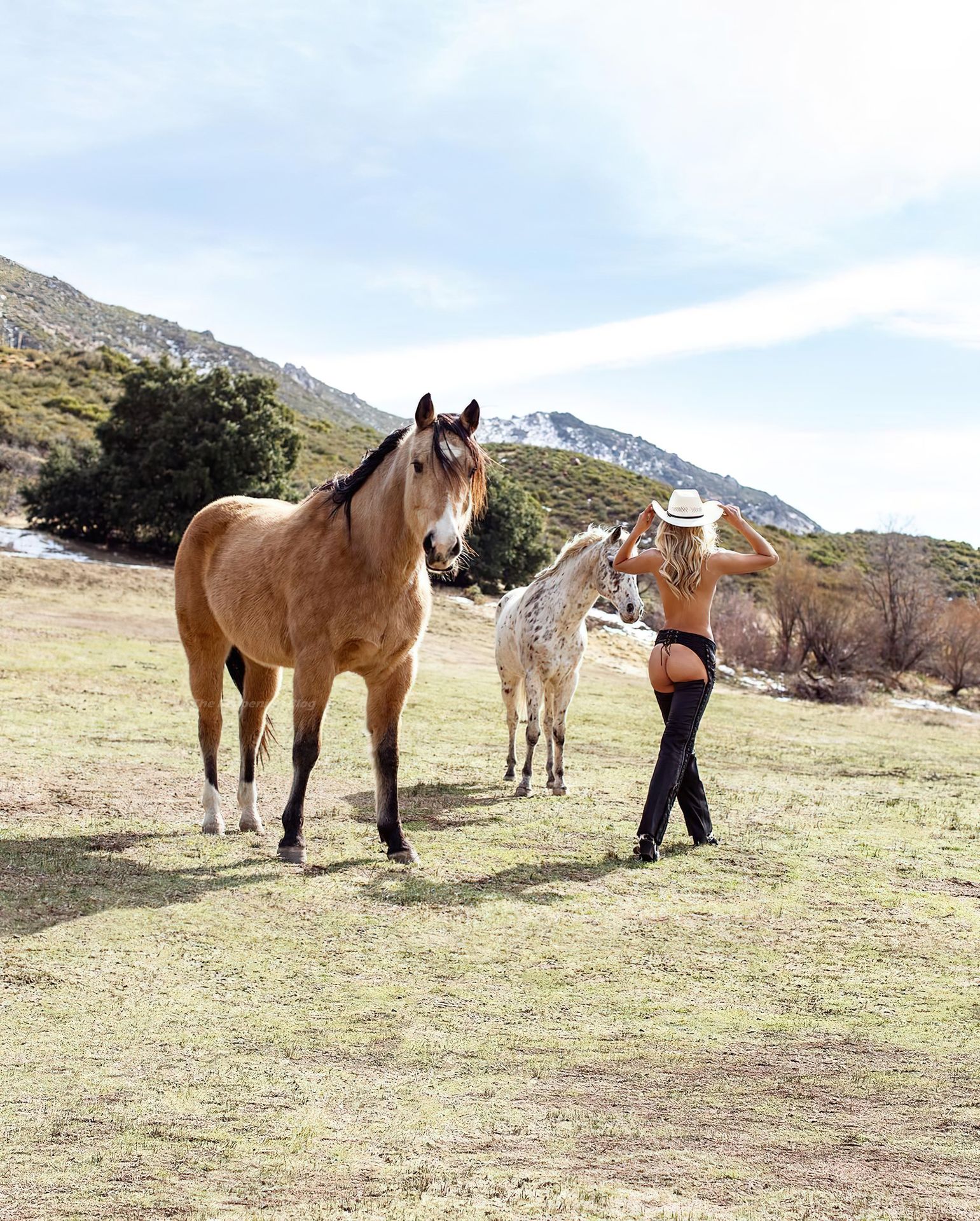 A modelo exibe um pouco de pele, posando como uma cowgirl ao ar livre e em um cavalo, nua e topless, cobrindo os seios e exibindo seu belo bumbum.