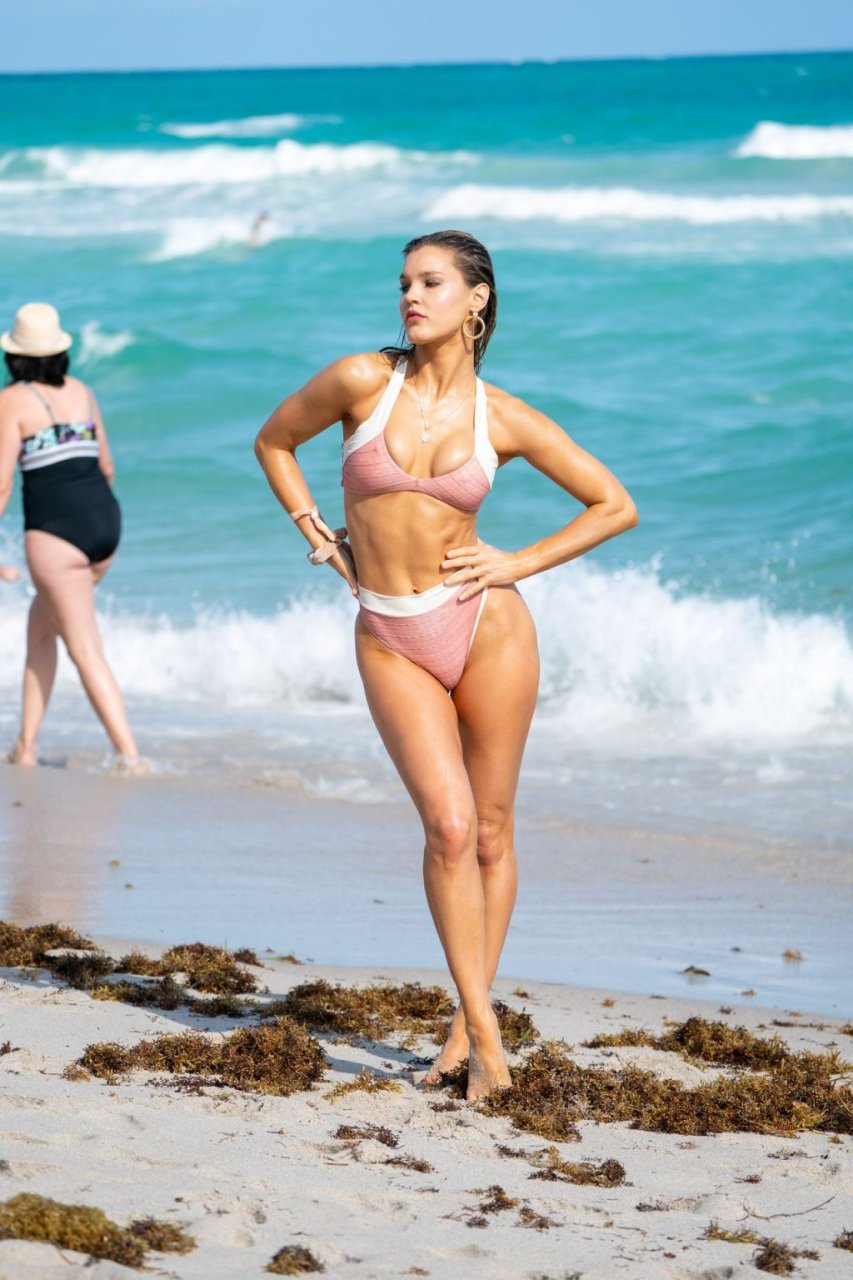 Joy Corrigan aproveita um dia ensolarado na praia em Miami, 08/12/2018. A bela modelo americana de 23 anos exibiu seu corpo bronzeado usando um biquíni branco e rosa.