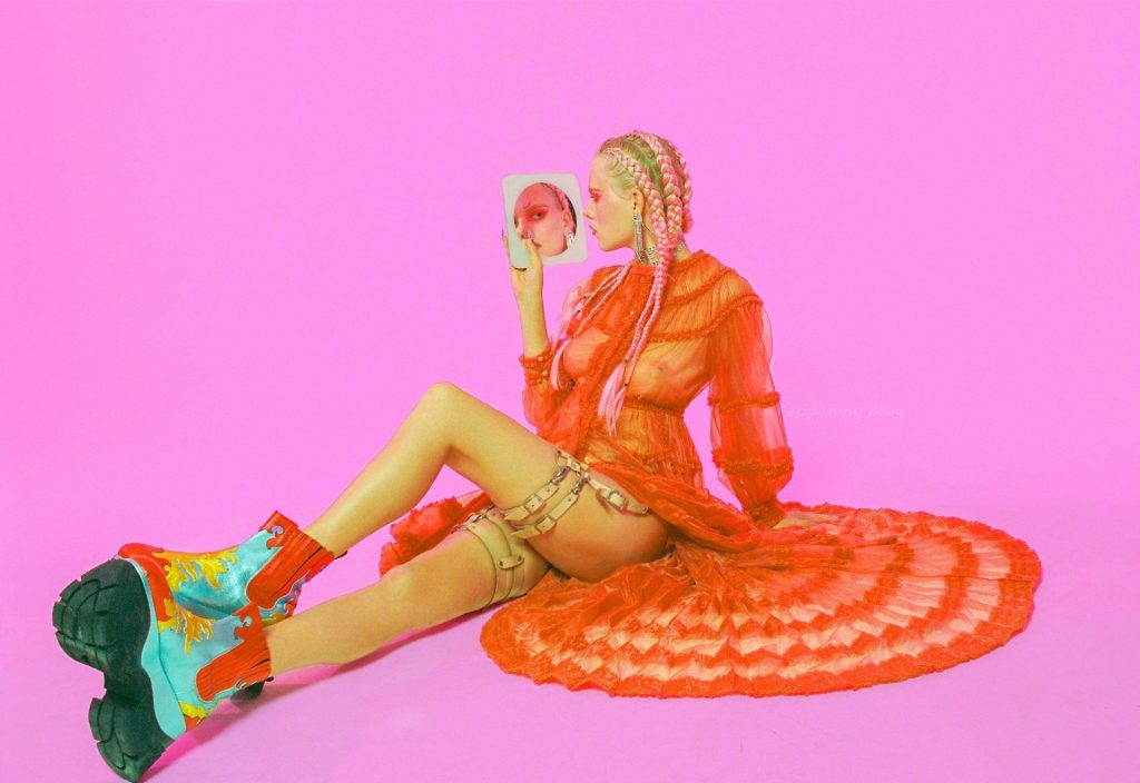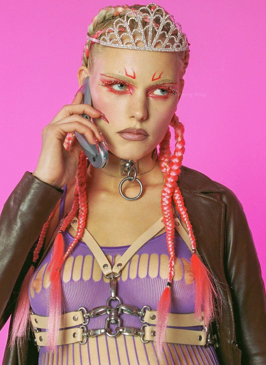 A modelo Julia Almendra exibe seus seios naturais nus com grandes mamilos enquanto posa com um body e vestido transparentes para a revista Nikkou em um ensaio fotográfico de Lilith D’Lust (2020).