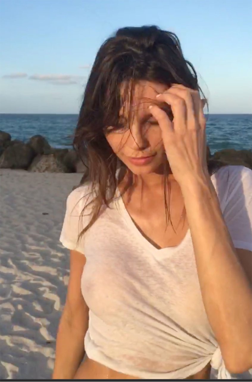 A estilista de moda praia e modelo brasileira Julia Pereira estava fazendo um ensaio fotográfico ousado de camiseta molhada na praia em Miami, 26/07/2017.