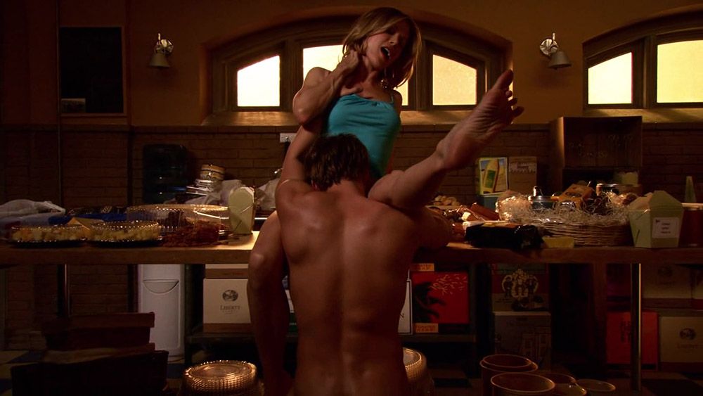 Then we have one of Julie Bowen’s hottest sex scenes, and it’s from Weeds. She didn’t show anything, but her sex and moaning got fappers excited! She wears a green top as the guy licks her pussy while she’s on top of the kitchen table!