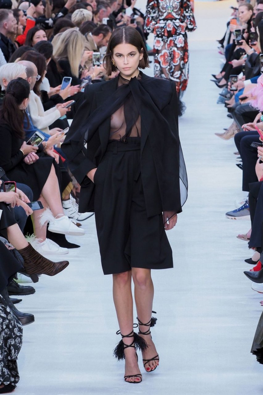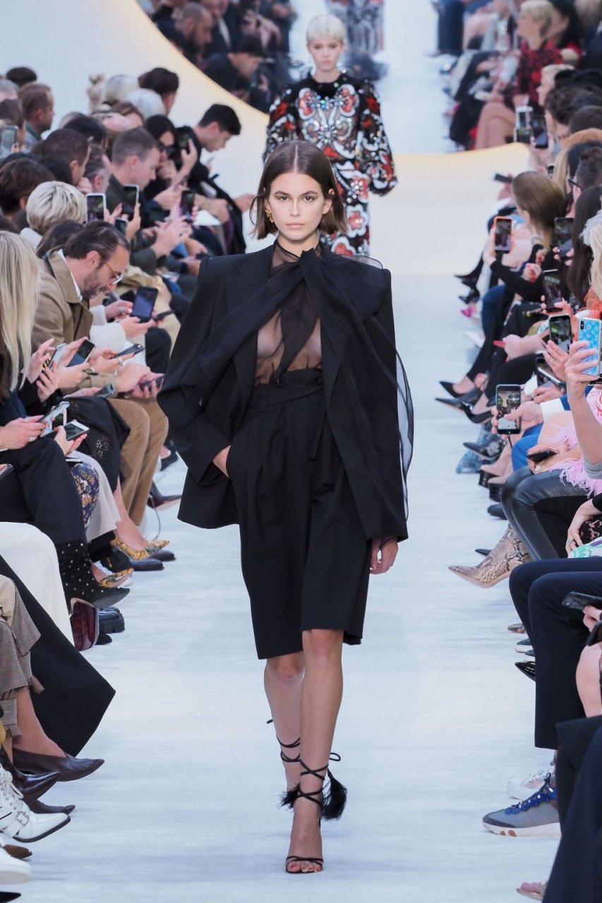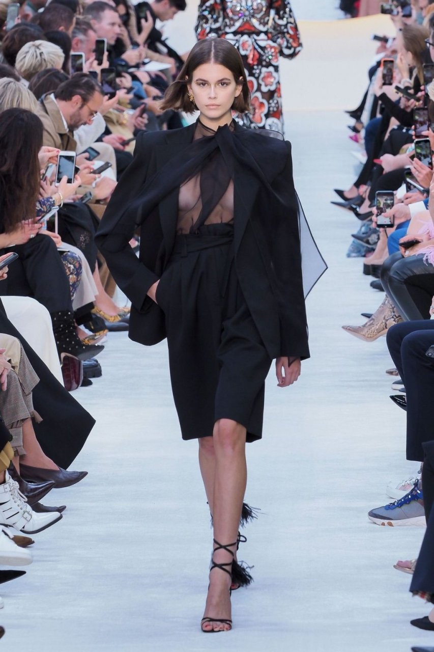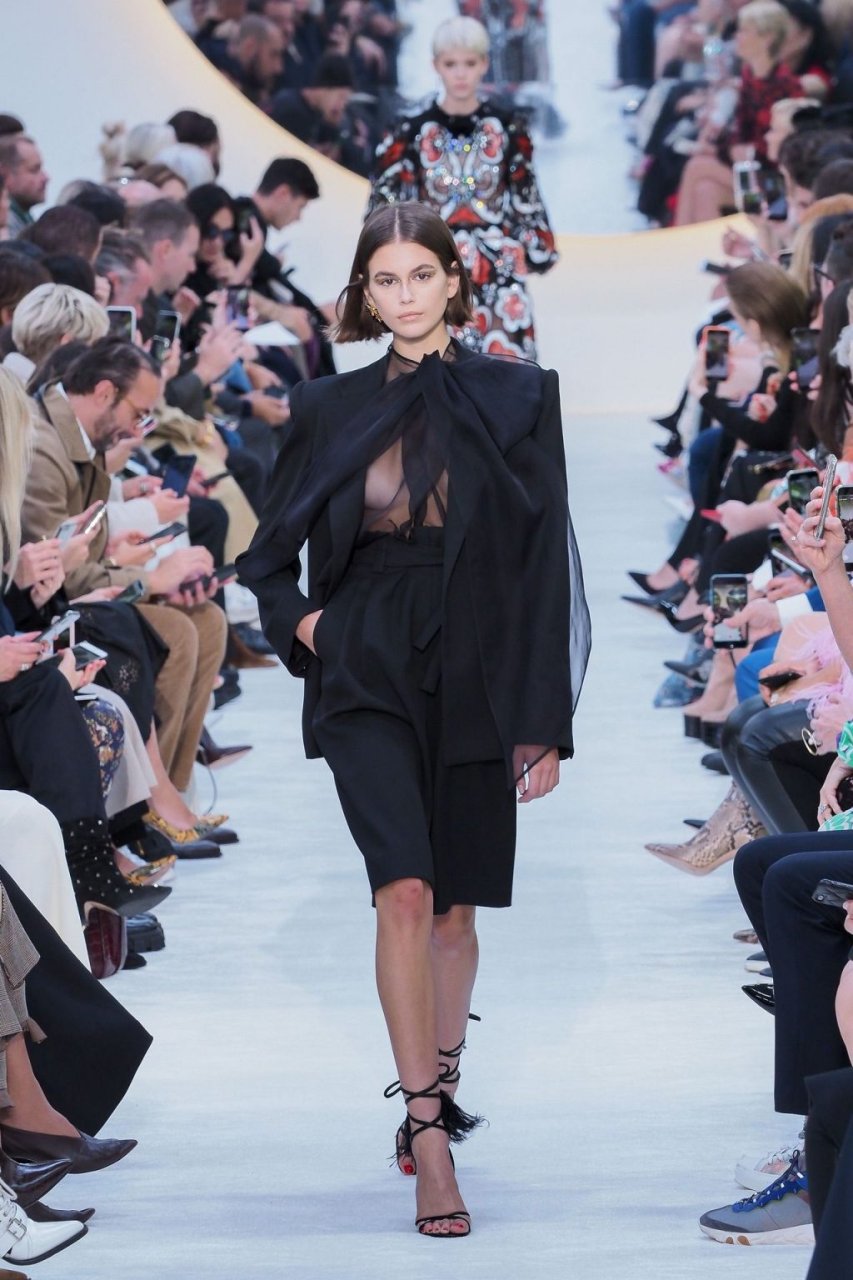 Model Kaia Gerber (18) desfila com uma blusa transparente no desfile de moda Valentino Primavera/Verão 2020 em Paris, 29/09/2019.