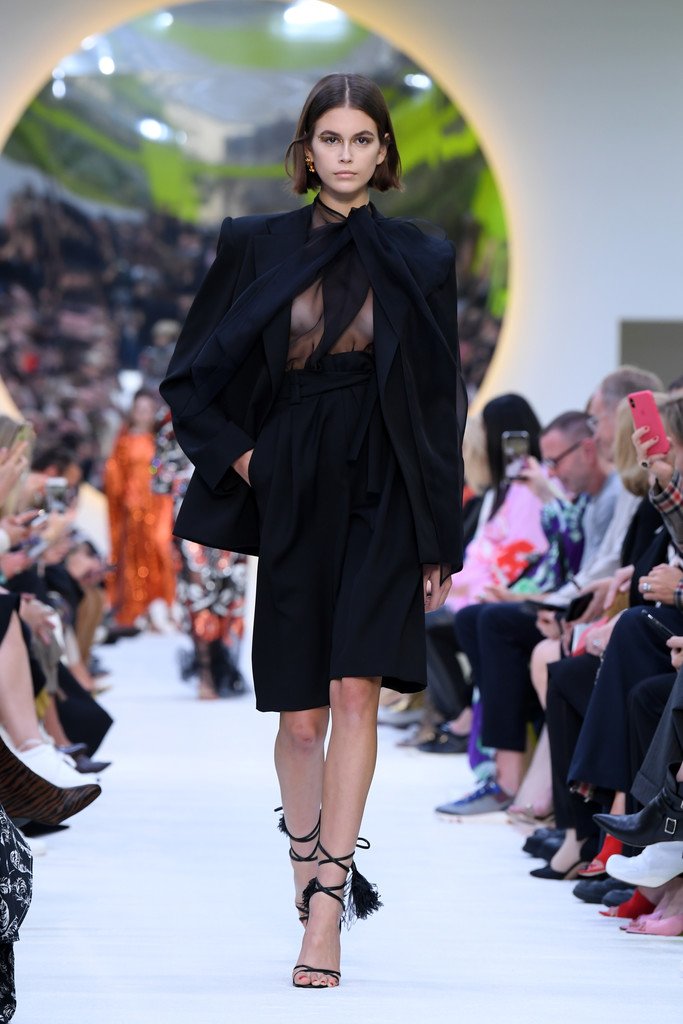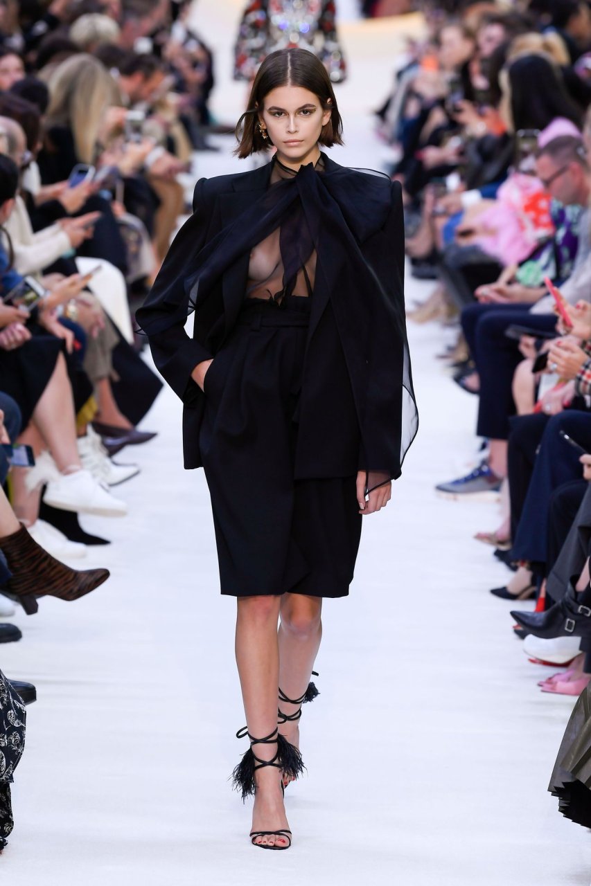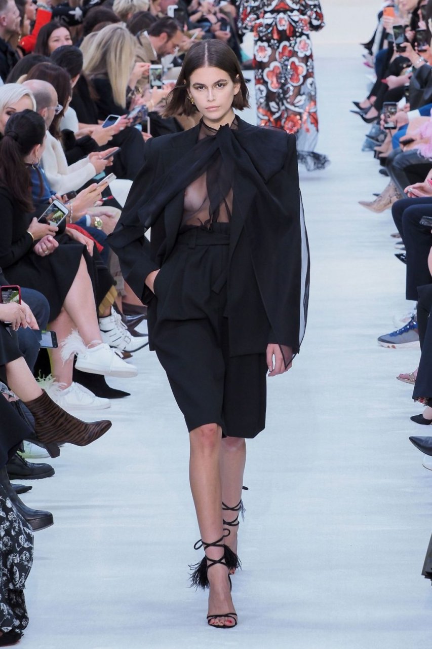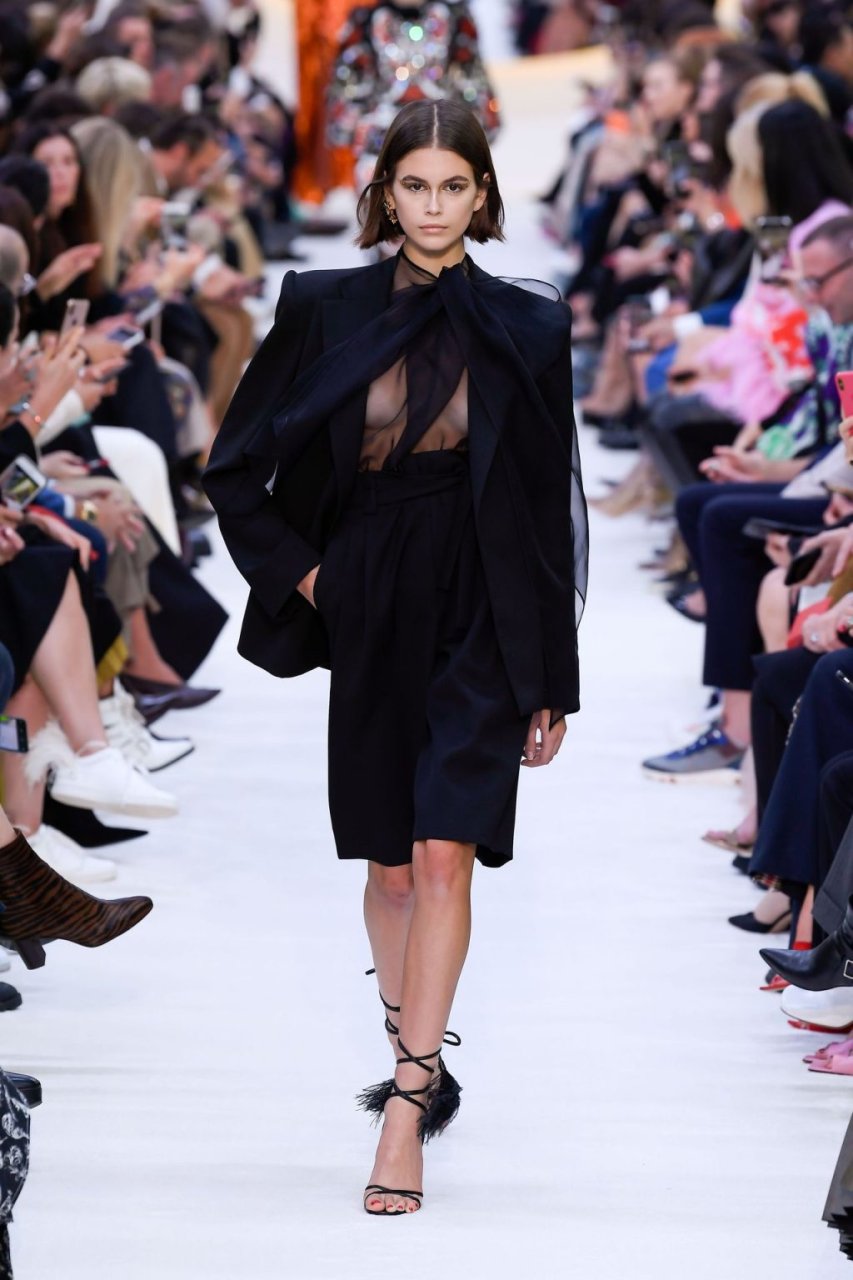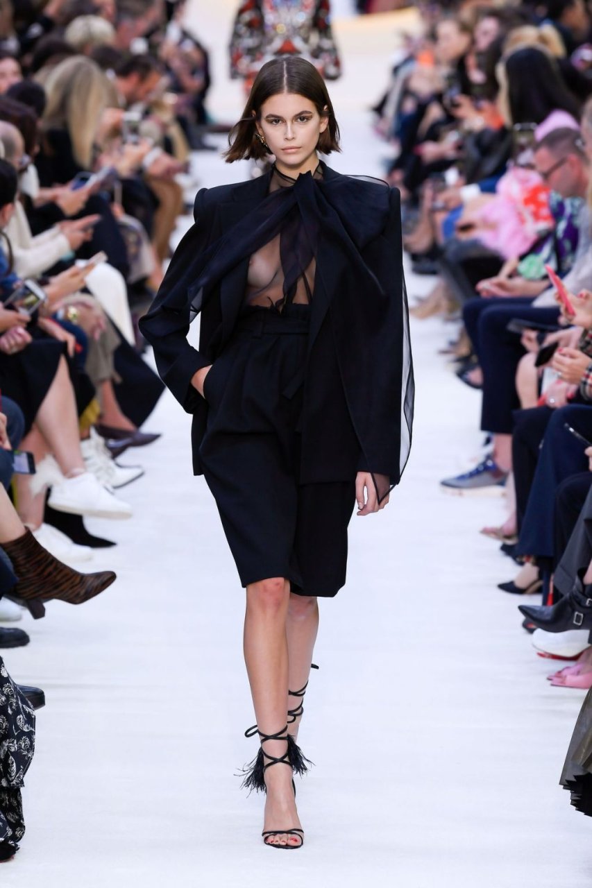 Model Kaia Gerber (18) desfila com uma blusa transparente no desfile de moda Valentino Primavera/Verão 2020 em Paris, 29/09/2019.