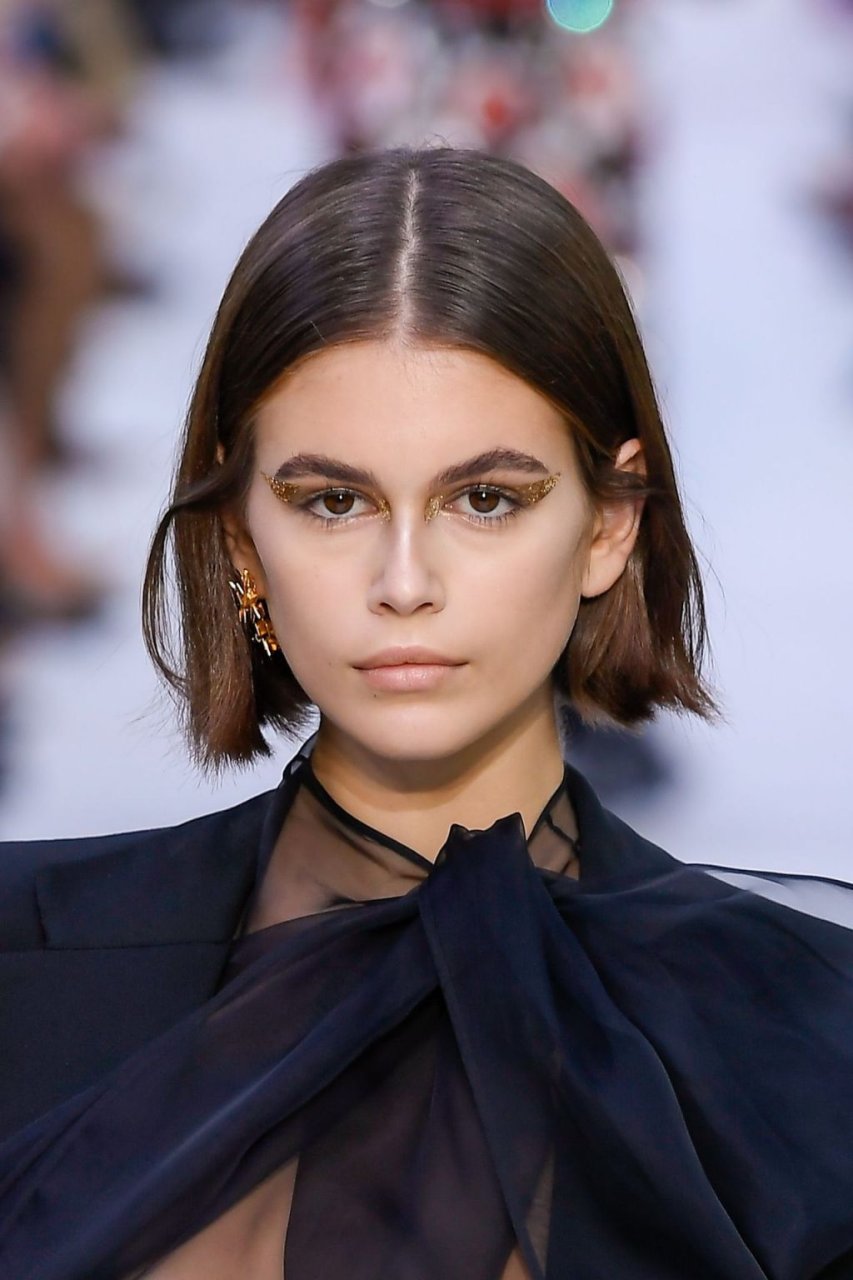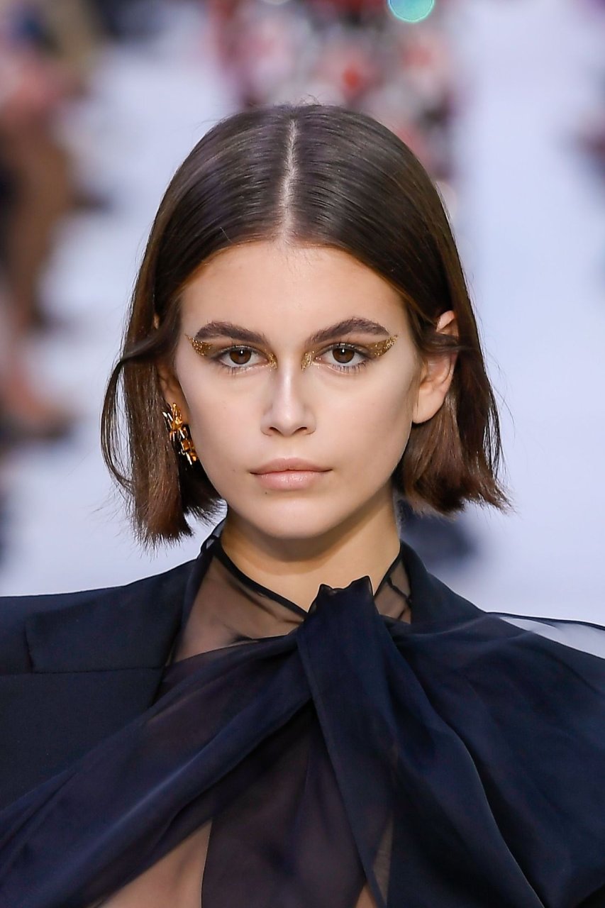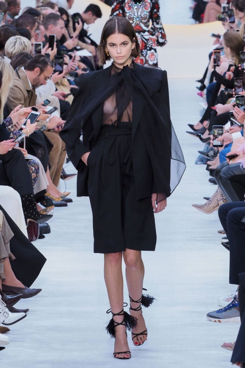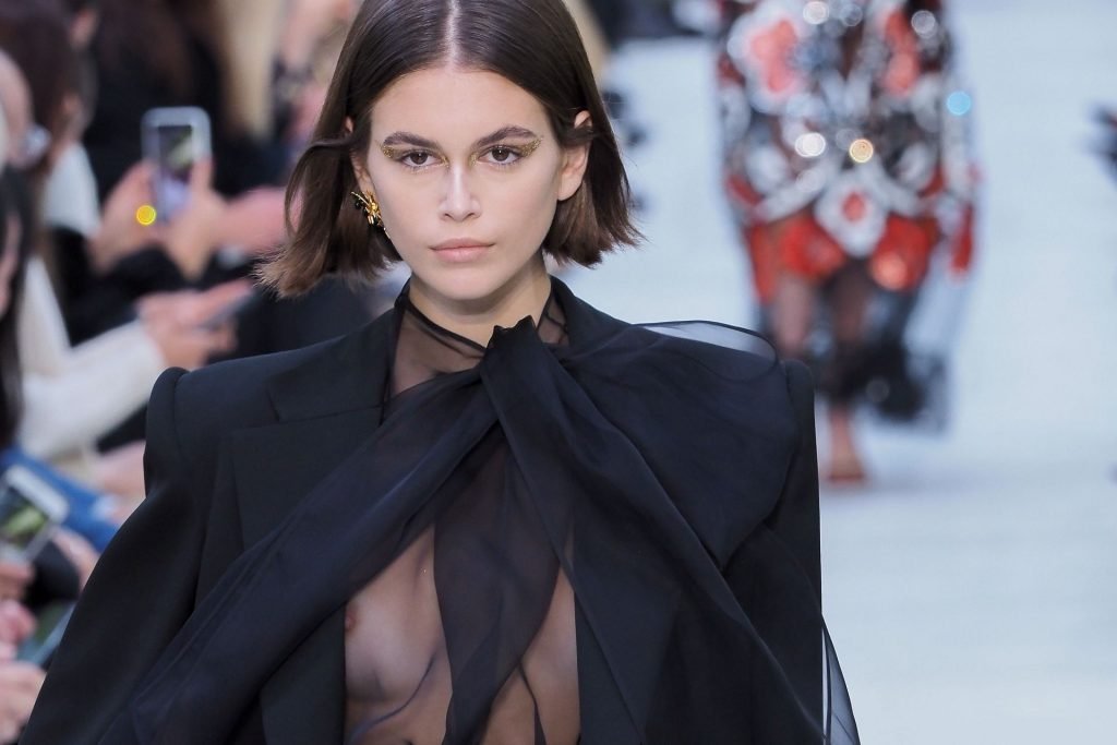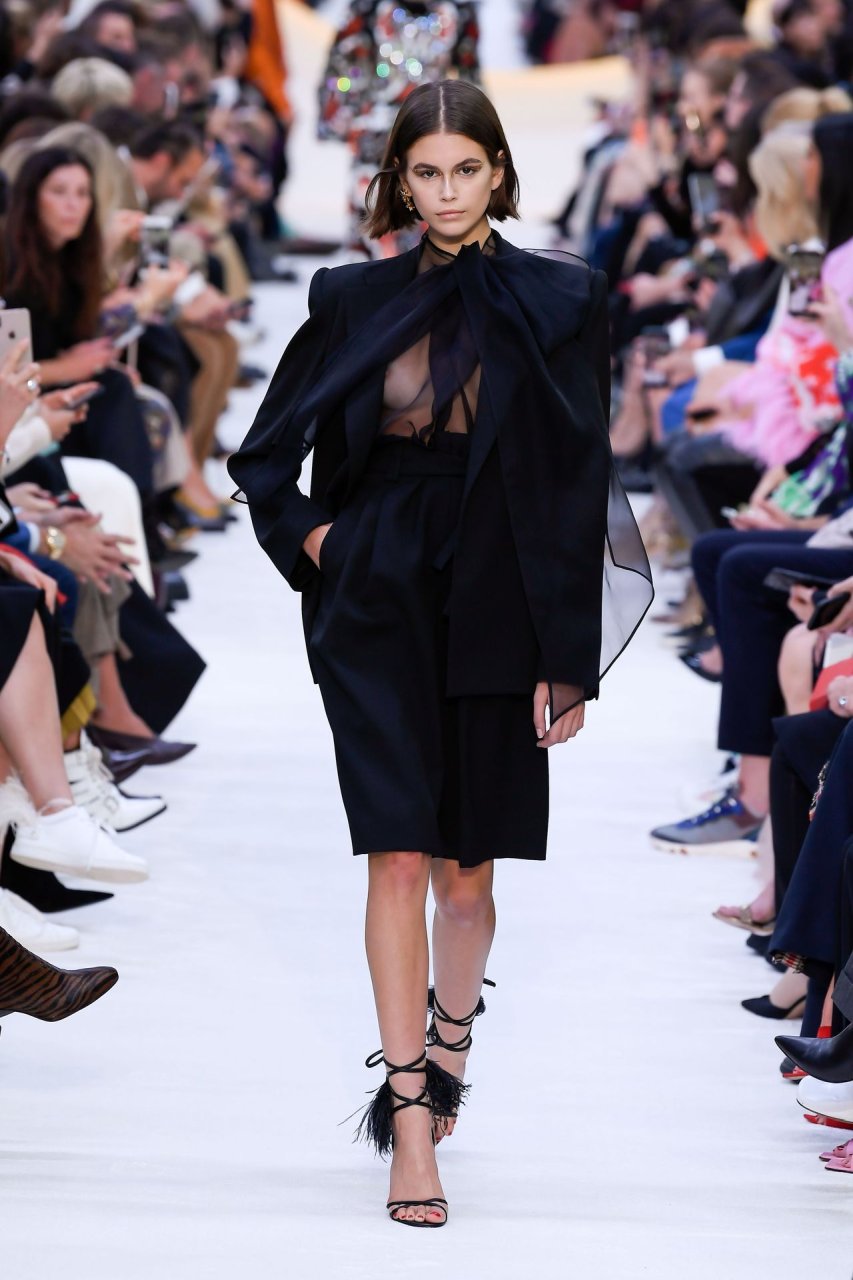 Model Kaia Gerber (18) desfila com uma blusa transparente no desfile de moda Valentino Primavera/Verão 2020 em Paris, 29/09/2019.