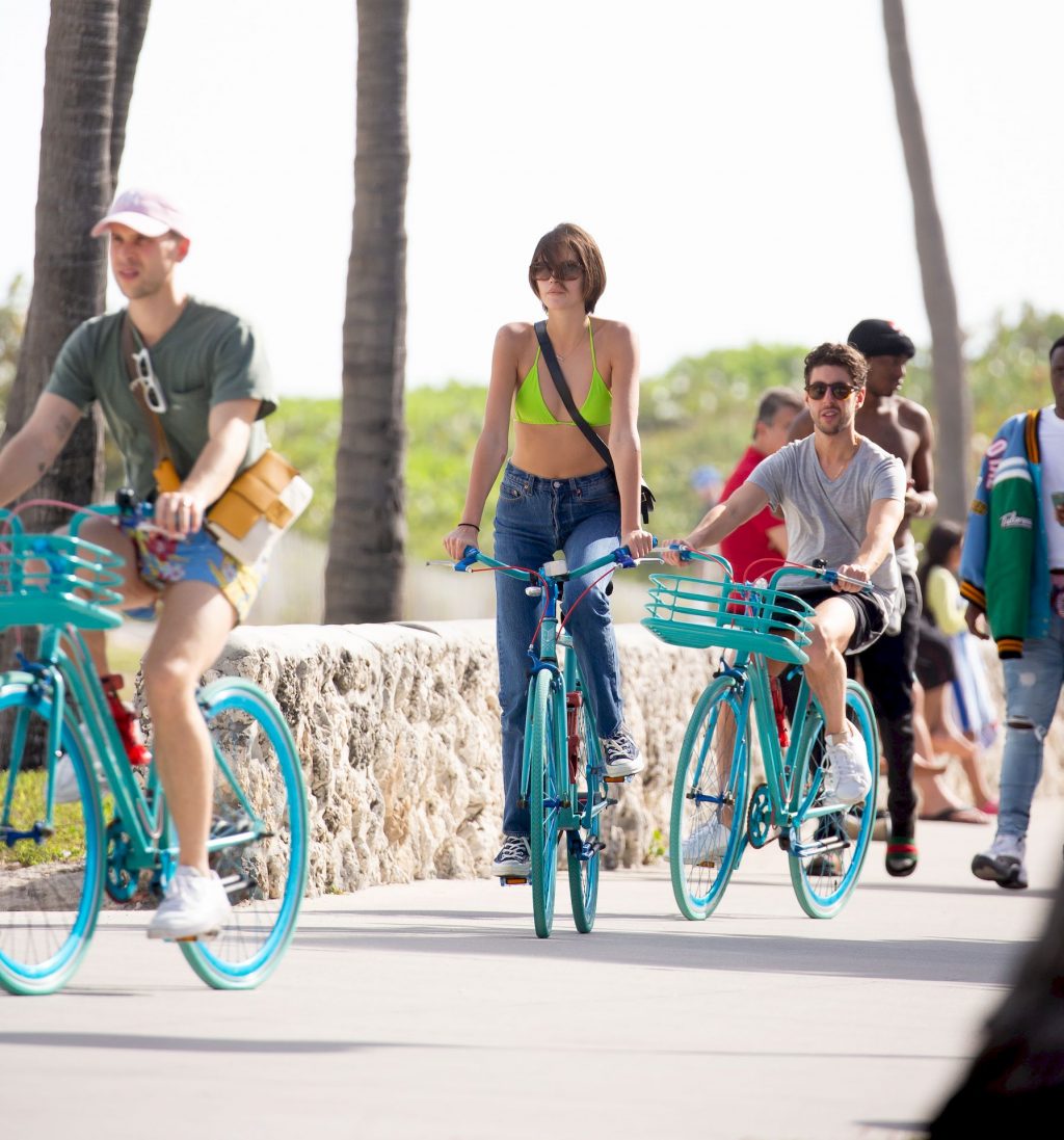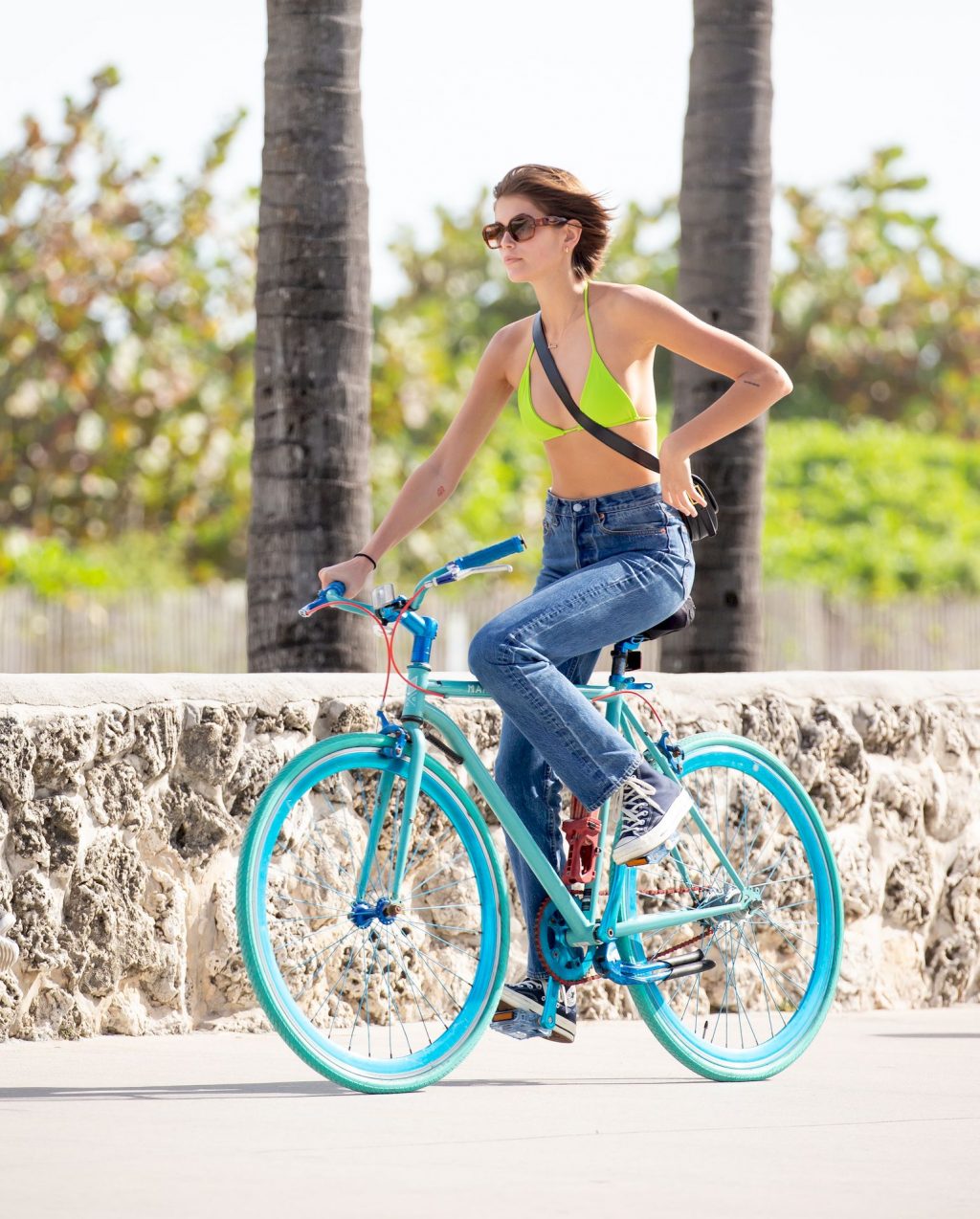 Supermodelo Kaia Gerber (18) parece despreocupada durante um passeio de bicicleta em Miami Beach com amigos de Hollywood, 13/01/2020.