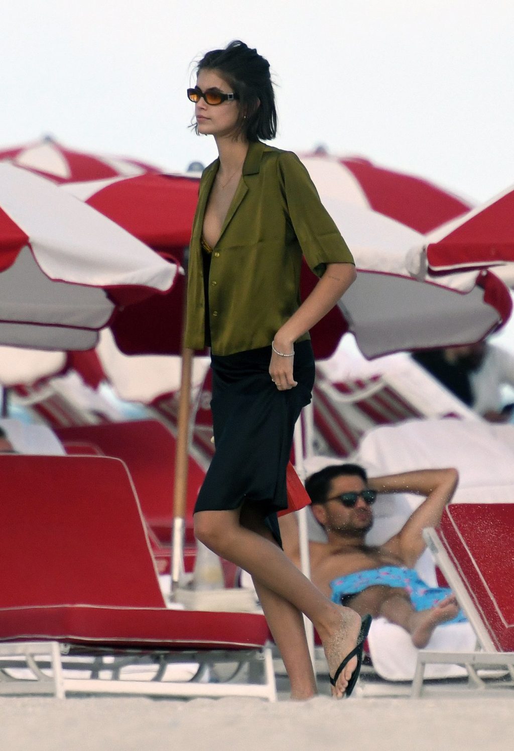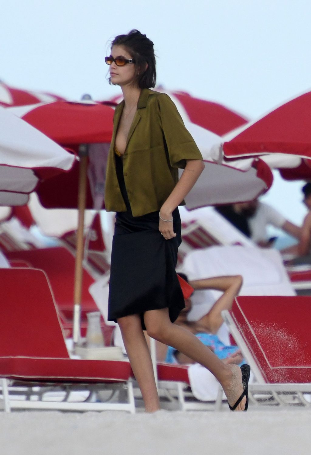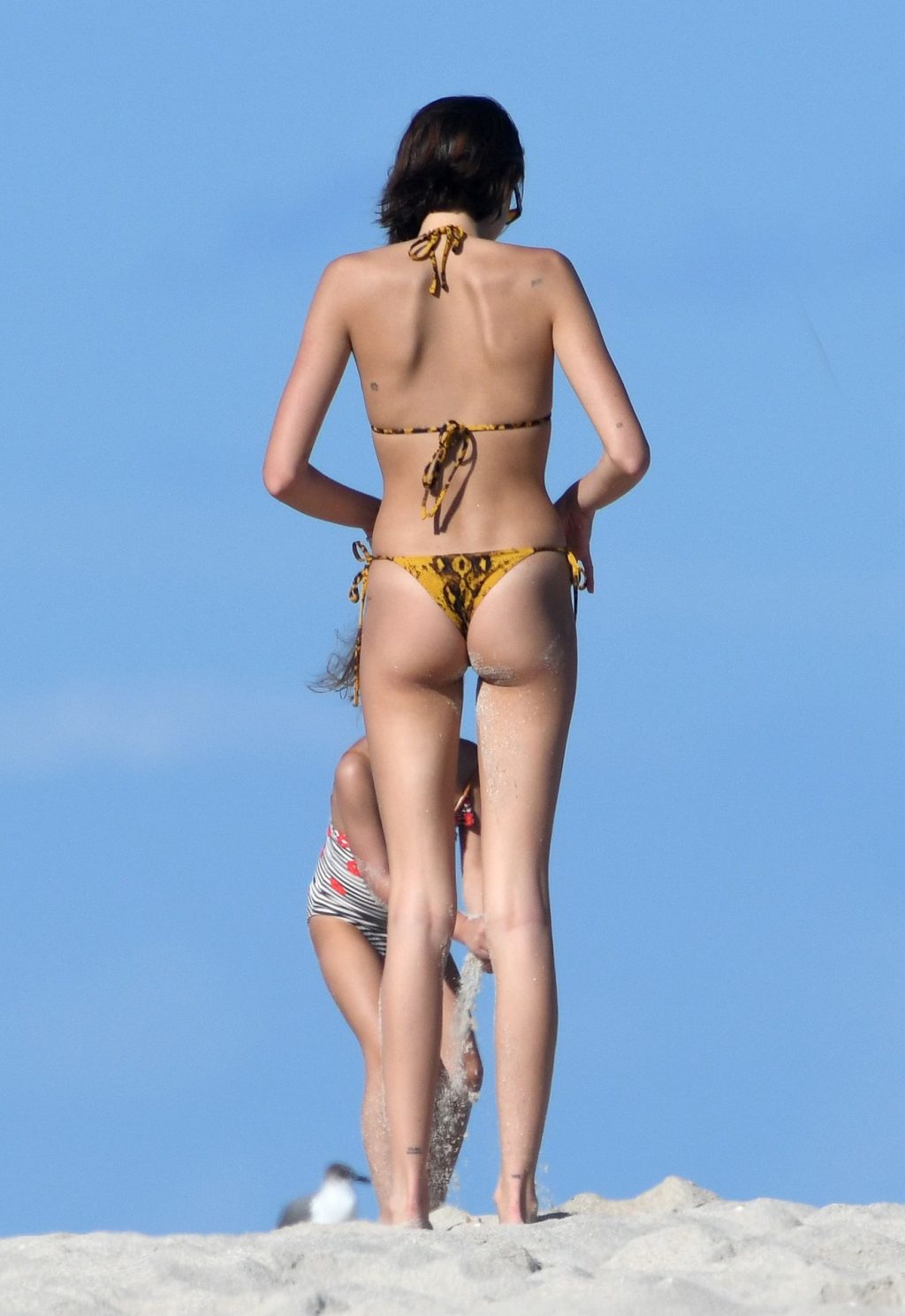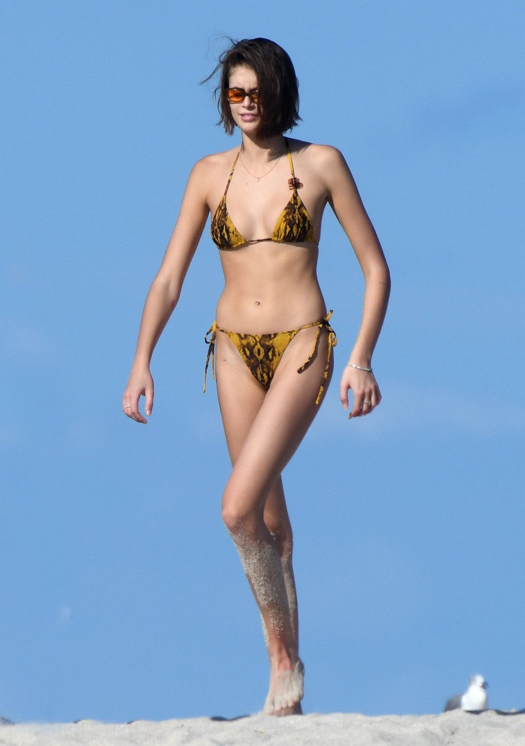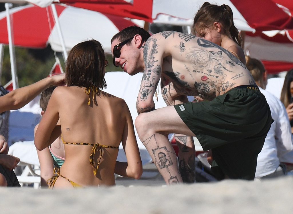 Model Kaia Gerber usa um biquíni minúsculo amarelo e preto com estampa de pele de cobra enquanto recebe um beijo do namorado fortemente tatuado Pete Davidson na praia em Miami, 22/11/2019.
