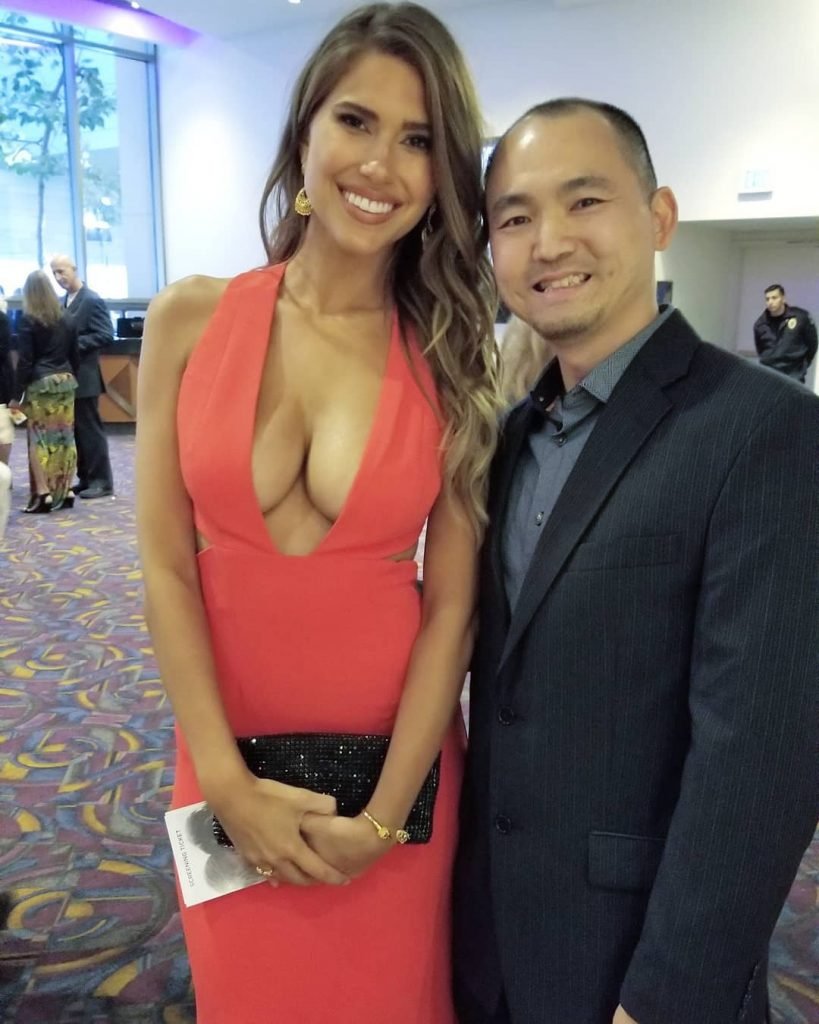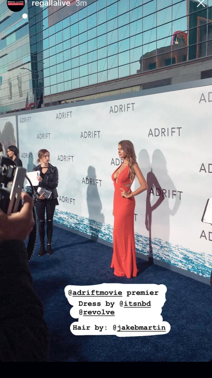 Kara Del Toro exibiu seu super decote na estreia de Adrift em Los Angeles, 23/05/2018. A modelo usou um vestido vibrante, destacando seus seios perfeitos.