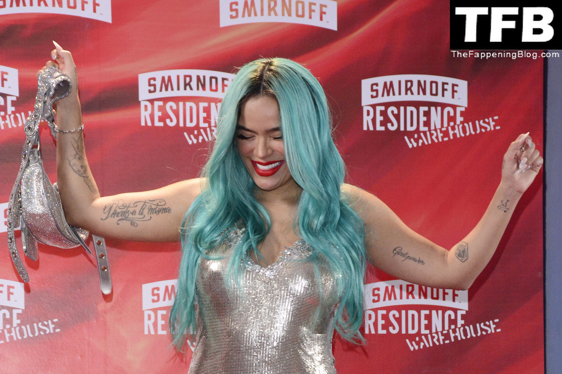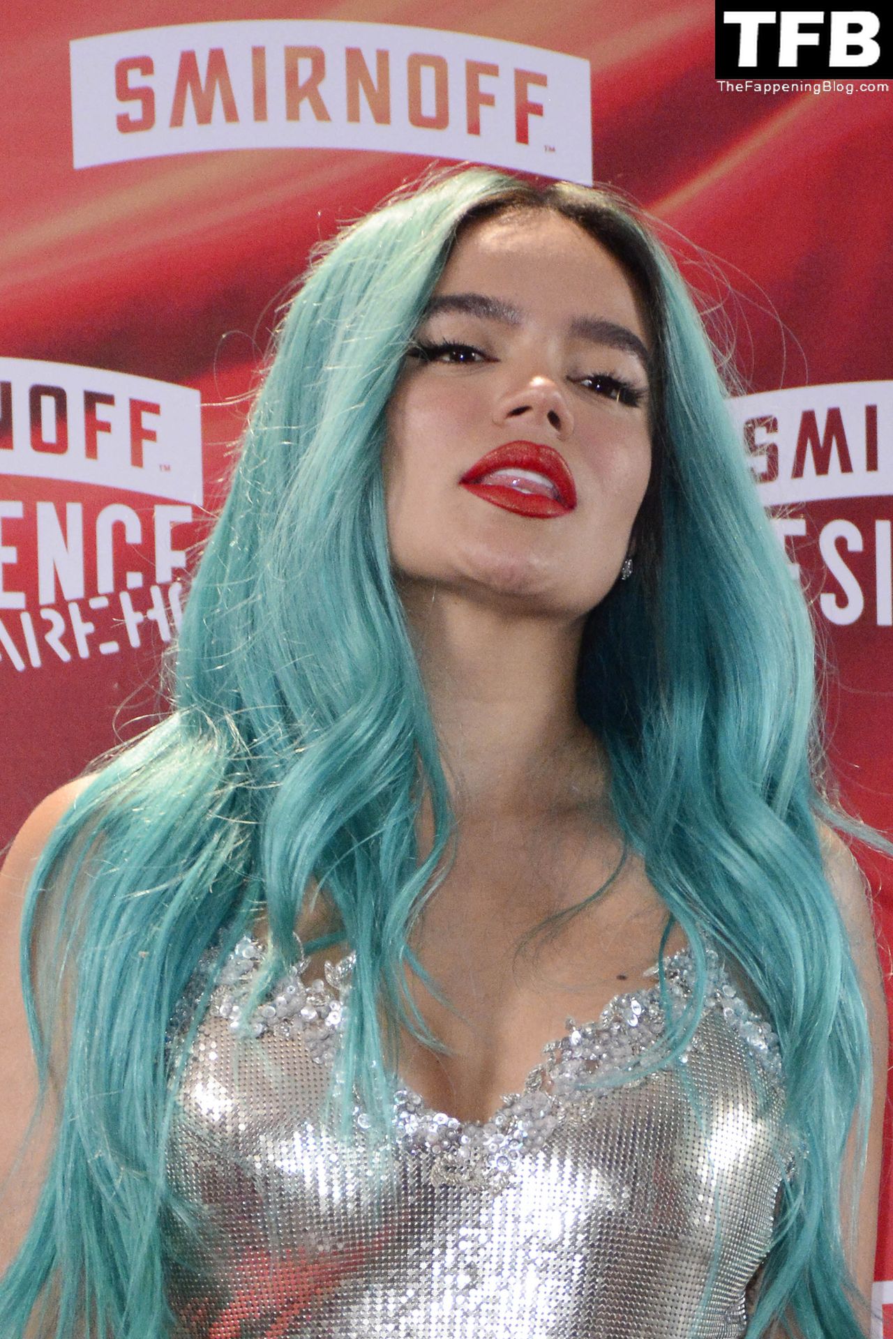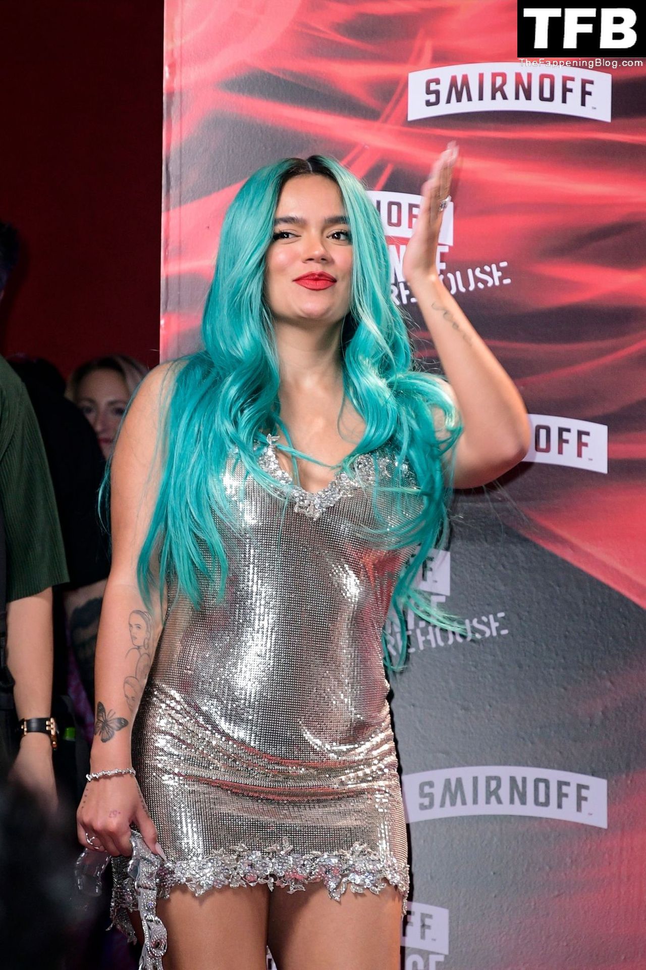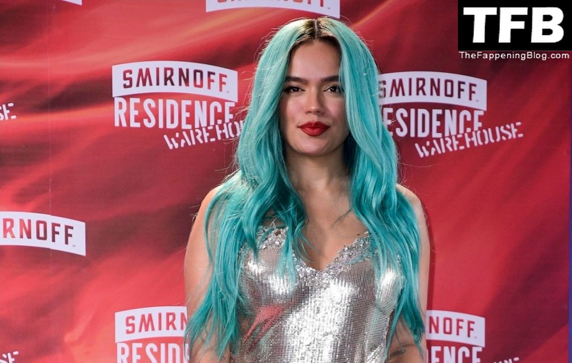 Cantora Karol G se apresenta com um vestido prateado no The Smirnoff Residence Warehouse na Cidade do México, 10/06/2022.