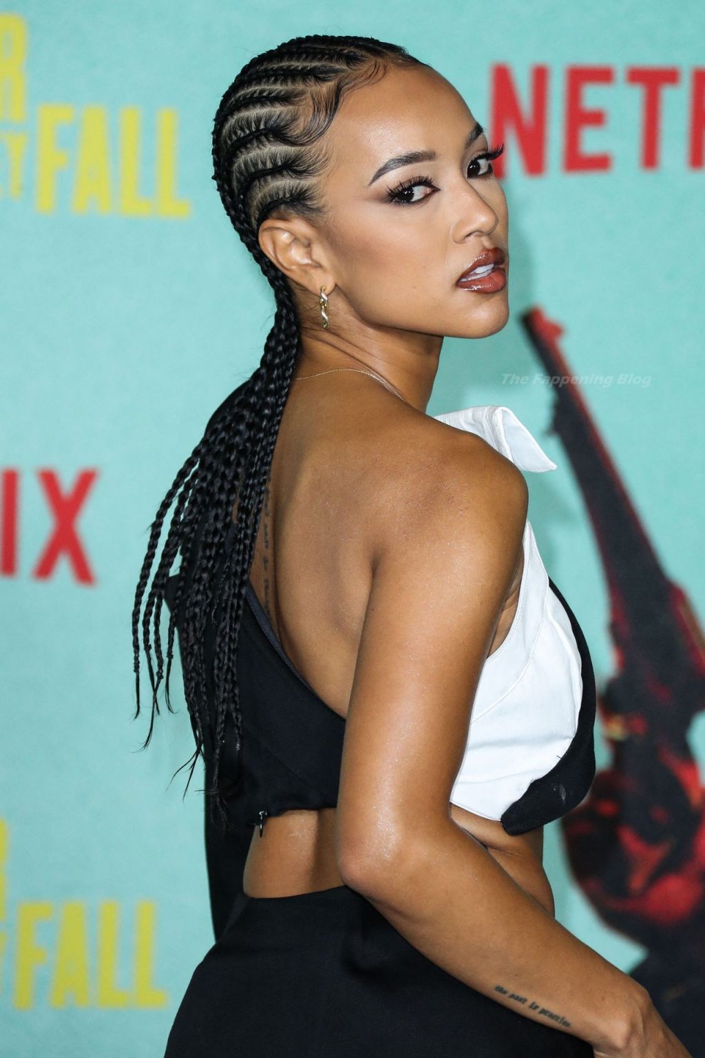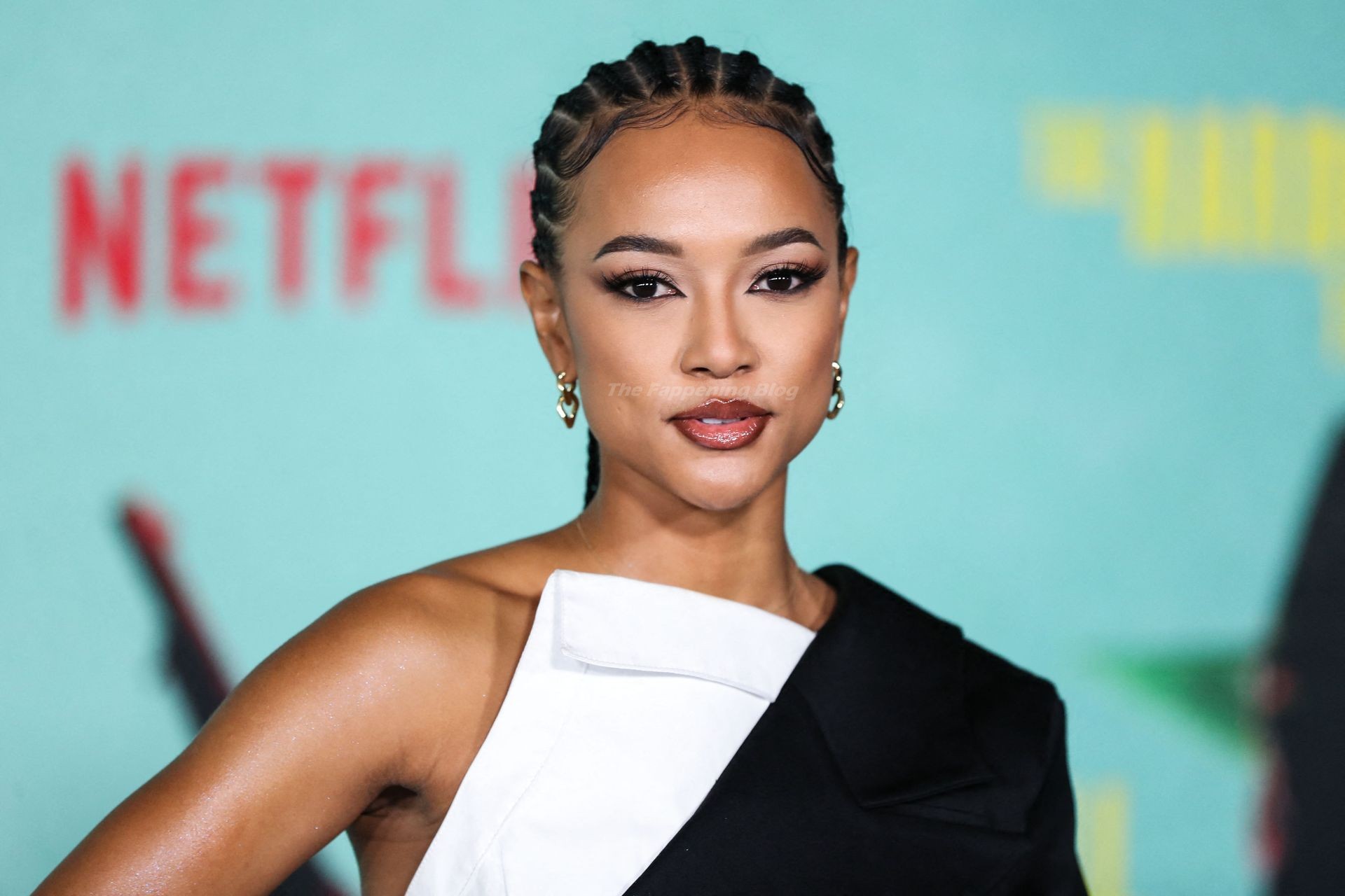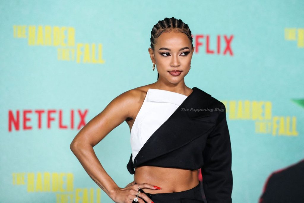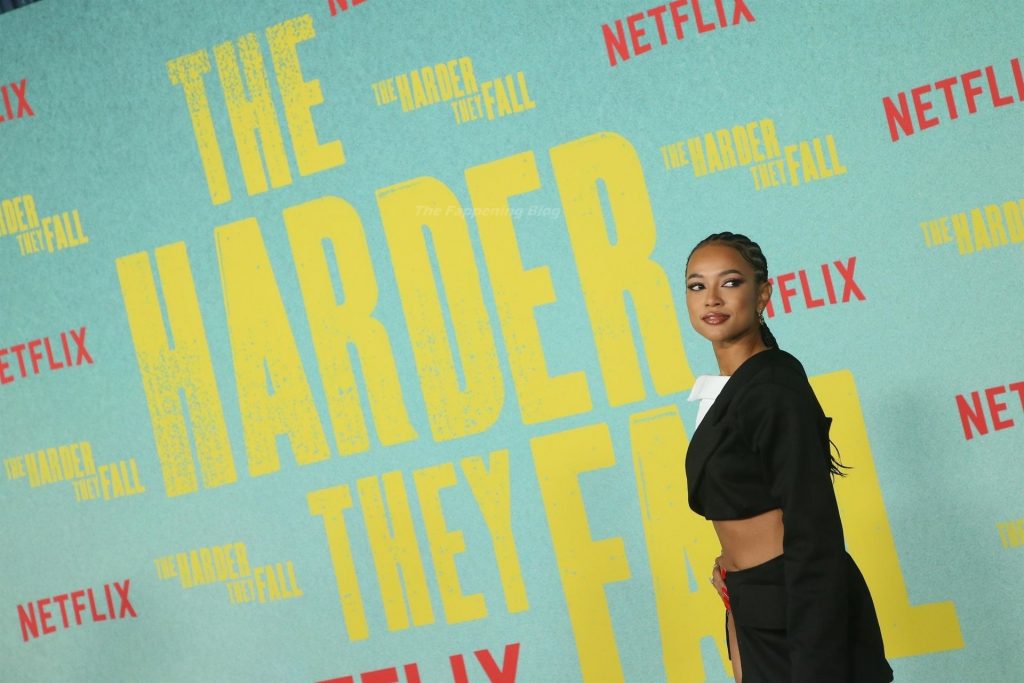 Atriz Karrueche Tran está deslumbrante enquanto posa no tapete vermelho da estreia em Los Angeles de “The Harder They Fall” no Shrine Auditorium and Expo Hall, 13/10/2021.