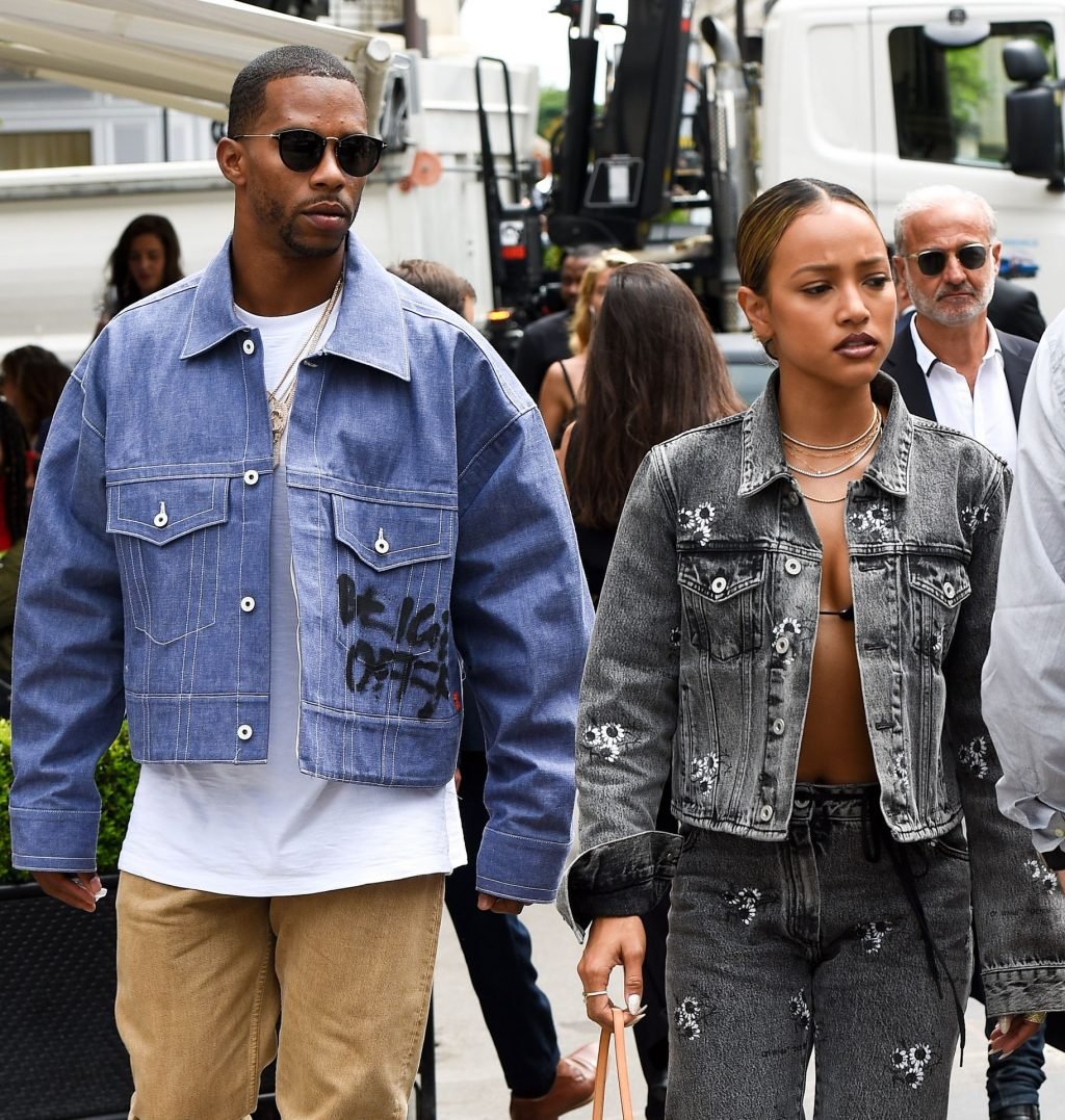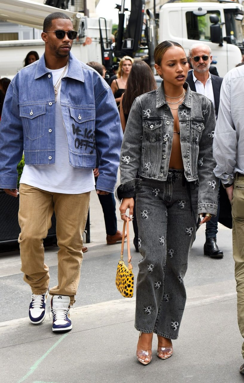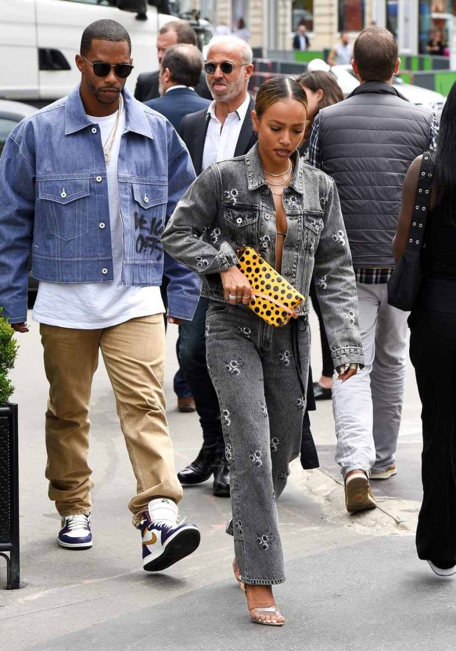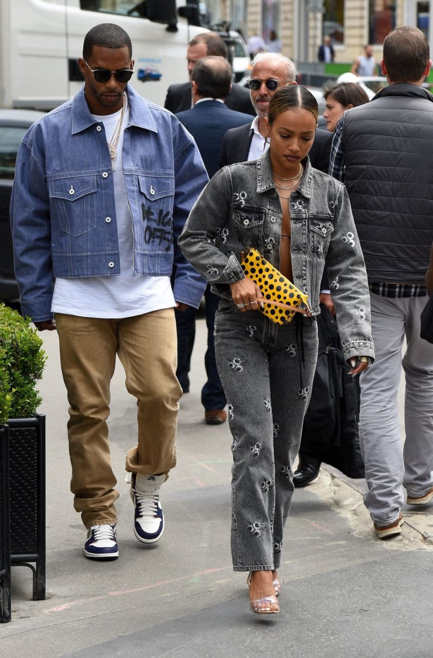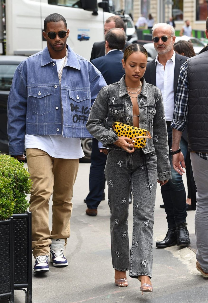 Karrueche Tran e Victor Cruz são vistos jantando no restaurante L’Avenue em Paris com Rudy Gay, 19/06/2019. Karrueche foi vista com um top de biquíni minúsculo e uma jaqueta jeans.