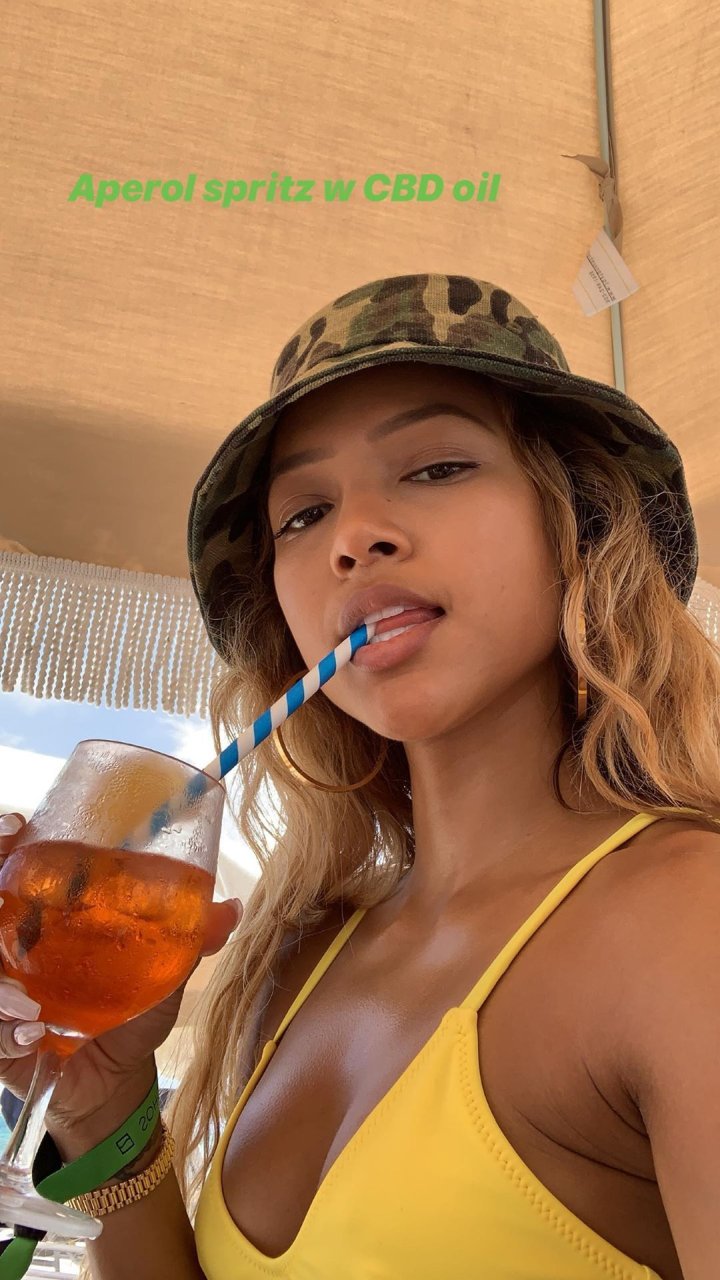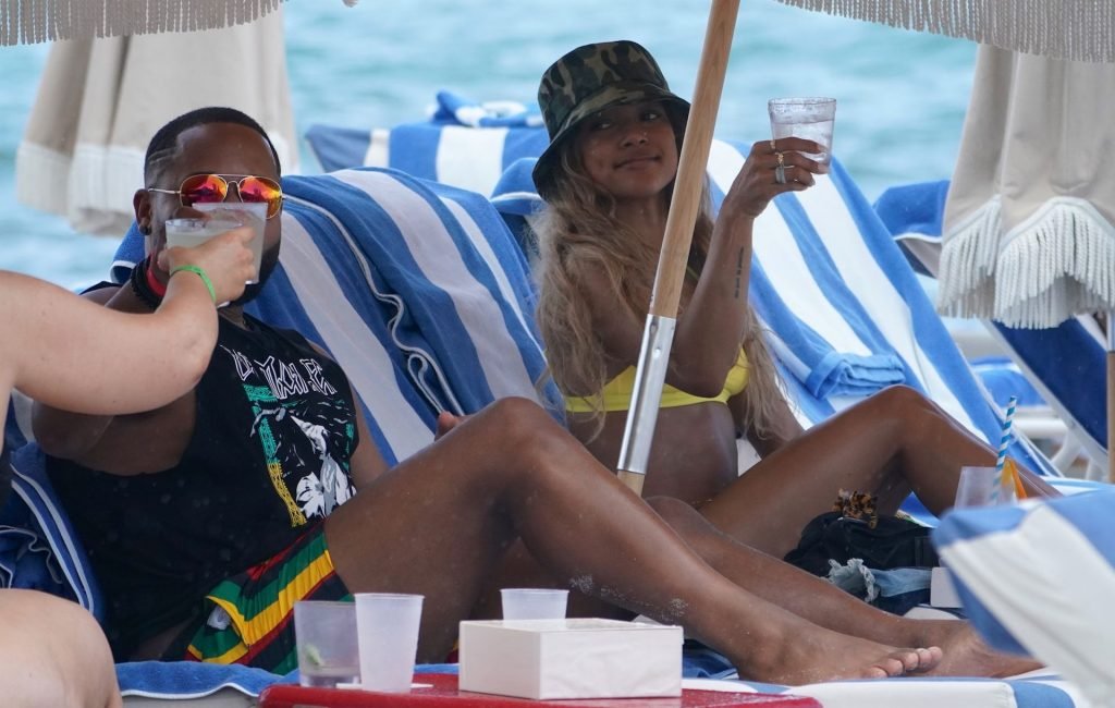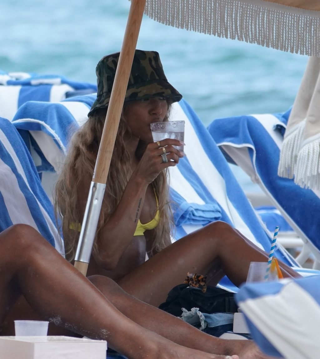 Karrueche Tran toma bebidas na praia com amigos em Miami Beach, 10/05/2019. Karrueche usava um top de biquíni amarelo com calcinha fio dental combinando e um chapéu bucket camuflado.
