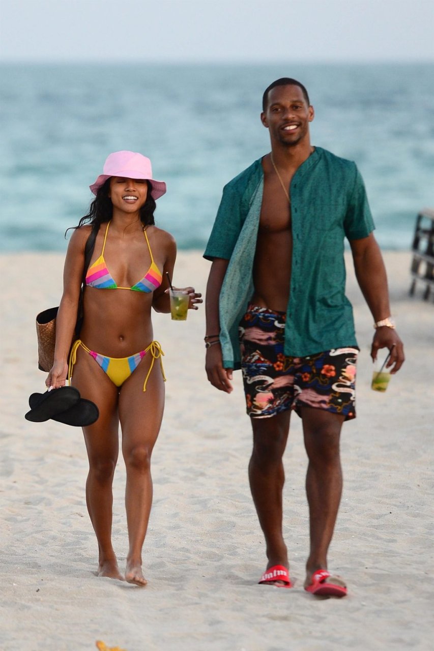 Karrueche Tran foi fotografada saindo da praia em Miami com seu namorado, 01/04/2019. A modelo e atriz americana de 30 anos aproveitou suas férias e a massagem nas pernas.