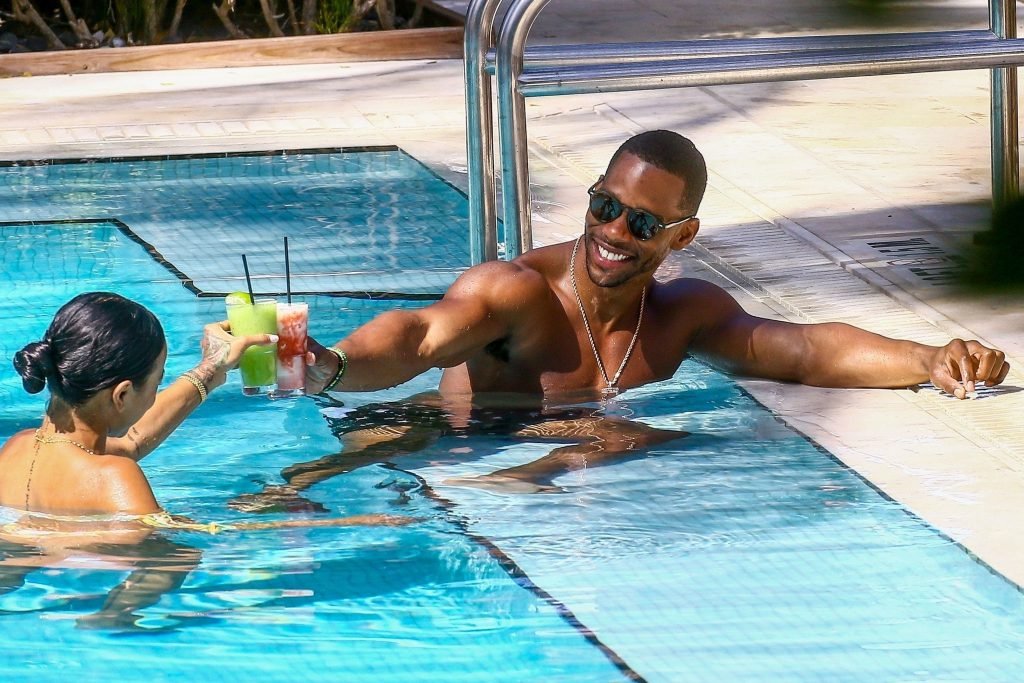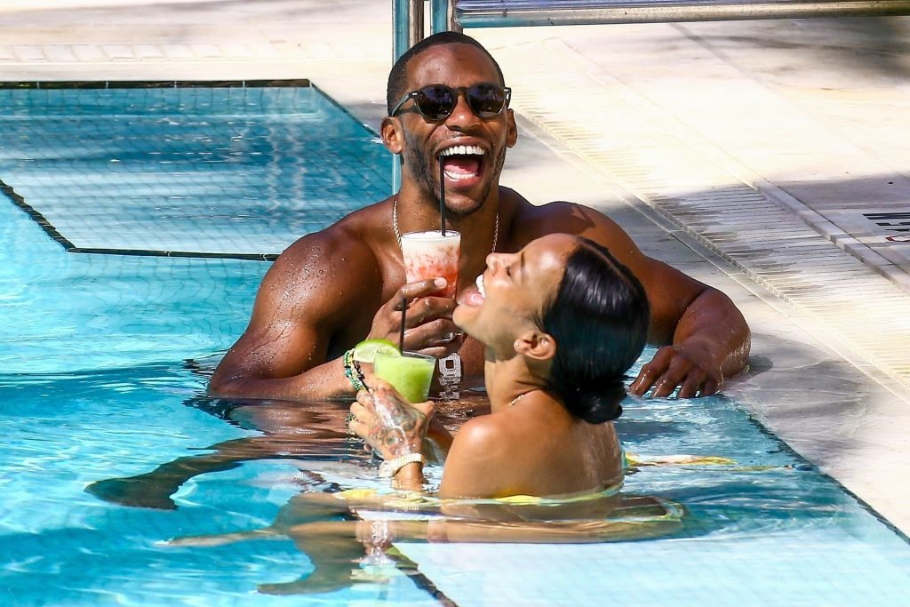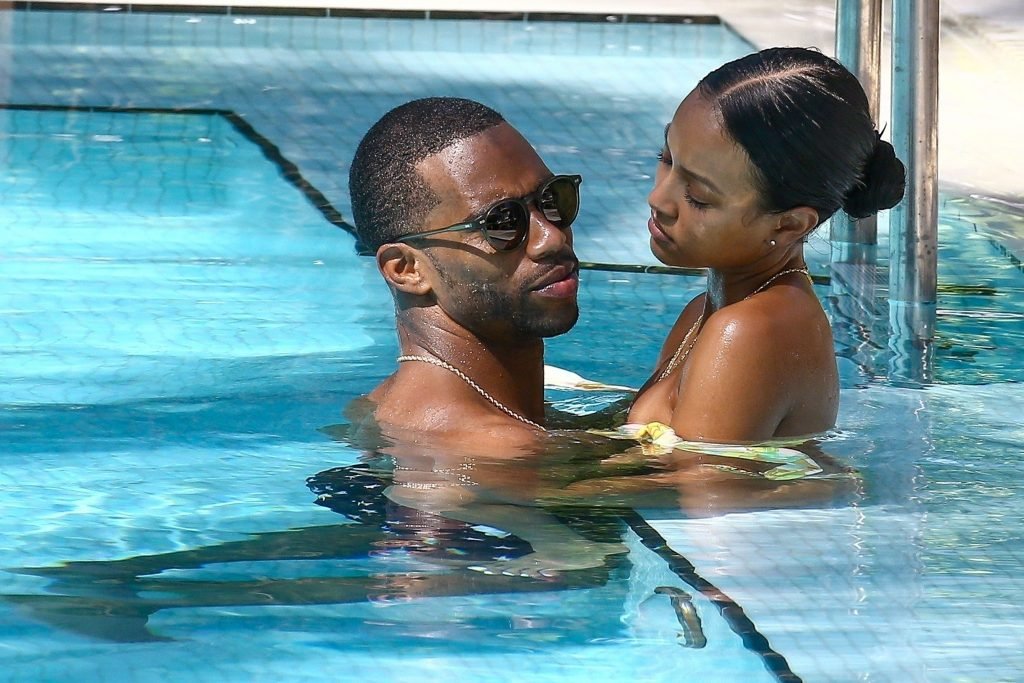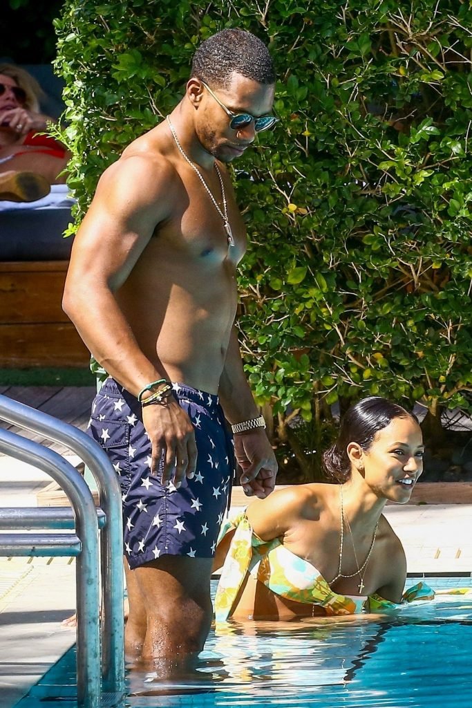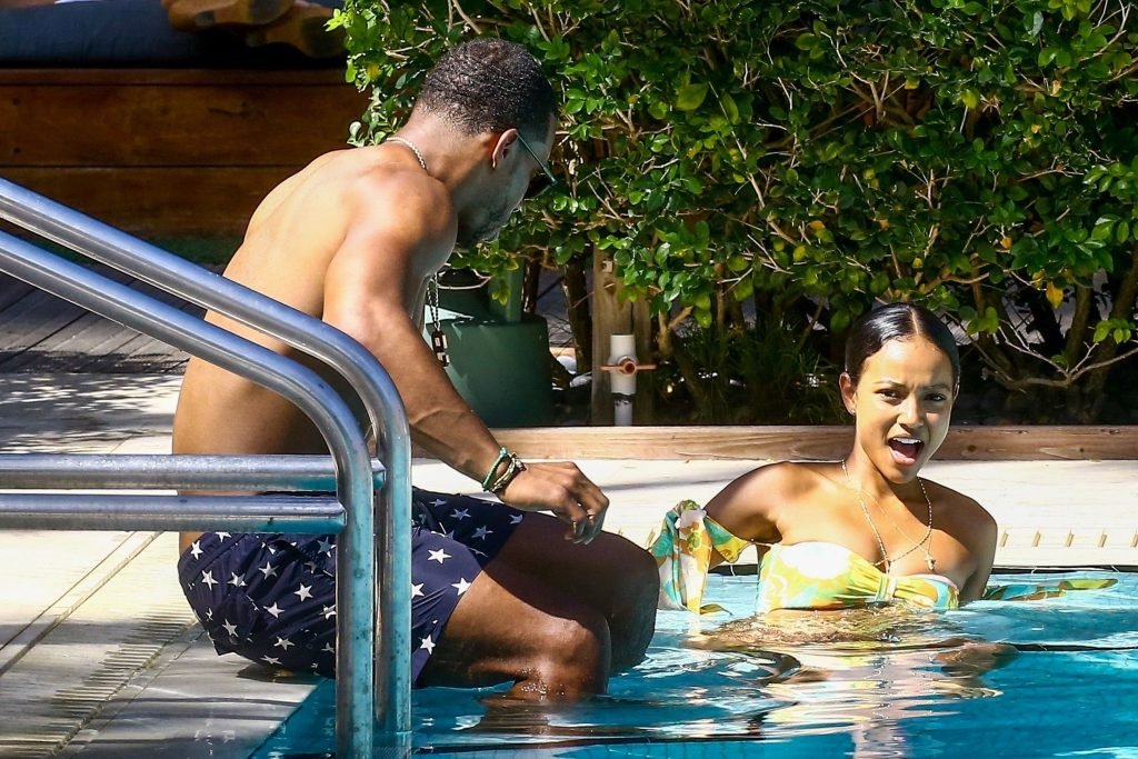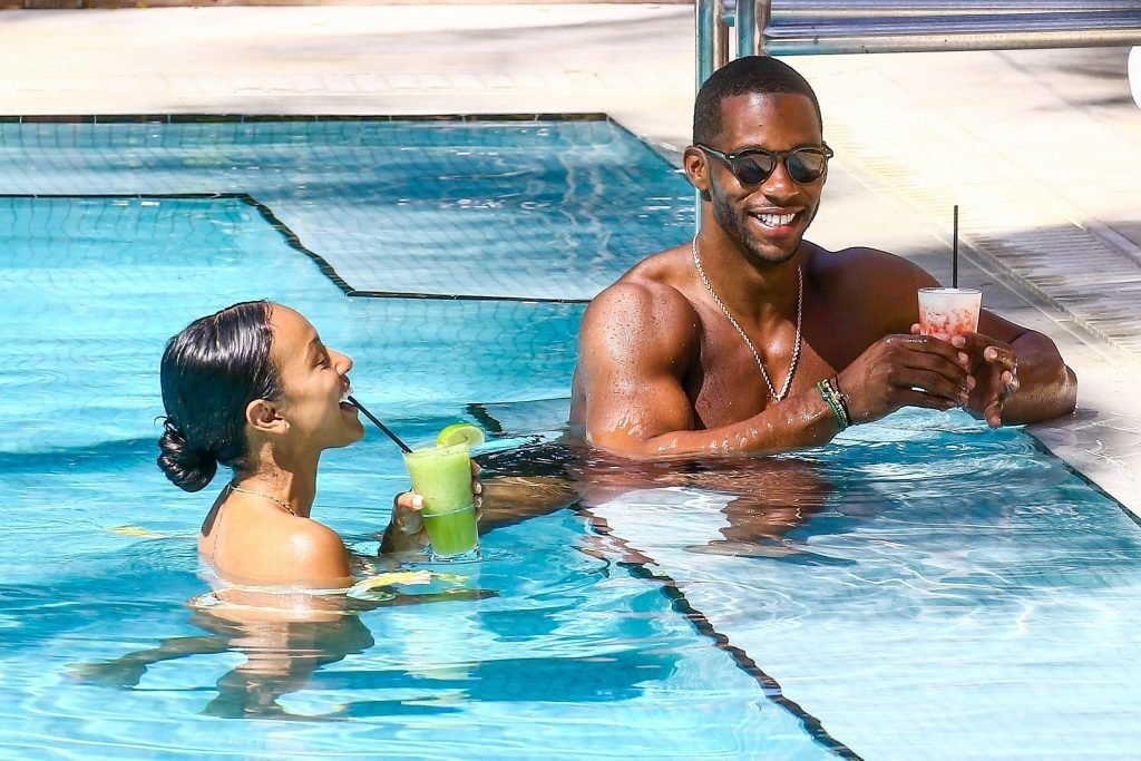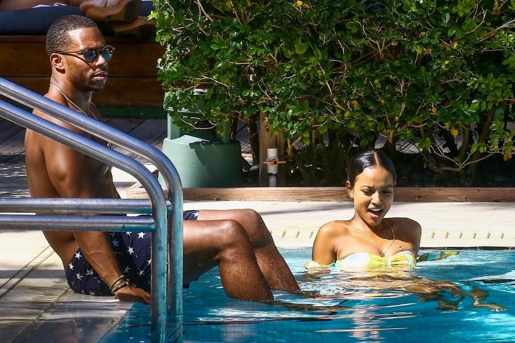 Karrueche Tran e o jogador de futebol americano Victor Cruz aproveitam um dia juntos na piscina em Miami, 13/04/2018. A morena quente exibiu seu bumbum no hotel. Karrueche Tran é modelo, designer, atriz de TV e cinema (Claws (2017), Only for One Night (2016)). Idade – 29 anos.