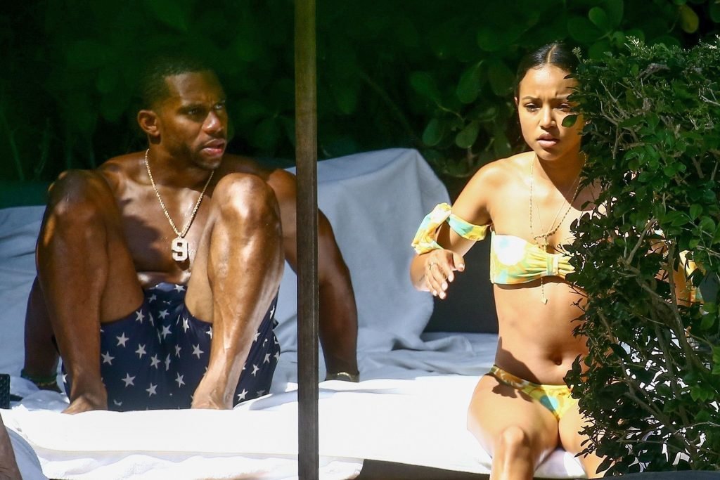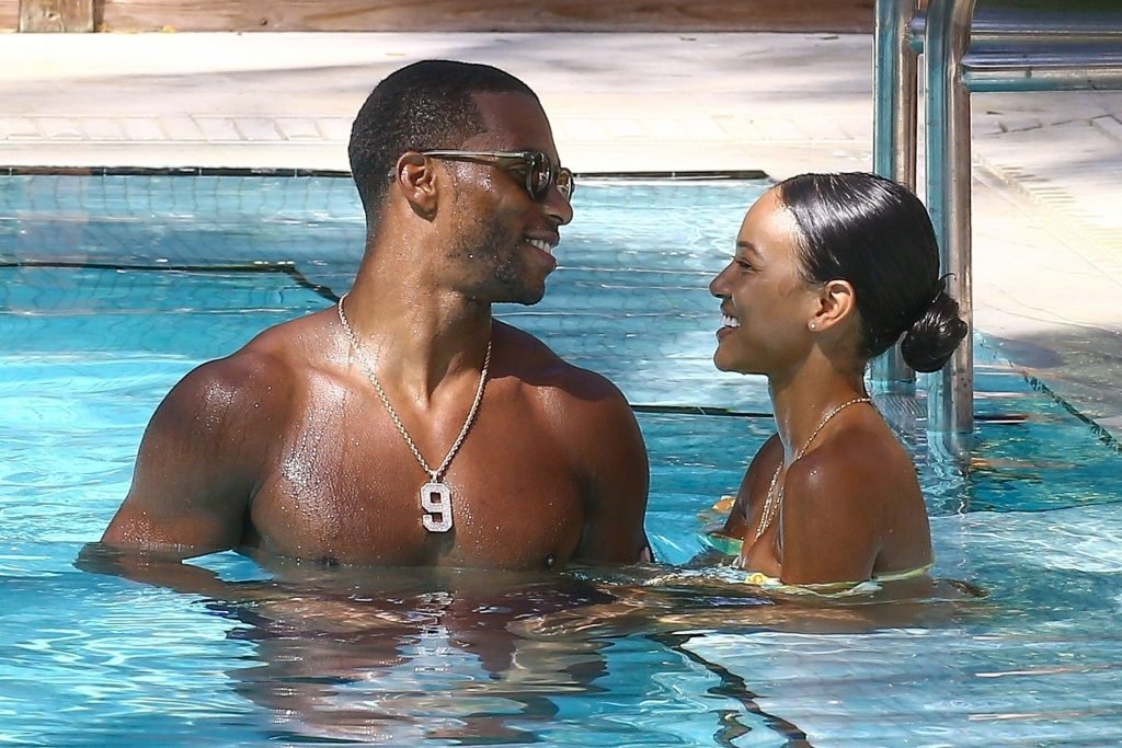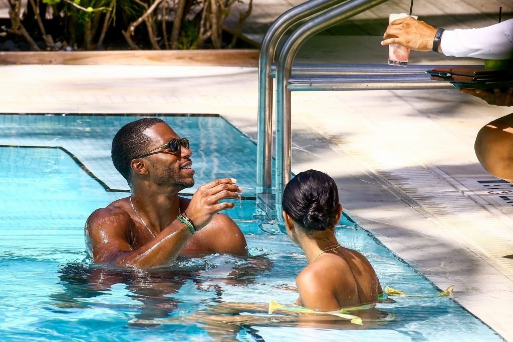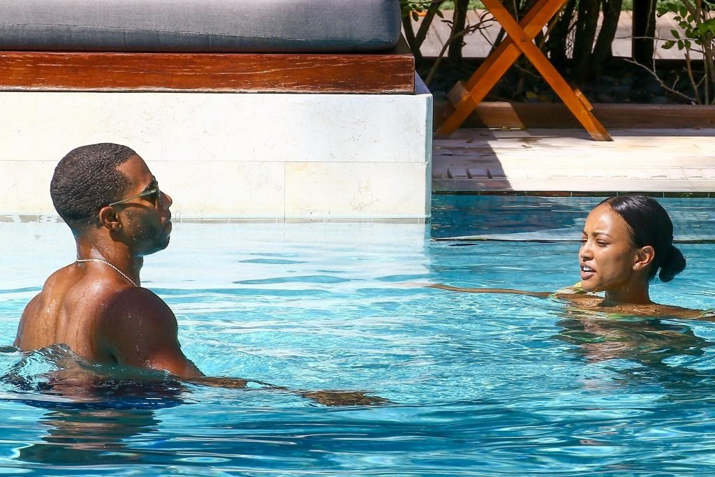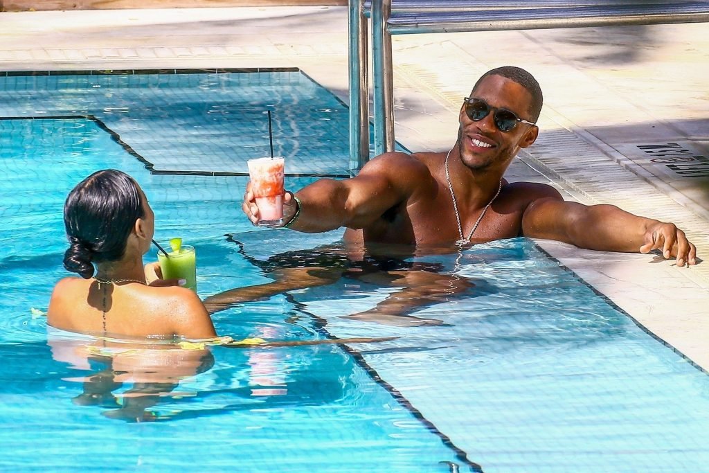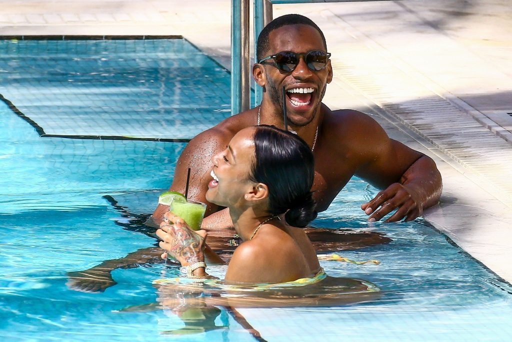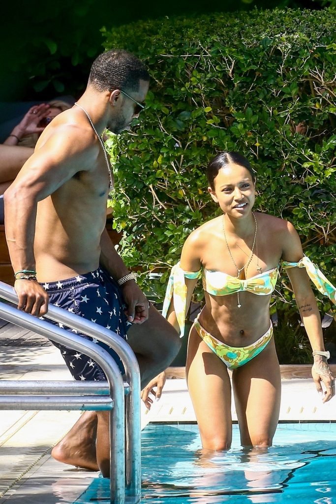 Karrueche Tran e o jogador de futebol americano Victor Cruz aproveitam um dia juntos na piscina em Miami, 13/04/2018. A morena quente exibiu seu bumbum no hotel. Karrueche Tran é modelo, designer, atriz de TV e cinema (Claws (2017), Only for One Night (2016)). Idade – 29 anos.