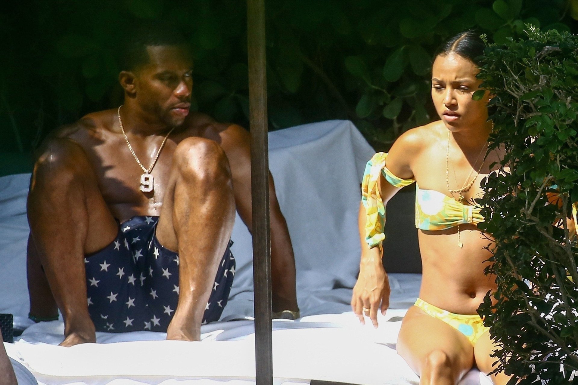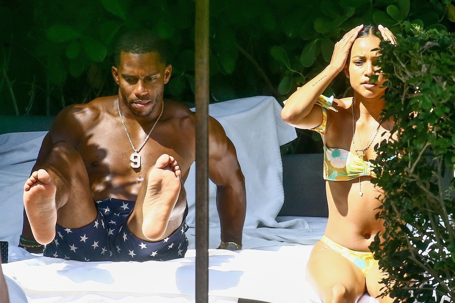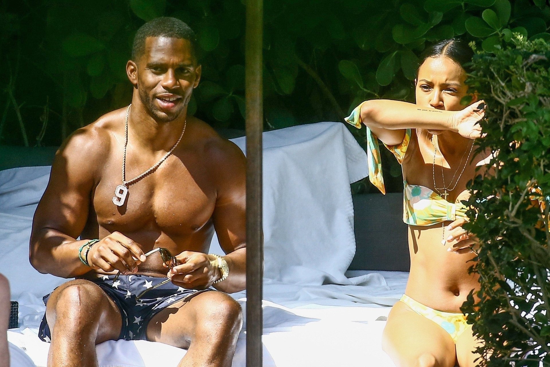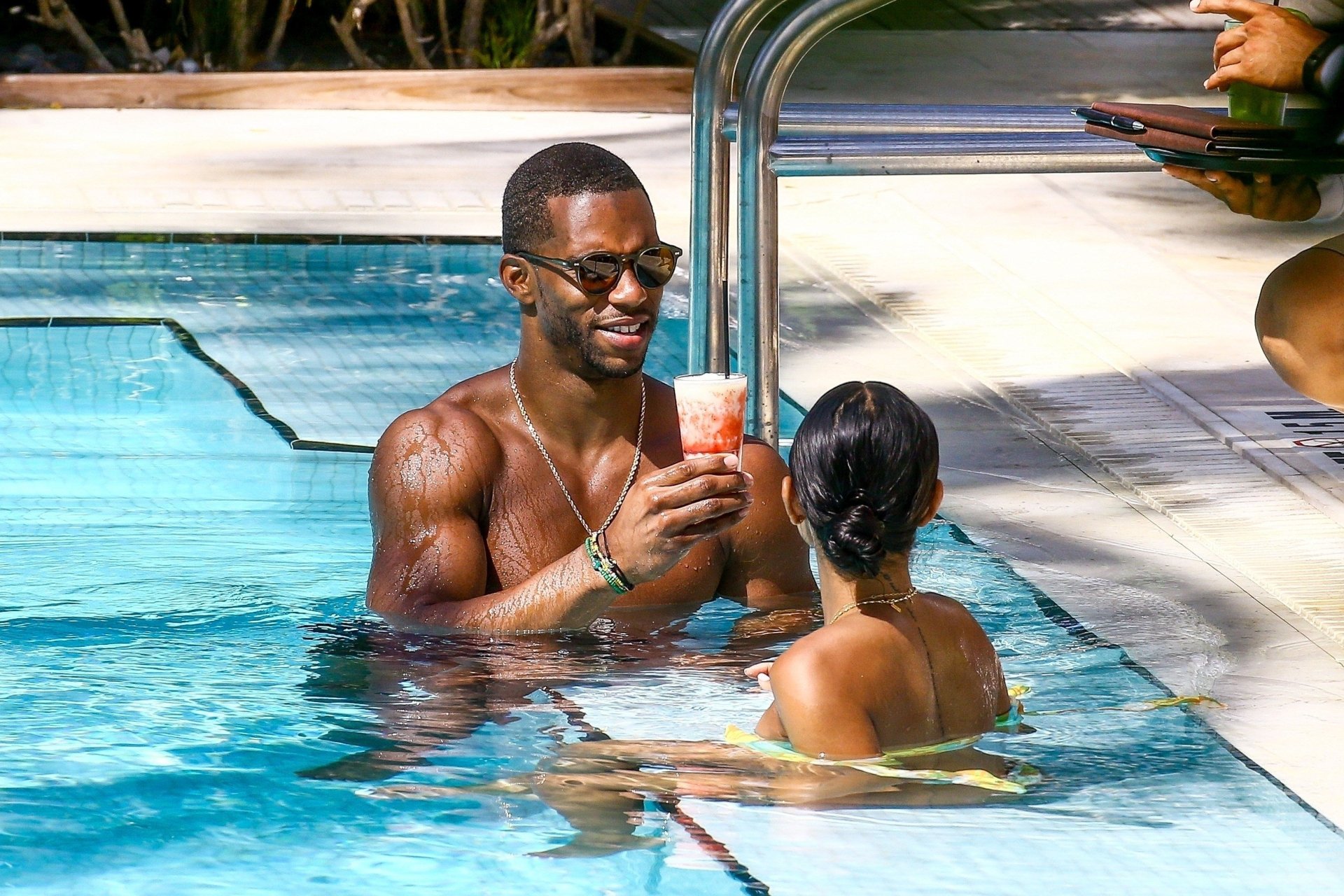 Karrueche Tran e o jogador de futebol americano Victor Cruz aproveitam um dia juntos na piscina em Miami, 13/04/2018. A morena quente exibiu seu bumbum no hotel. Karrueche Tran é modelo, designer, atriz de TV e cinema (Claws (2017), Only for One Night (2016)). Idade – 29 anos.