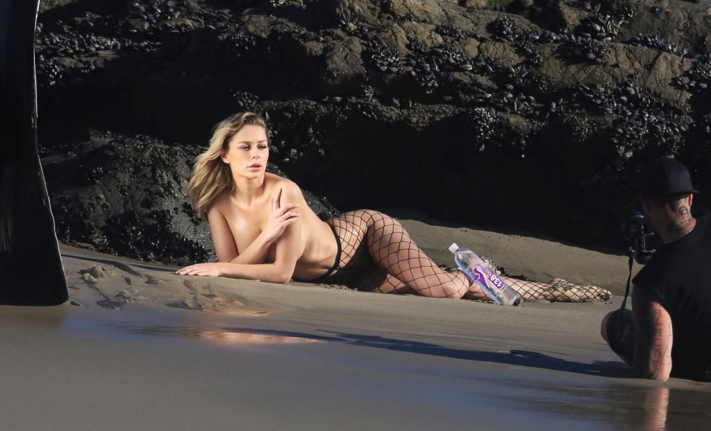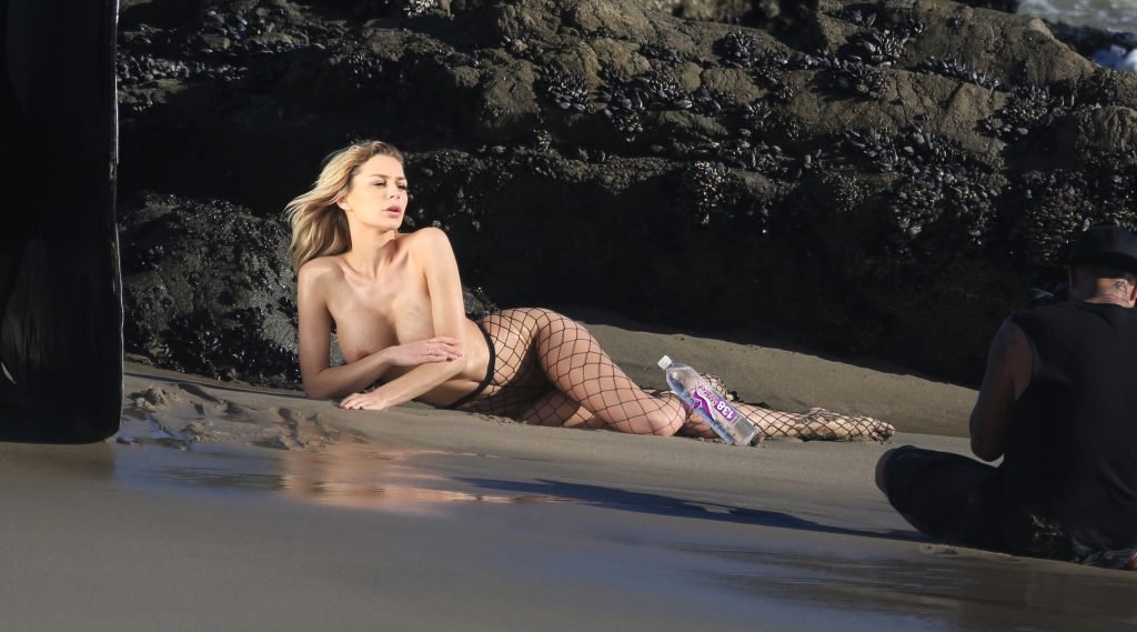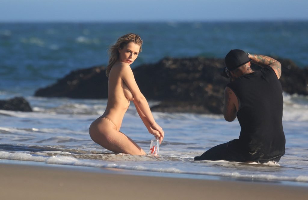 A modelo americana voluptuosa Kate Compton exibe seu corpo sexy de biquíni antes de posar topless durante um sensual ensaio fotográfico 138 Water na praia de Malibu com o fotógrafo Malachi Banales, 17/07/2017.