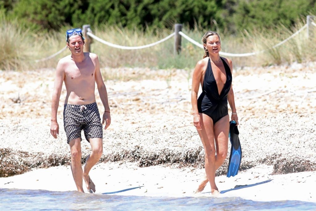 A modelo britânica Kate Moss está absolutamente espetacular enquanto exibe seu corpo quente de biquíni em um maiô preto de gola halter durante suas férias na Espanha, em Formentera, com seu parceiro Nikolai von Bismarck e a filha Lila Grace, 08/09/2020.