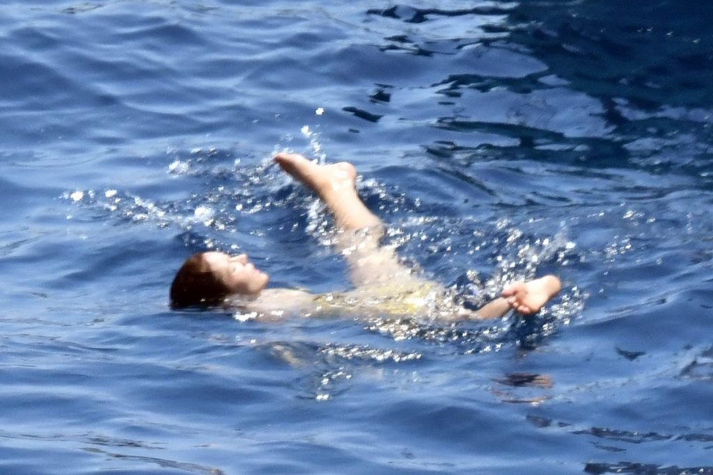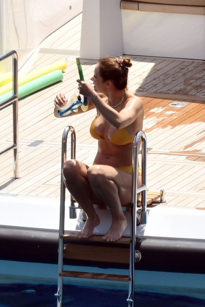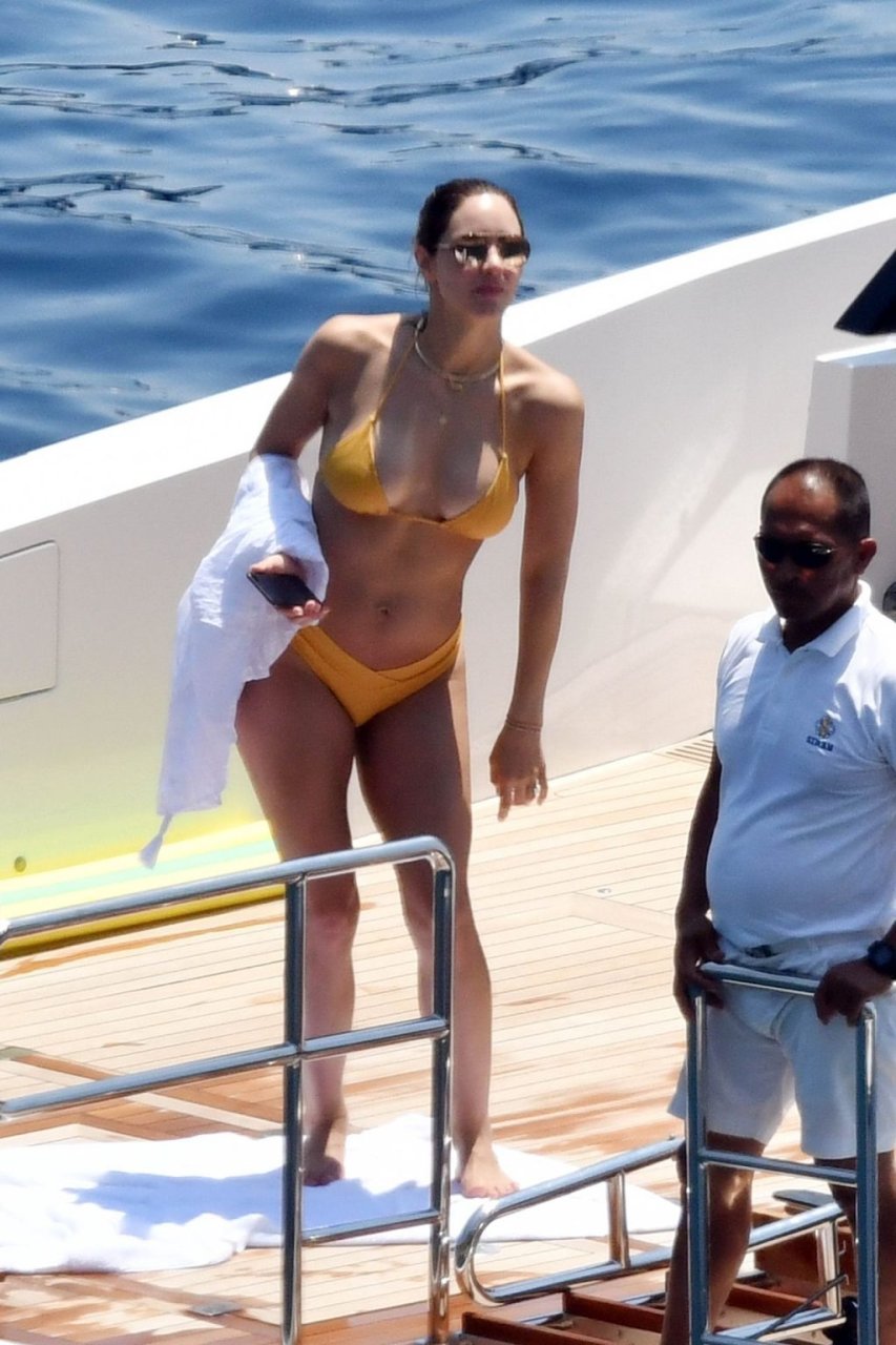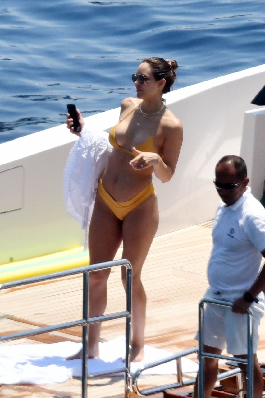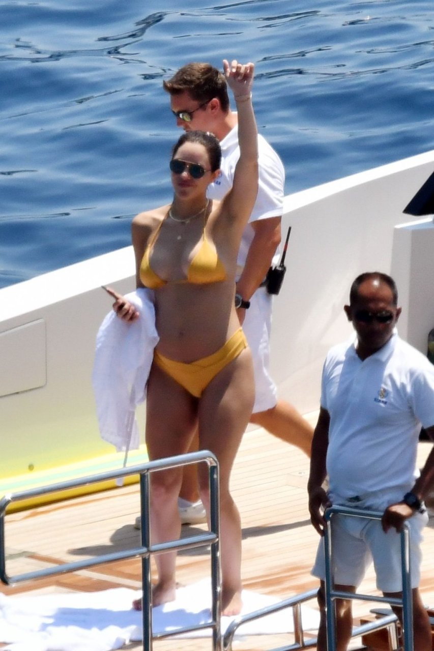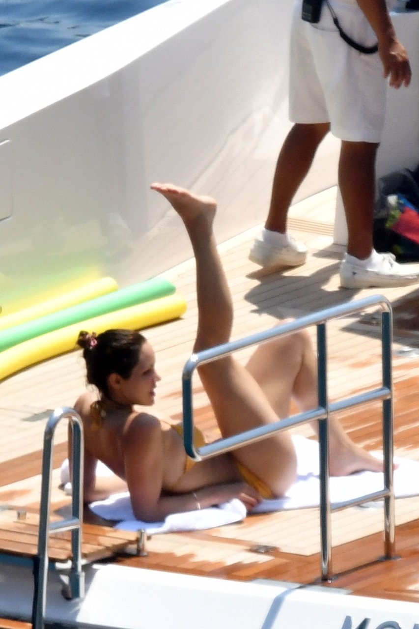 Katharine McPhee recém-casada dá um mergulho no oceano enquanto relaxa em um iate durante sua lua de mel em Capri, 05/07/2019. McPhee exibiu suas curvas em um pequeno biquíni amarelo.