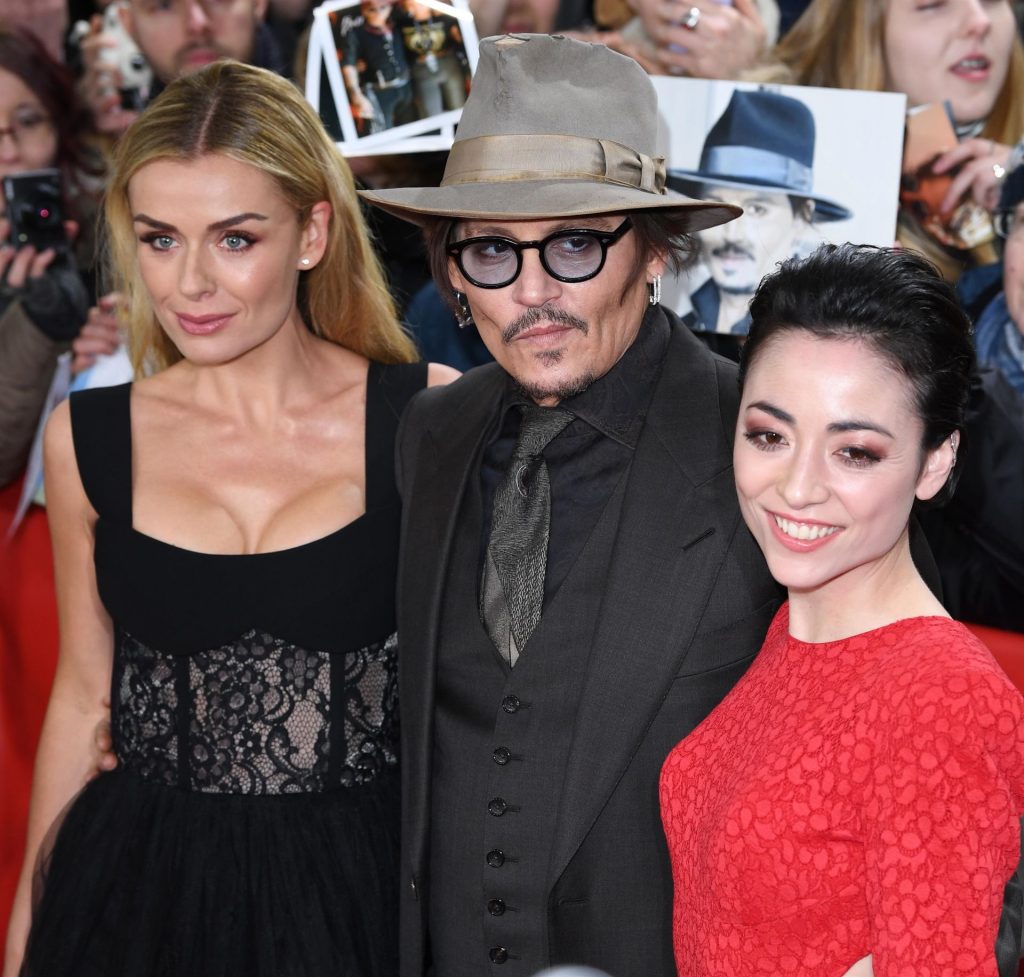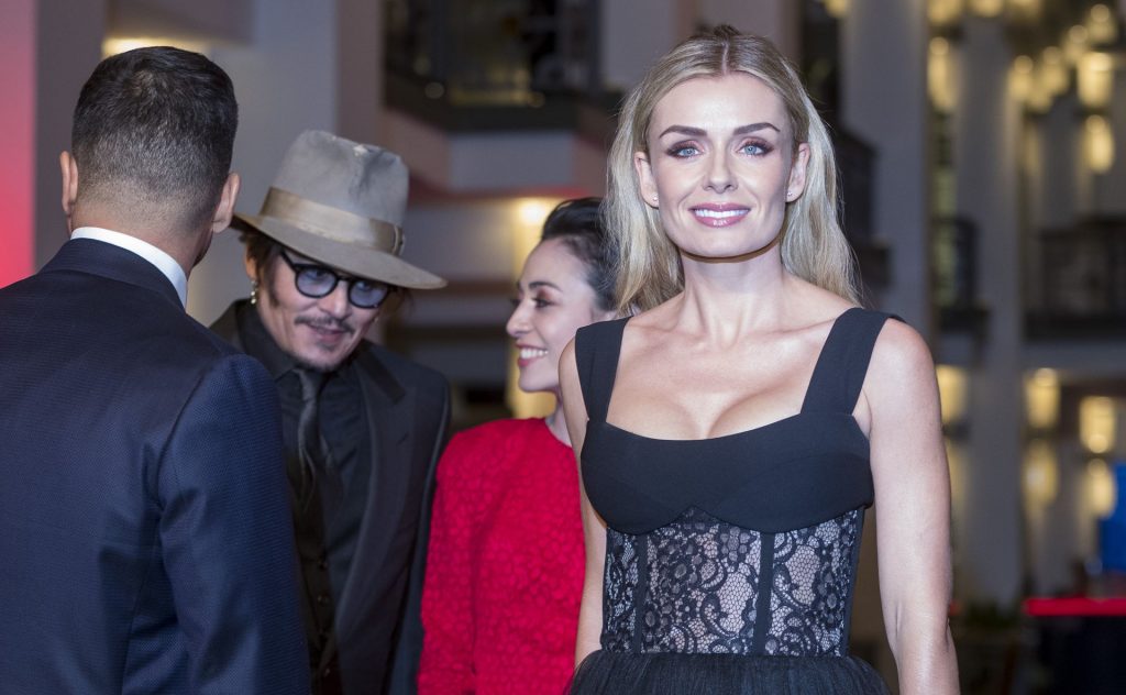 O ator americano Johnny Depp posa com a atriz Katherine Jenkins, o ator japonês Hiroyuki Sanada, o diretor americano Andrew Levitas, a atriz japonesa Minami e o ator britânico Bill Nighy no tapete vermelho para a estreia do filme “Minamata” exibido na Berlinale Special Gala em 21 de fevereiro de 2020 no 70º festival de cinema de Berlim.