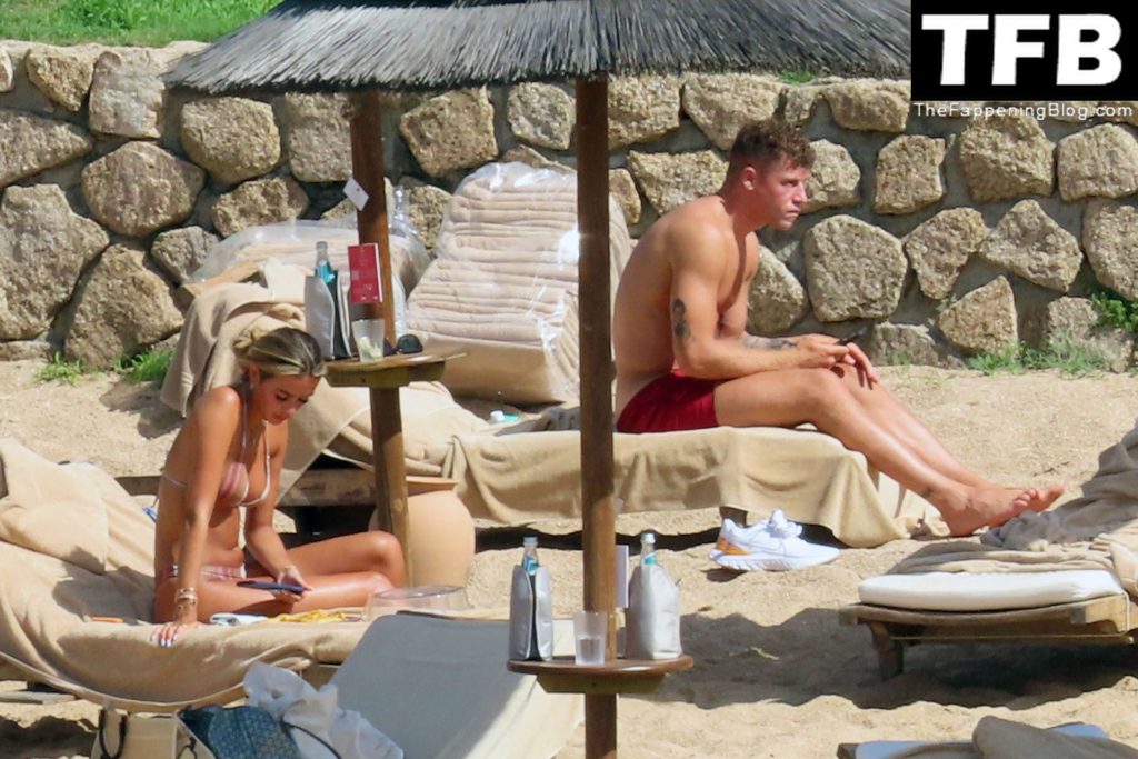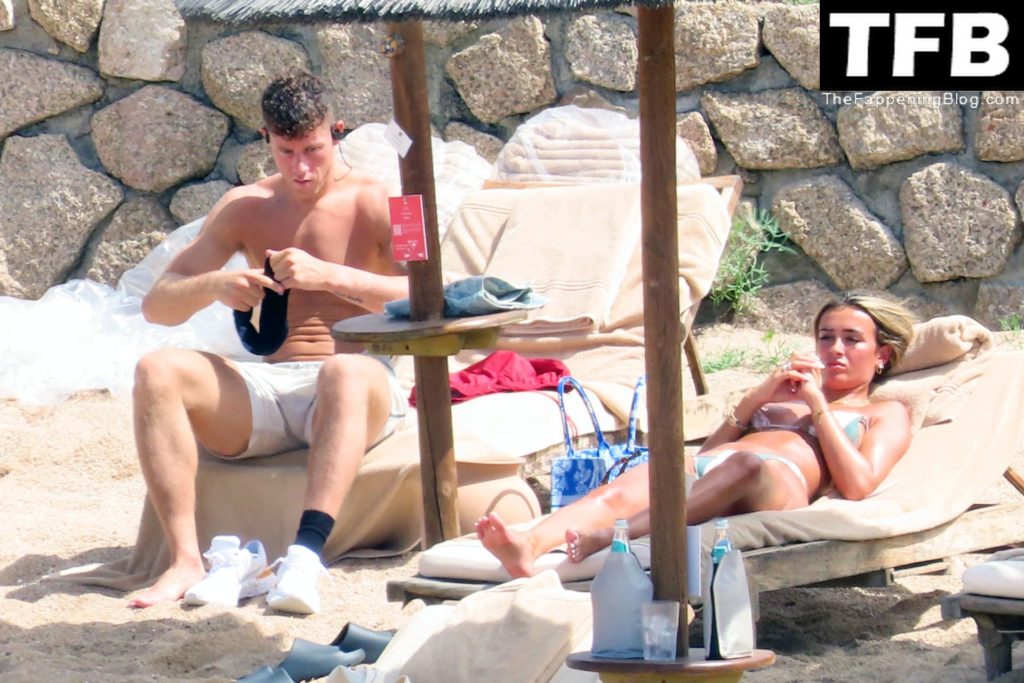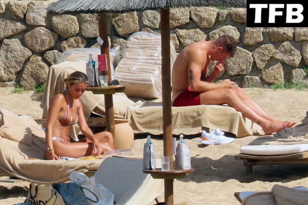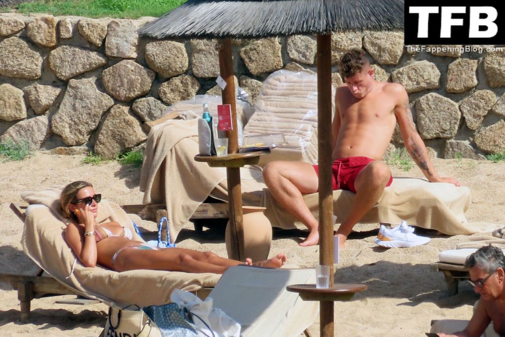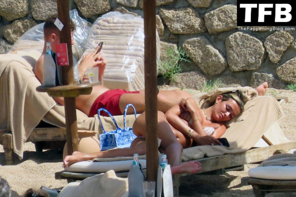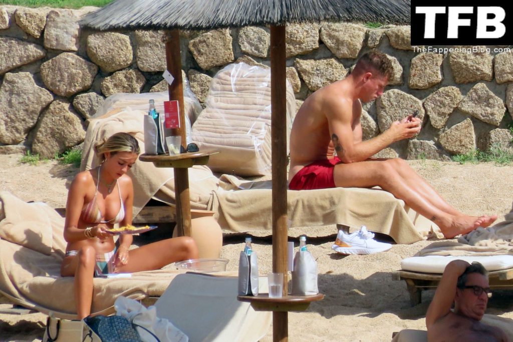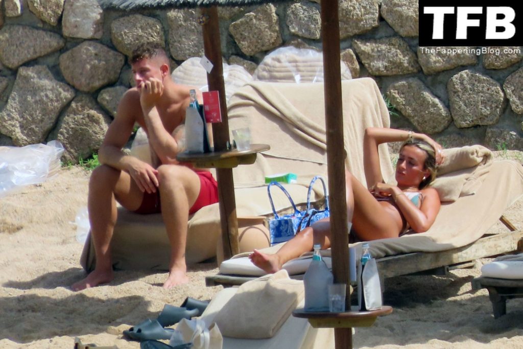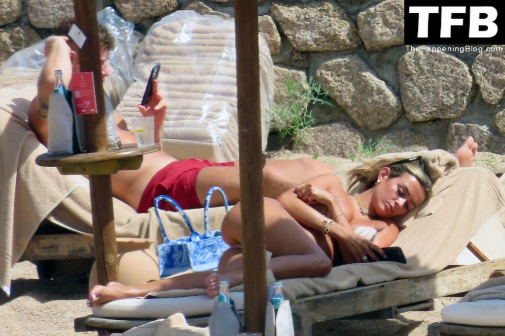 Ross Barkley com expressão séria e sua namorada Katherine Pilkington continuam suas férias na Itália, 28/06/2022. O casal passou o tempo navegando em seus telefones e fazendo pedidos no cardápio à beira da praia.