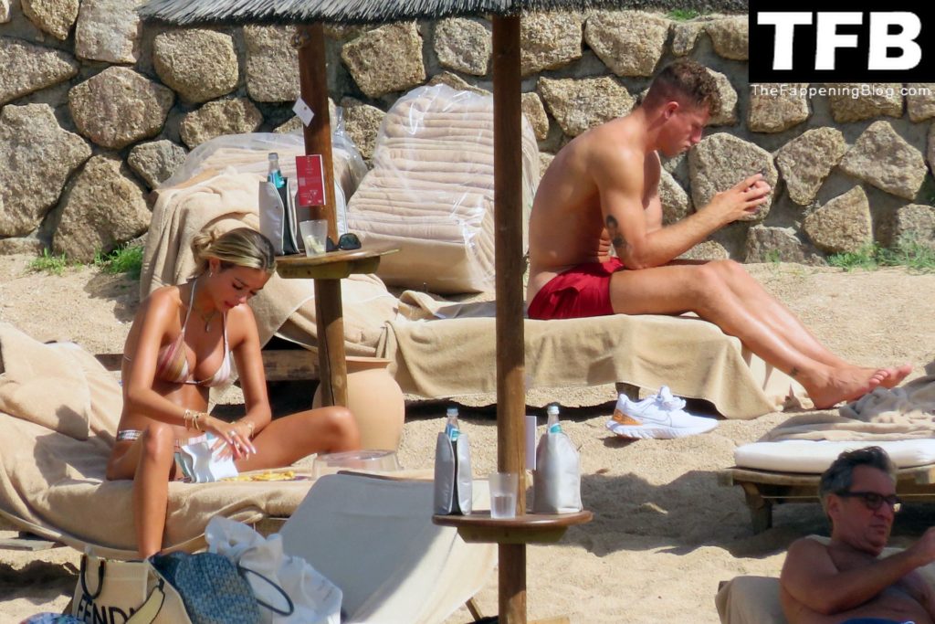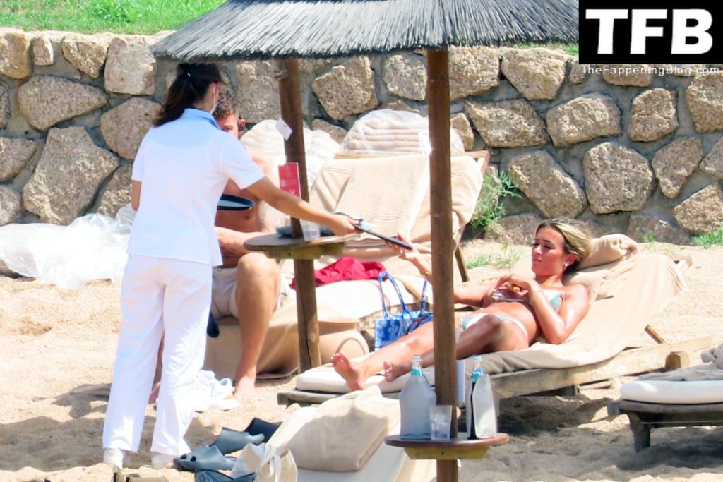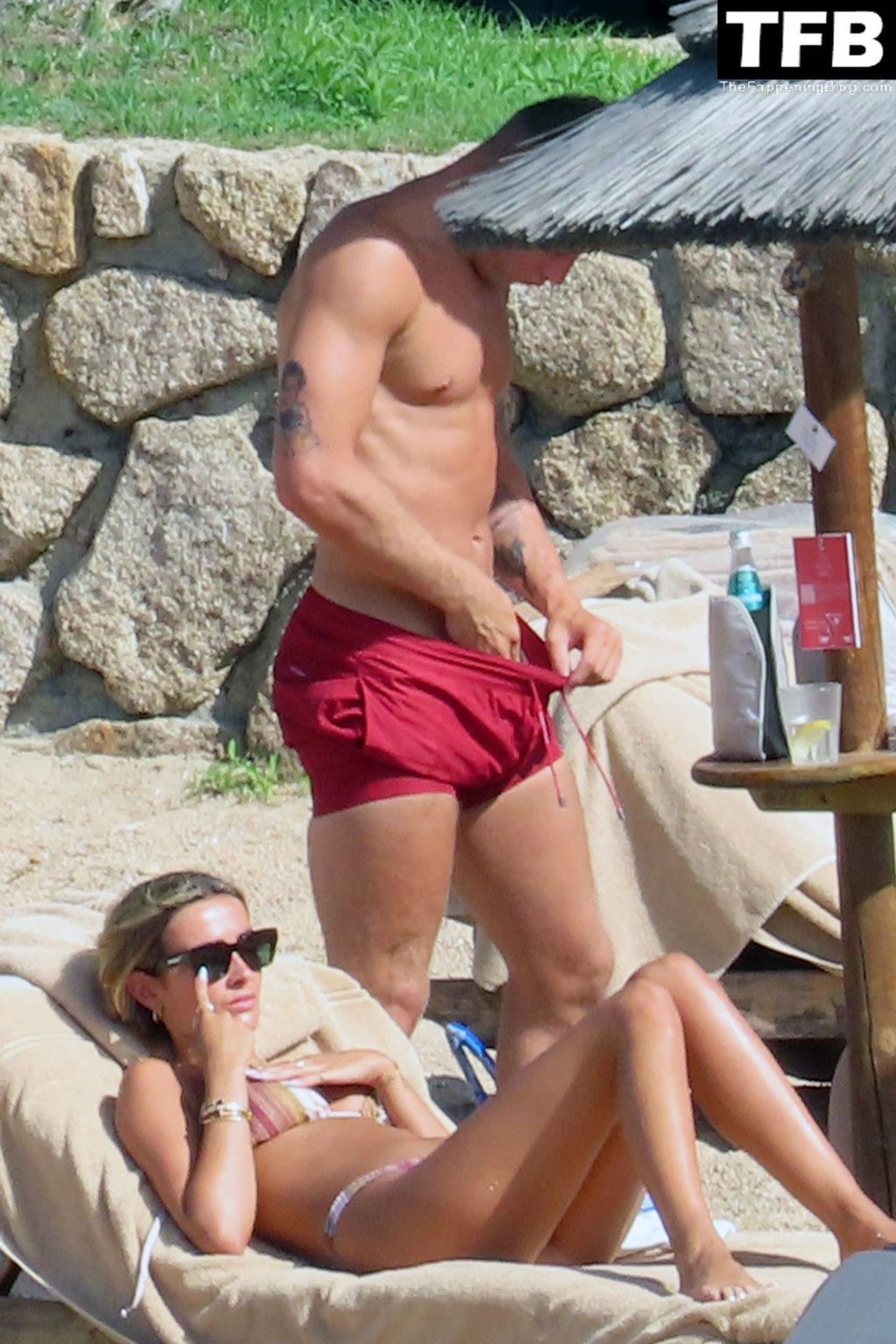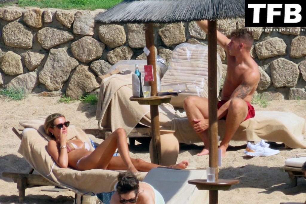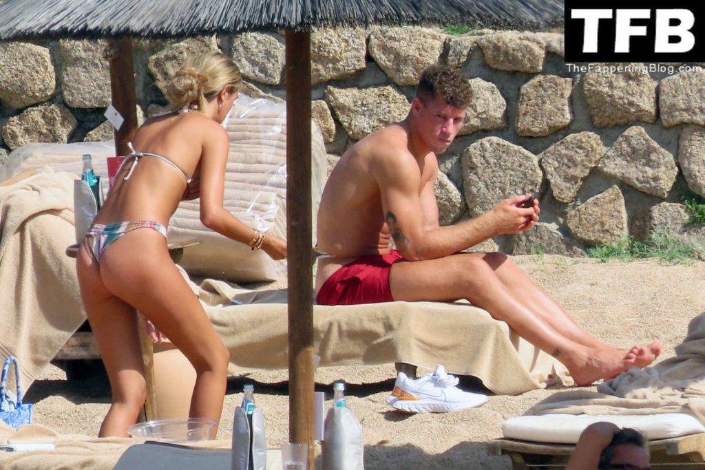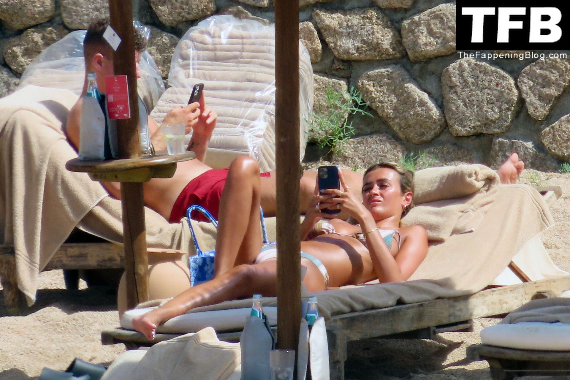 Ross Barkley com expressão séria e sua namorada Katherine Pilkington continuam suas férias na Itália, 28/06/2022. O casal passou o tempo navegando em seus telefones e fazendo pedidos no cardápio à beira da praia.