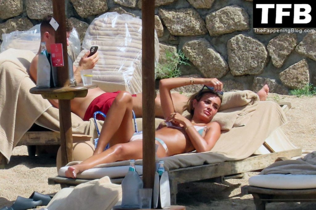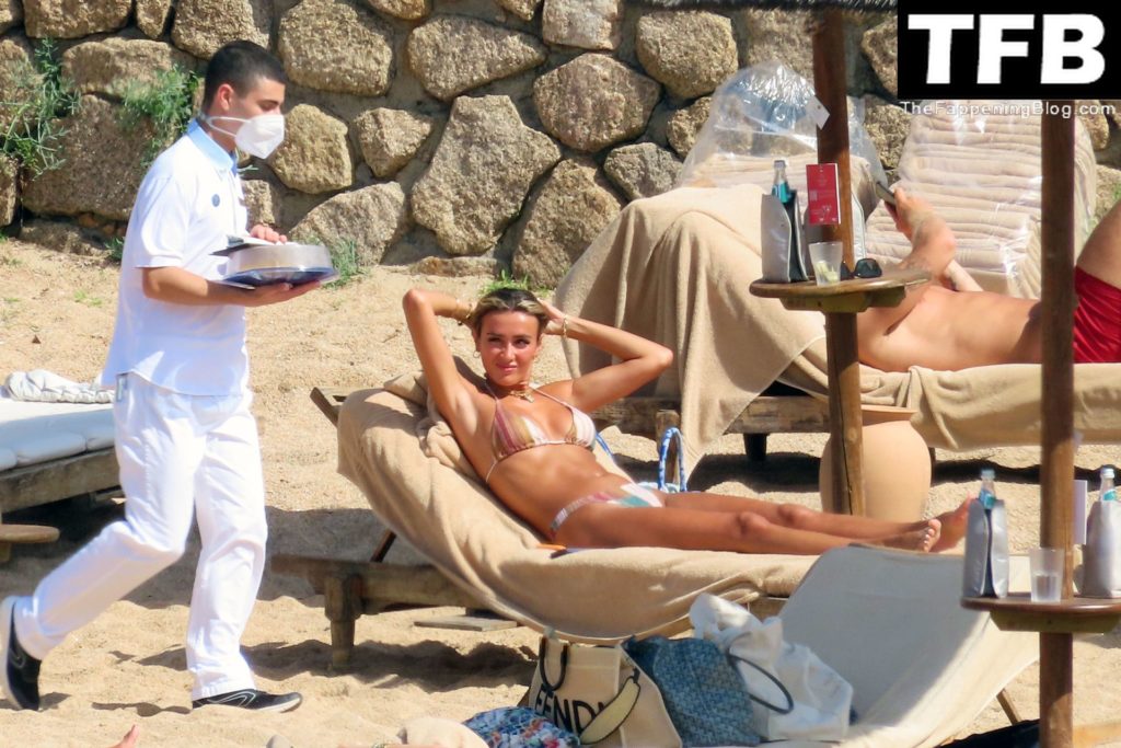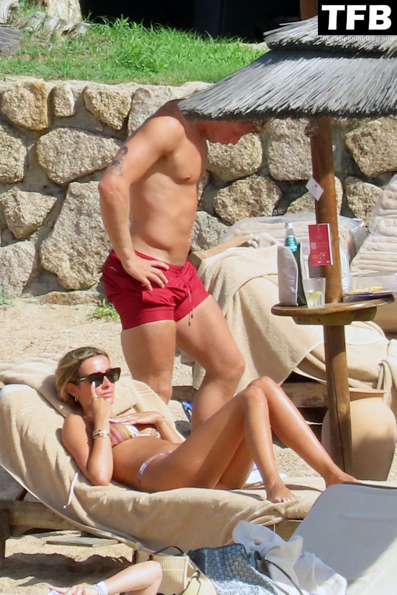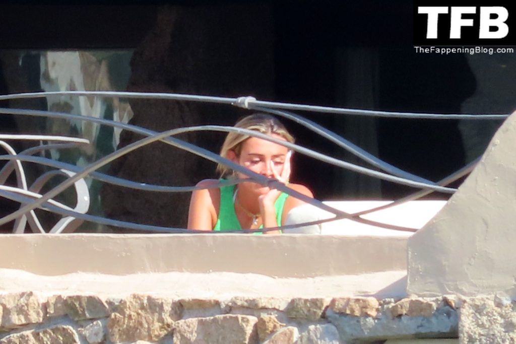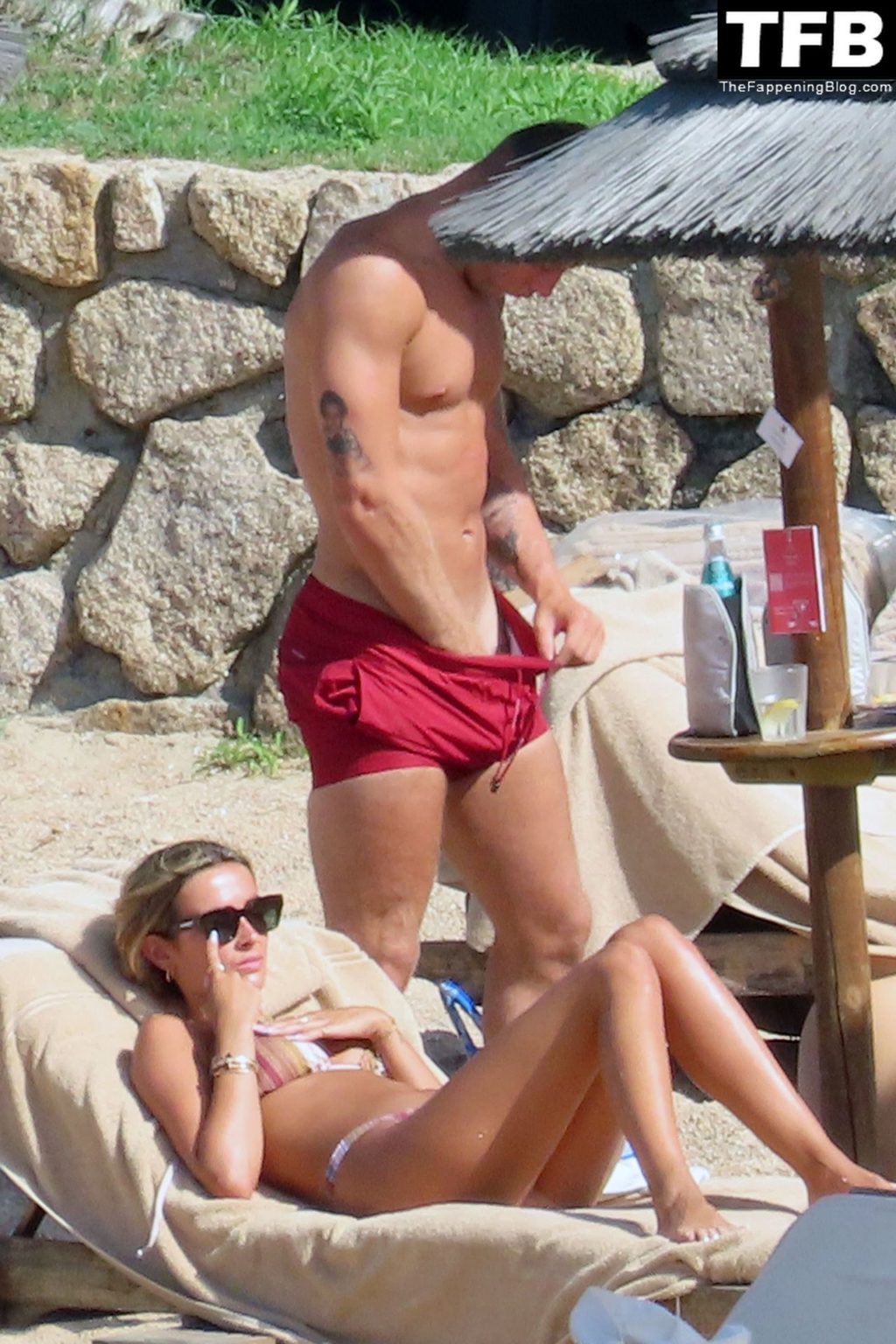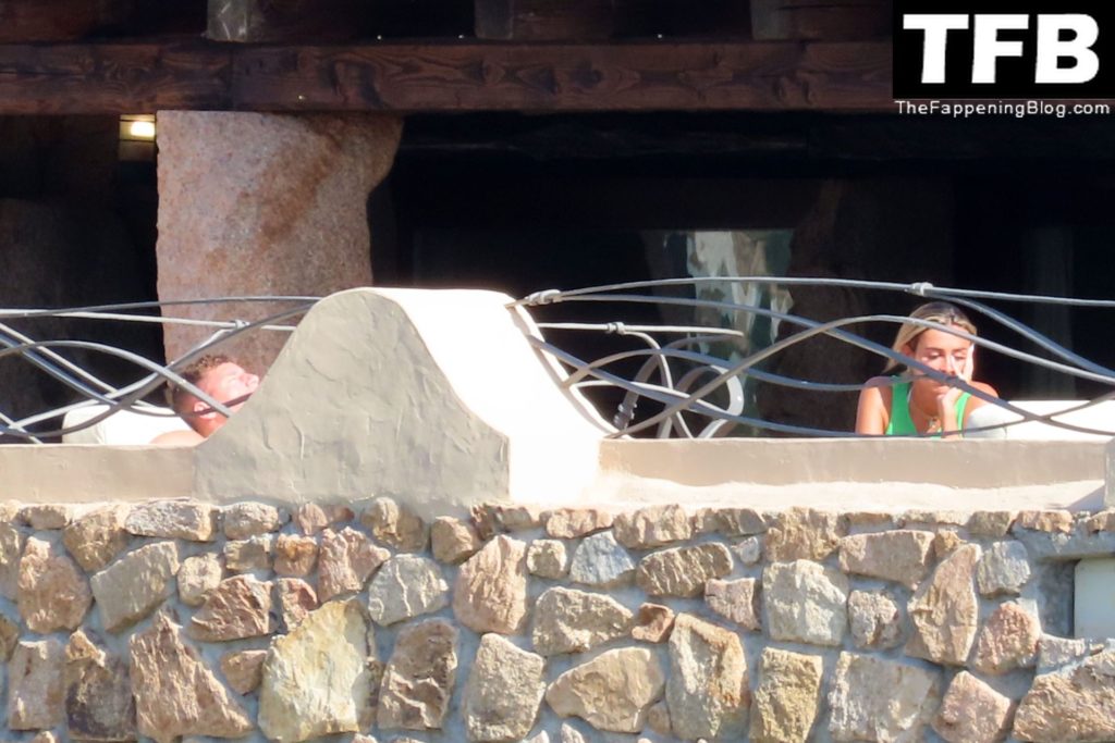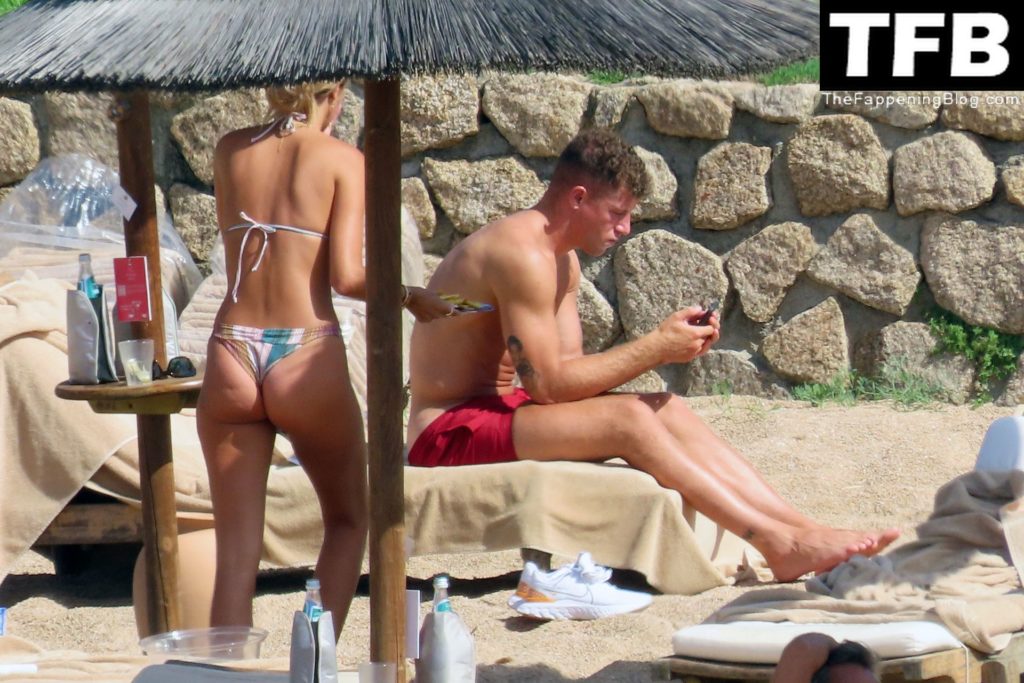 Ross Barkley com expressão séria e sua namorada Katherine Pilkington continuam suas férias na Itália, 28/06/2022. O casal passou o tempo navegando em seus telefones e fazendo pedidos no cardápio à beira da praia.