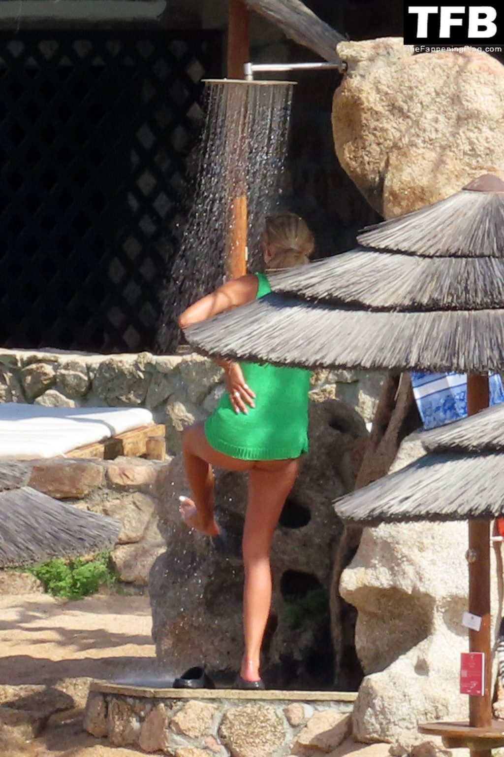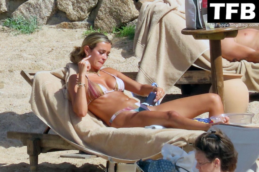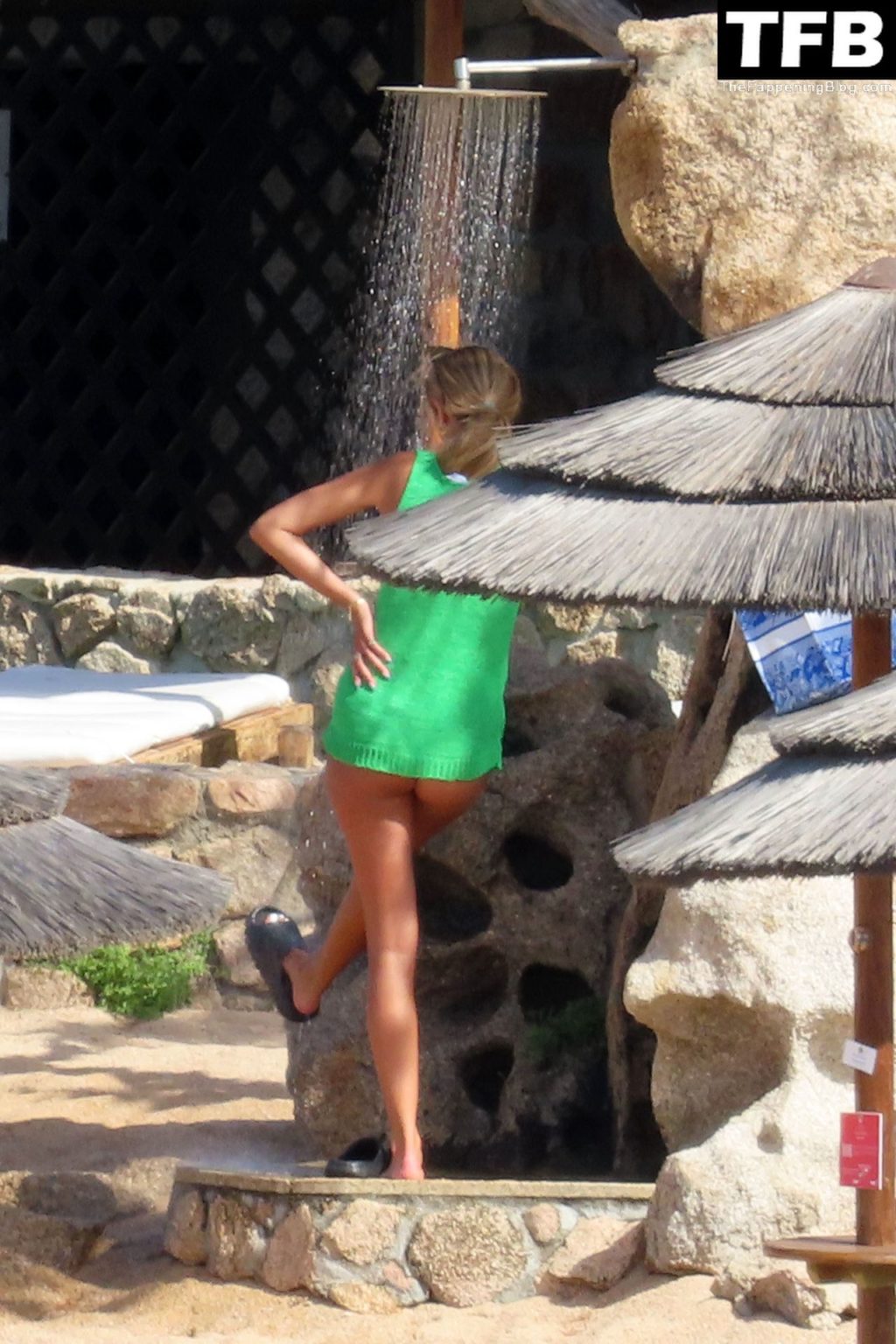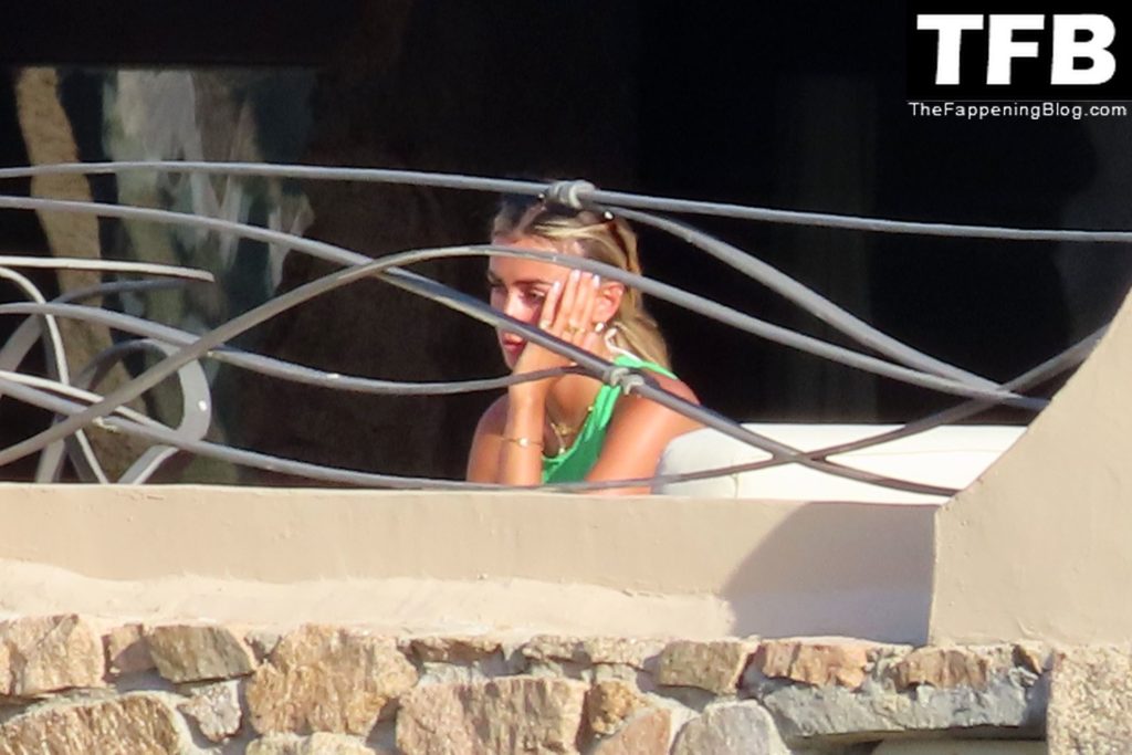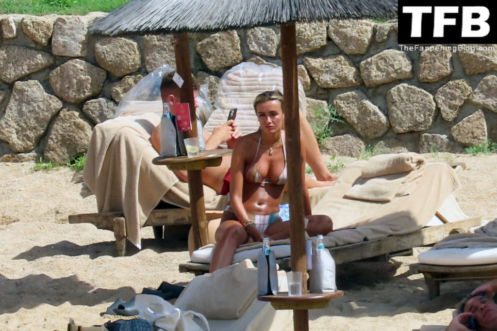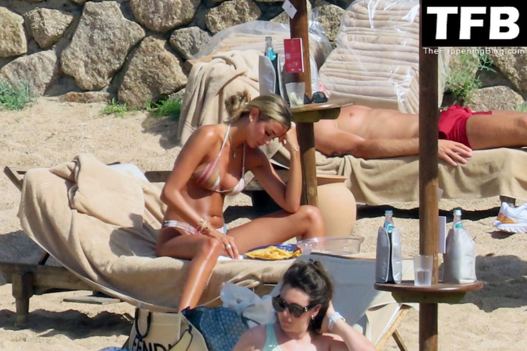 Ross Barkley com expressão séria e sua namorada Katherine Pilkington continuam suas férias na Itália, 28/06/2022. O casal passou o tempo navegando em seus telefones e fazendo pedidos no cardápio à beira da praia.