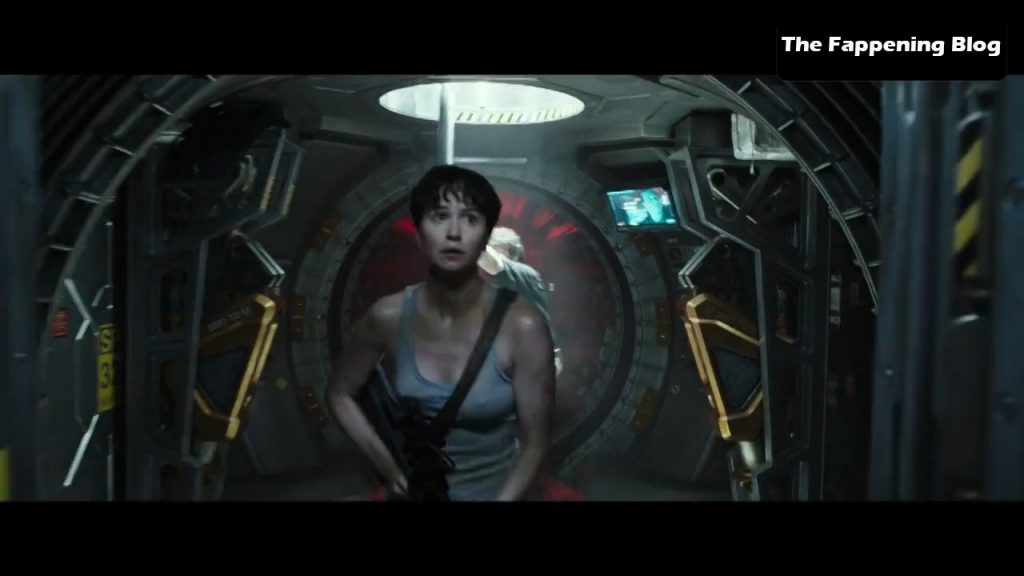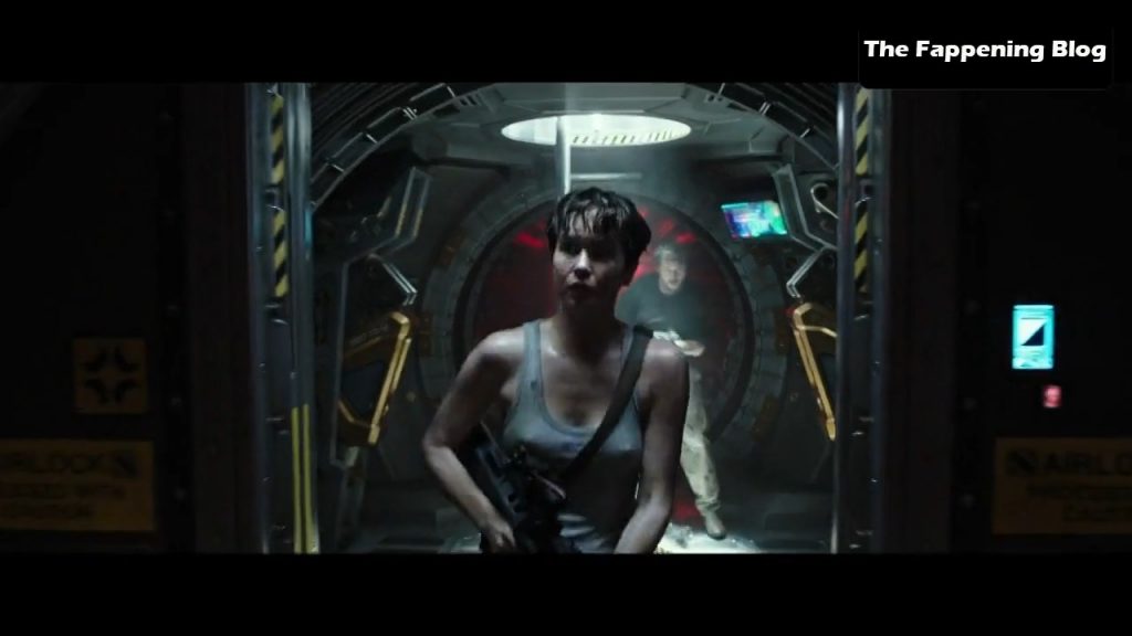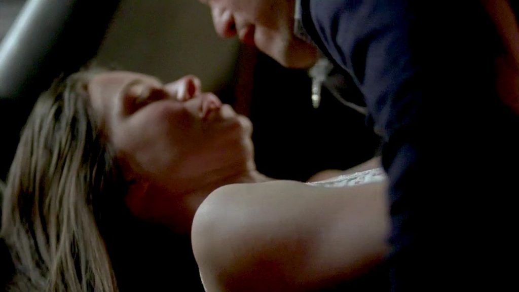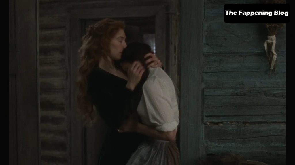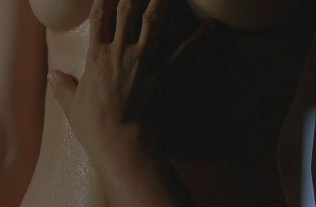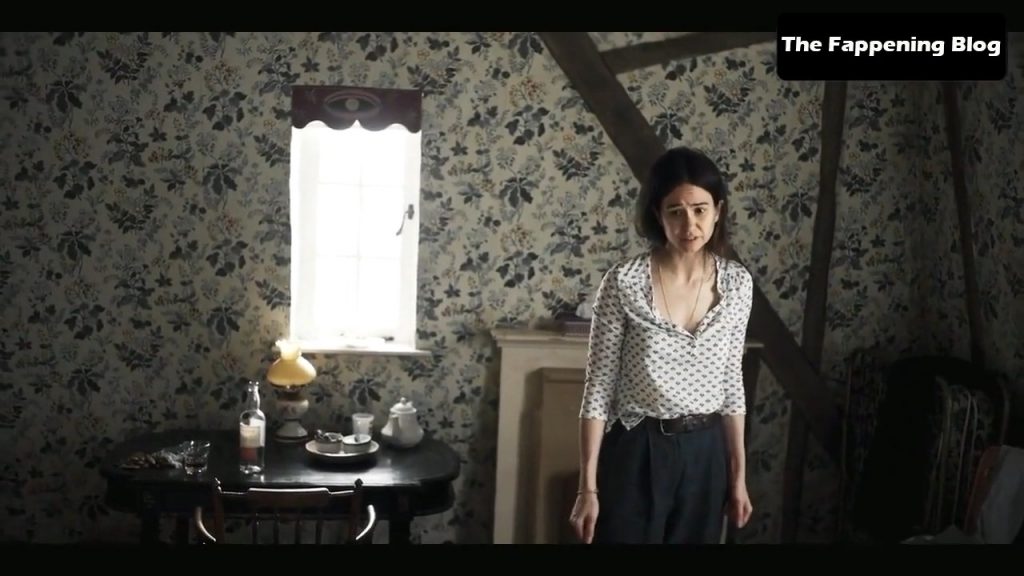 Na primeira cena, vemos Katherine Waterston subindo uma escada com uma camisa muito justa que mostra mamilos pontudos. Depois, ela fica em frente a um homem enquanto puxa a camisa sobre a cabeça para revelar seus belos seios nus.
