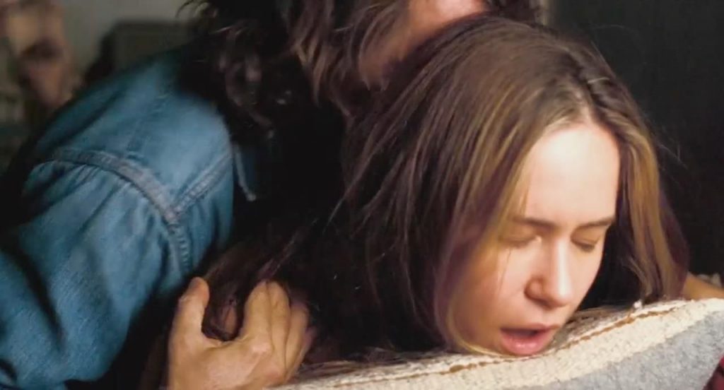 Katherine Waterston faz sexo brevemente deitada de costas com um homem e depois vira-se, fazendo sexo mais intenso enquanto monta ele e geme até que ele a pare.
