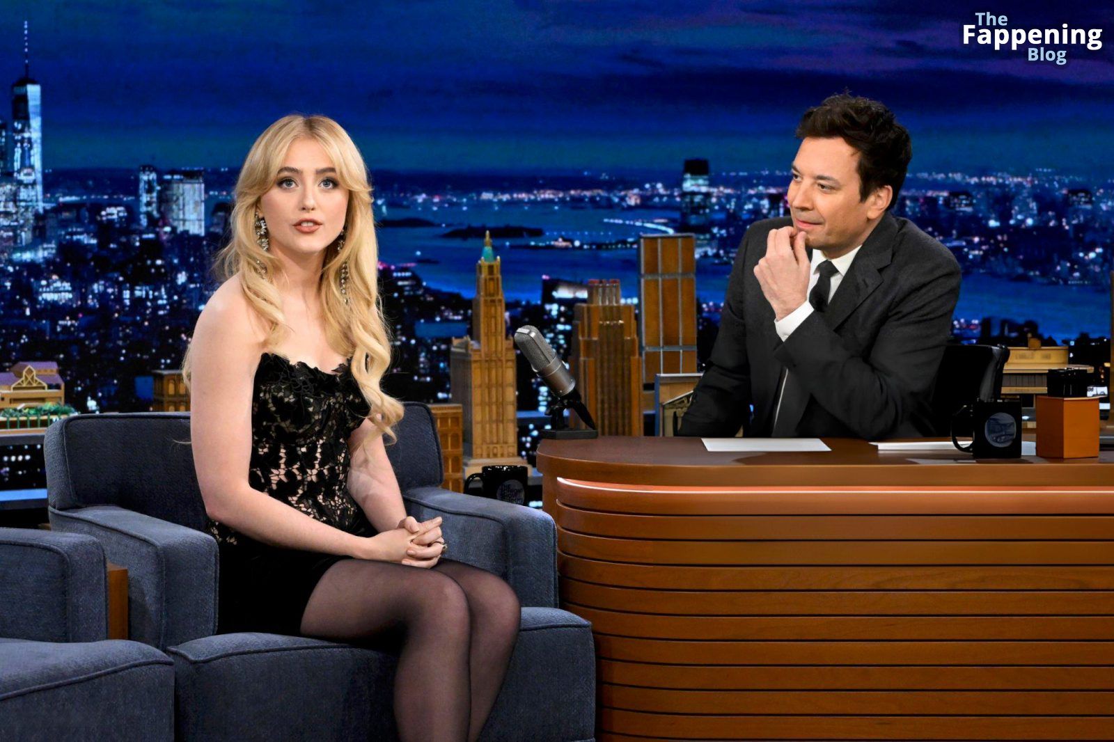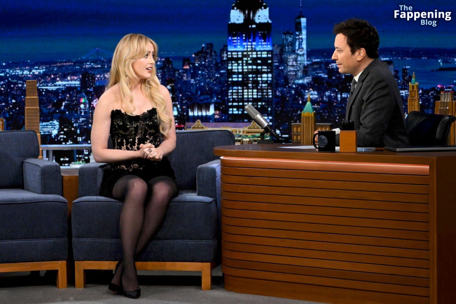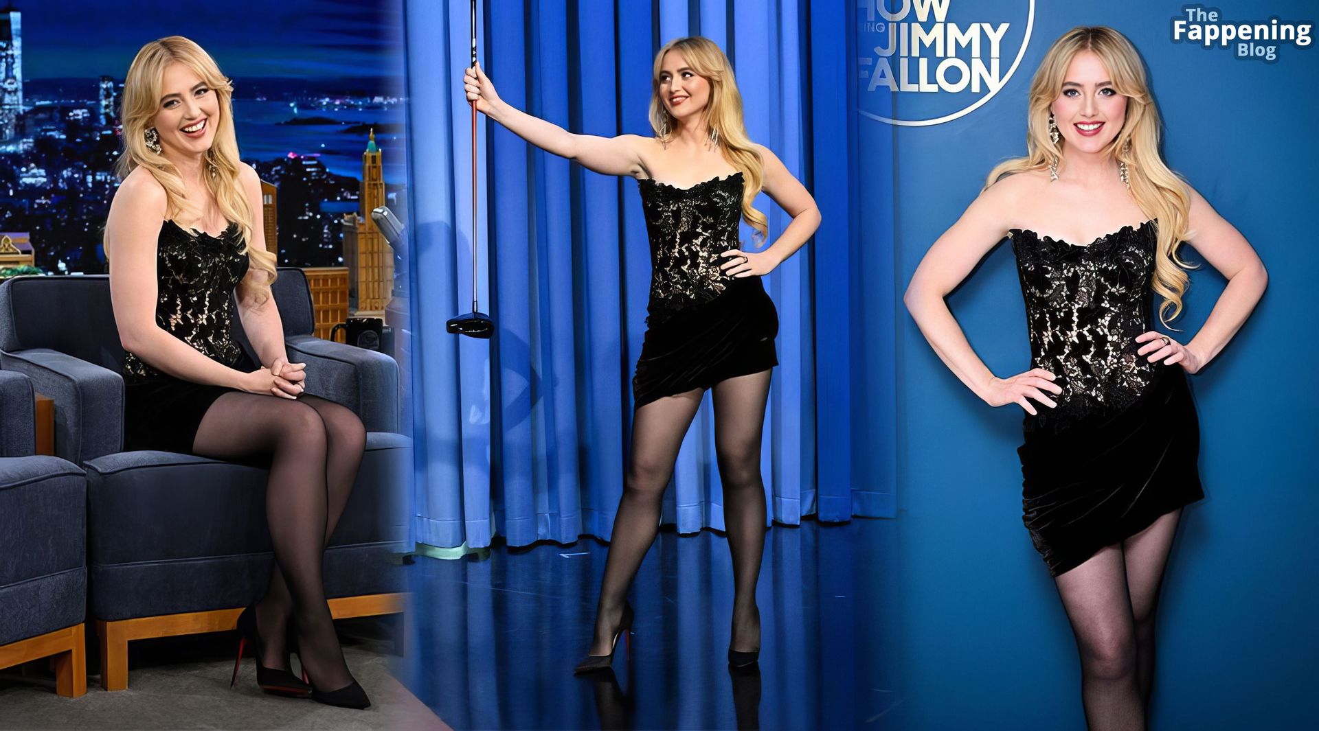 Confira o visual incrível de Kathryn Newton no “The Tonight Show” – ela arrasou com um vestido curto e meias pretas, trazendo uma vibe super glamourosa.