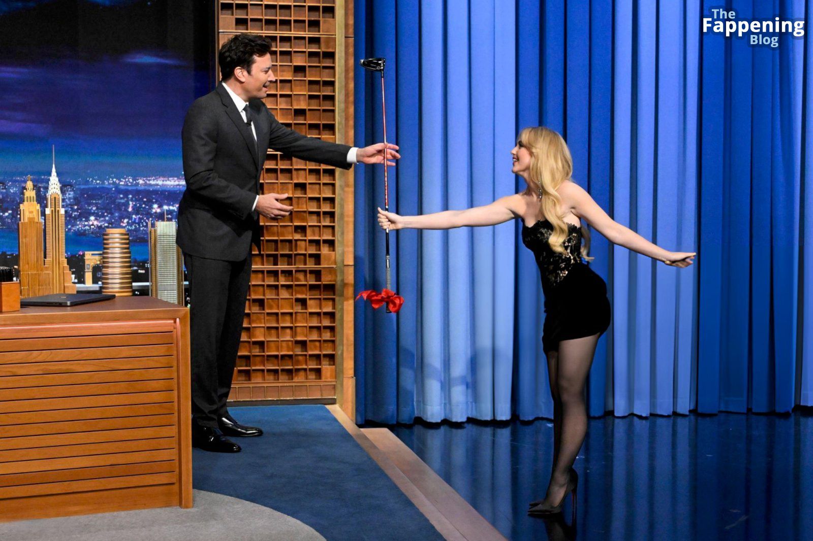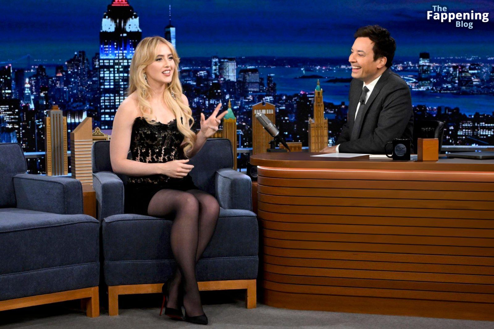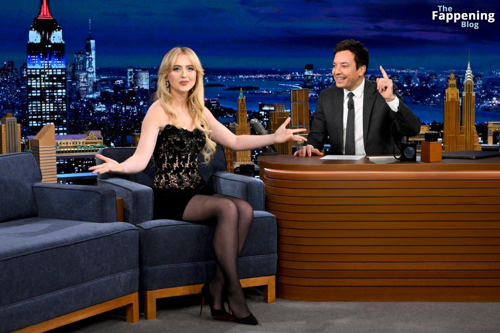 Confira o visual incrível de Kathryn Newton no “The Tonight Show” – ela arrasou com um vestido curto e meias pretas, trazendo uma vibe super glamourosa.