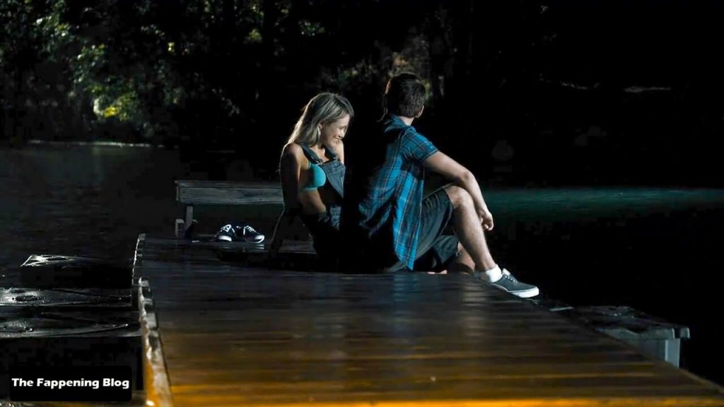 Katrina Bowden está usando um biquíni azul enquanto senta em um píer com um rapaz à noite. Ele então se vira enquanto ela se despe e vemos suas costas nuas quando ela mergulha na água para nadar nua. Depois, vemos Katrina novamente com seu top de biquíni azul enquanto caminha de volta pelo píer com o rapaz.