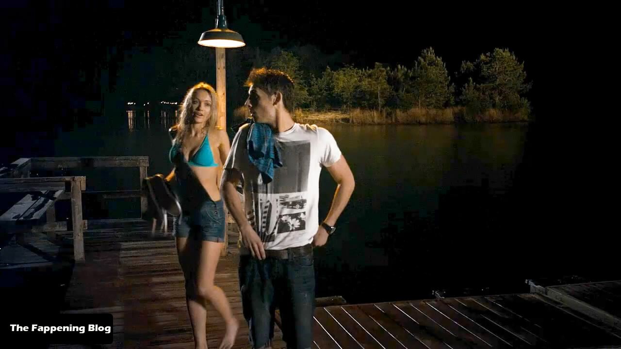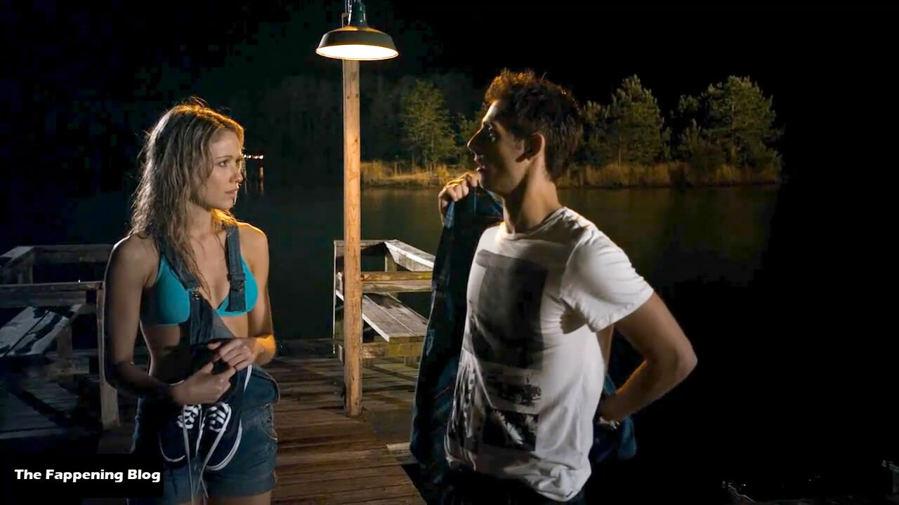 Katrina Bowden está usando um biquíni azul enquanto senta em um píer com um rapaz à noite. Ele então se vira enquanto ela se despe e vemos suas costas nuas quando ela mergulha na água para nadar nua. Depois, vemos Katrina novamente com seu top de biquíni azul enquanto caminha de volta pelo píer com o rapaz.