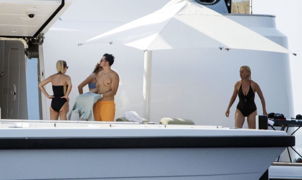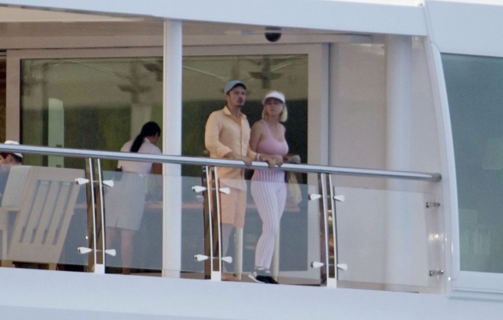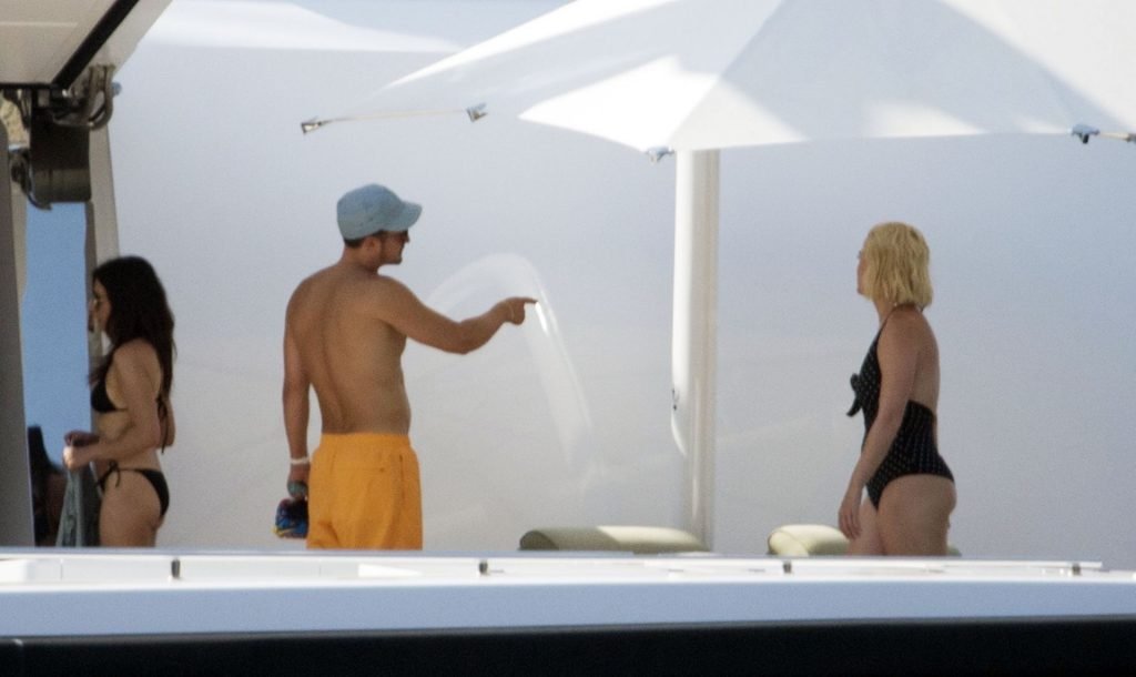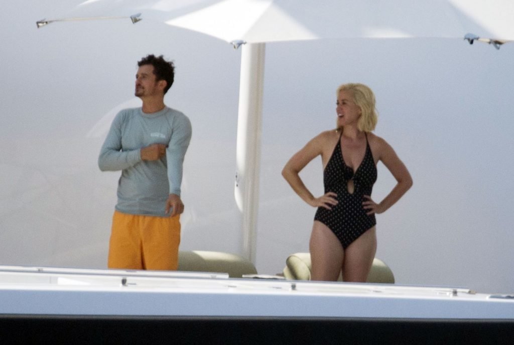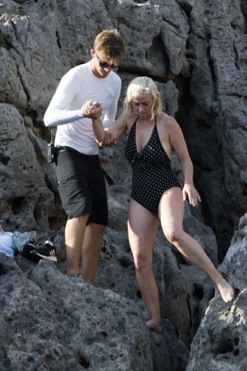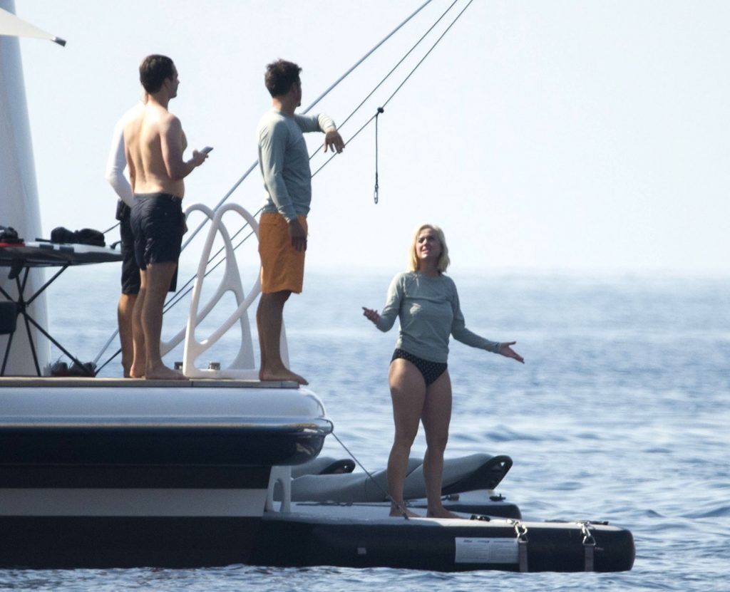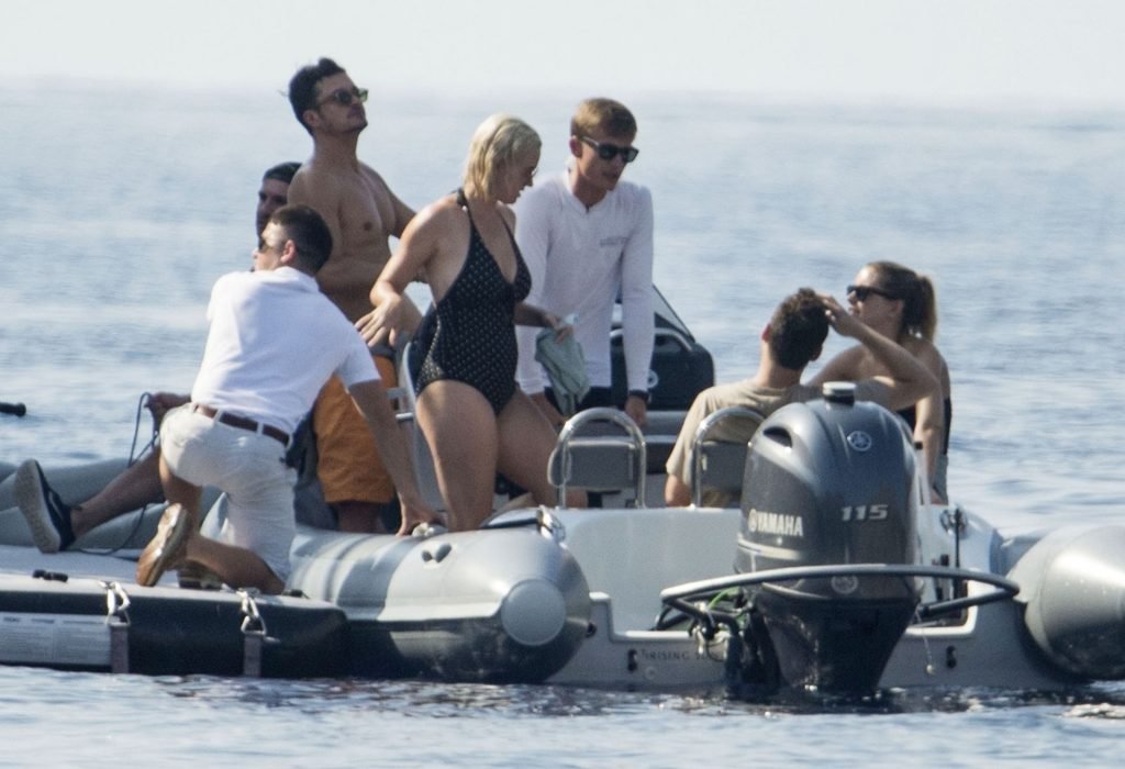 O casal feliz foi fotografado escalando um penhasco juntos antes de pular no mar, Katy mostrou coragem ao dar o salto do penhasco enquanto seus amigos a incentivavam. O grupo então voltou para seu megaiate de luxo onde relaxaram juntos acompanhados por alguns amigos, incluindo a ex de Roman Abramovich, Dasha Zhukova, o jornalista americano Derek Blasberg e o casal poderoso Michael Kives e Lydia Gray Kives.