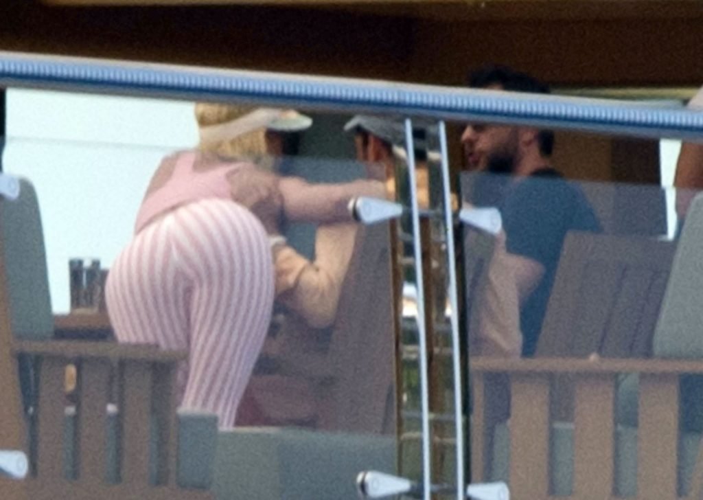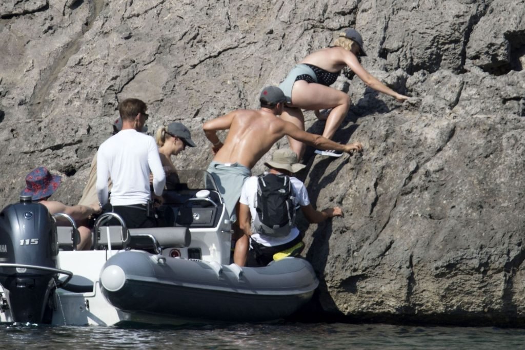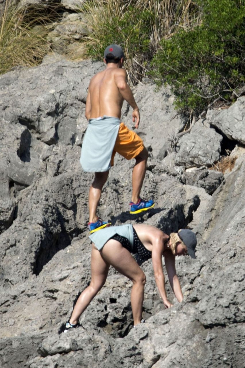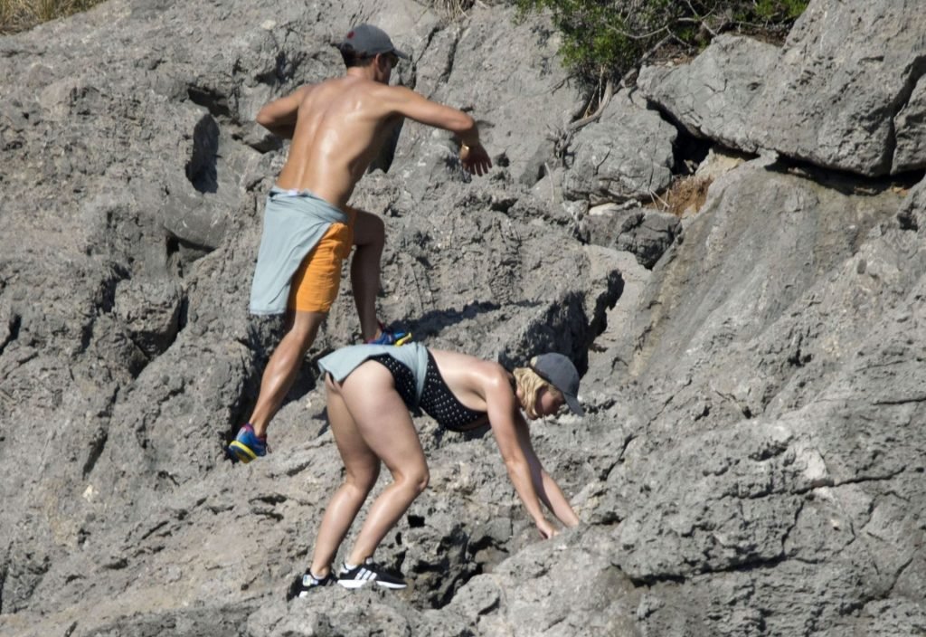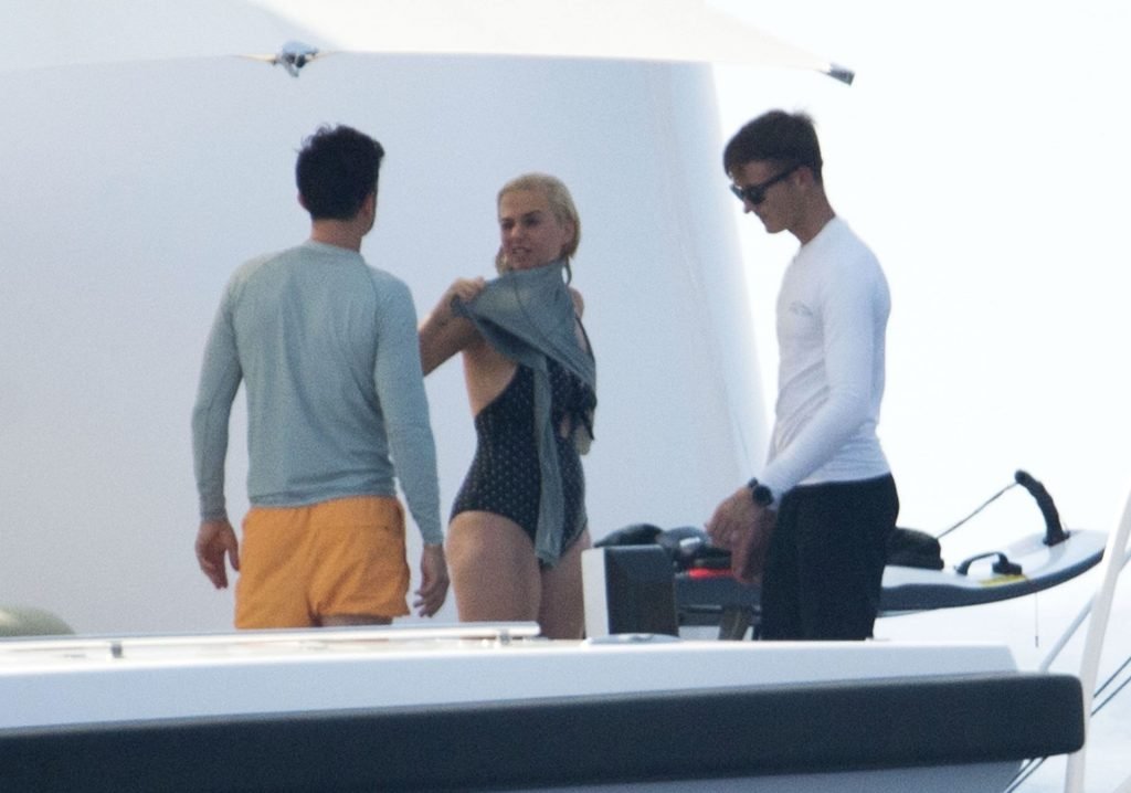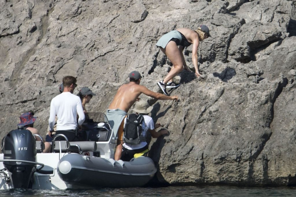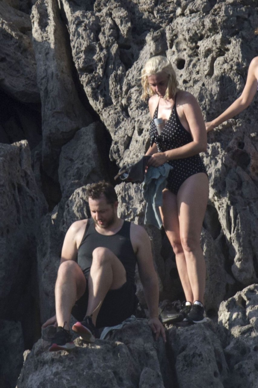 O casal feliz foi fotografado escalando um penhasco juntos antes de pular no mar, Katy mostrou coragem ao dar o salto do penhasco enquanto seus amigos a incentivavam. O grupo então voltou para seu megaiate de luxo onde relaxaram juntos acompanhados por alguns amigos, incluindo a ex de Roman Abramovich, Dasha Zhukova, o jornalista americano Derek Blasberg e o casal poderoso Michael Kives e Lydia Gray Kives.
