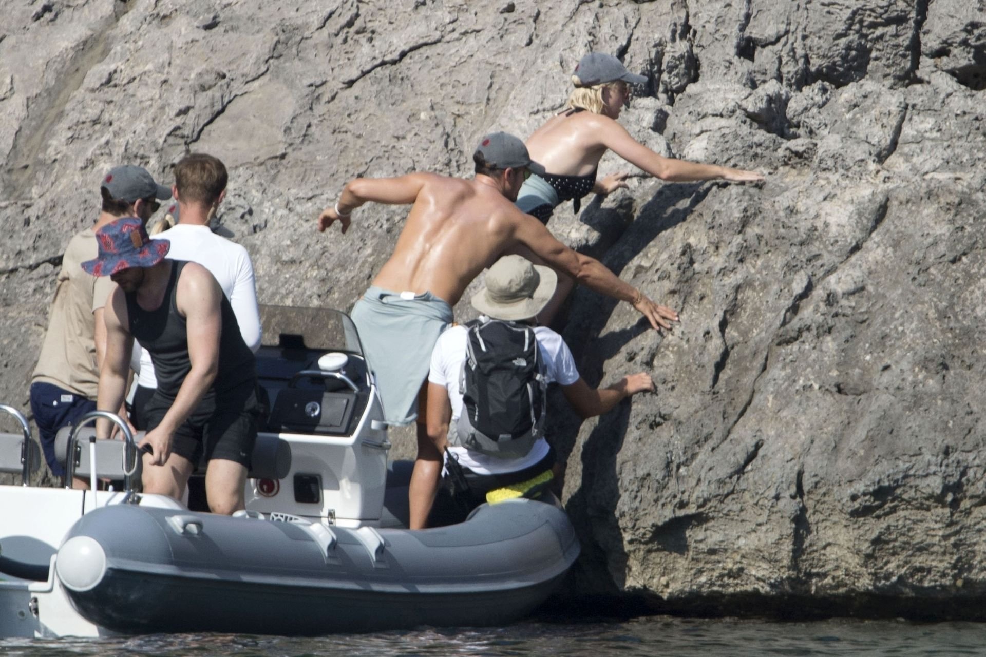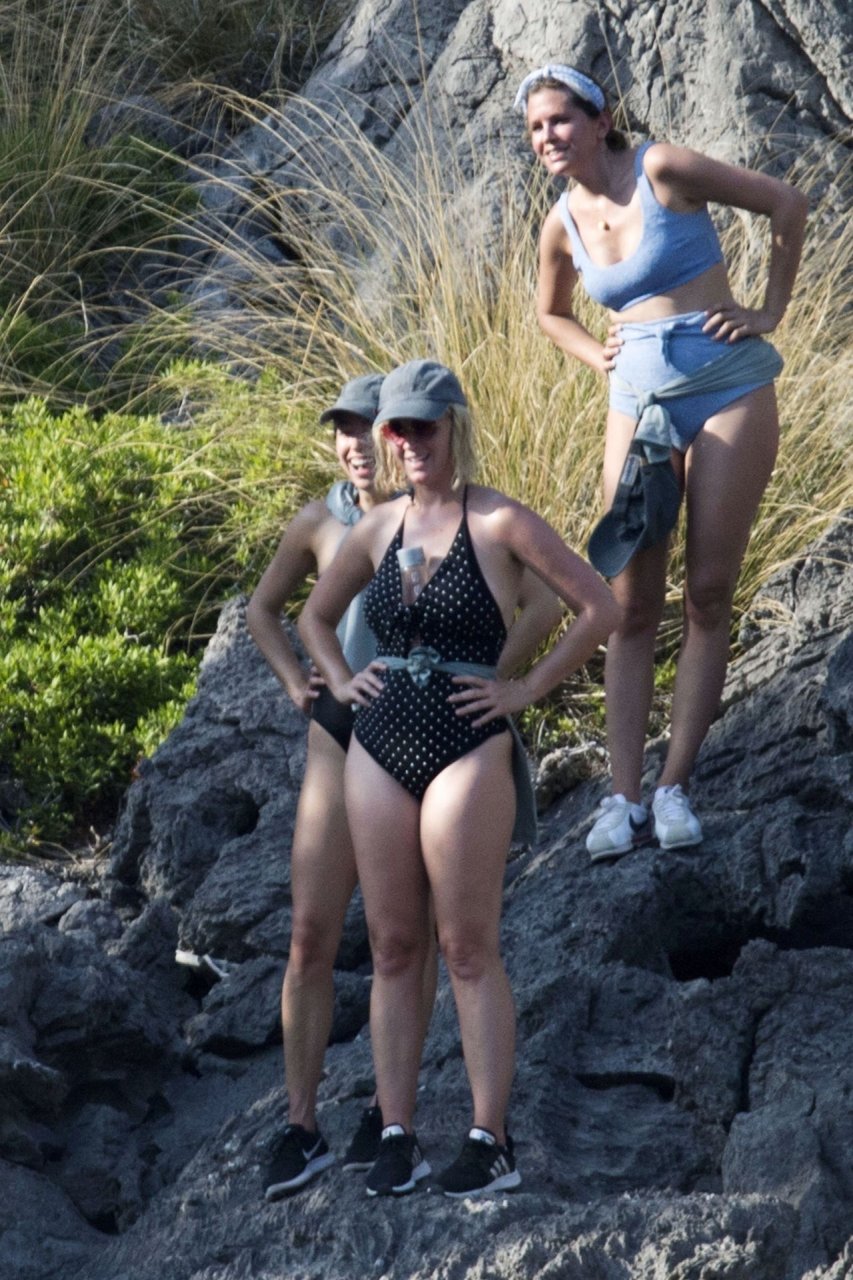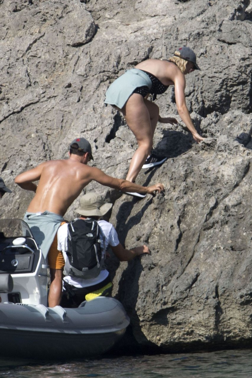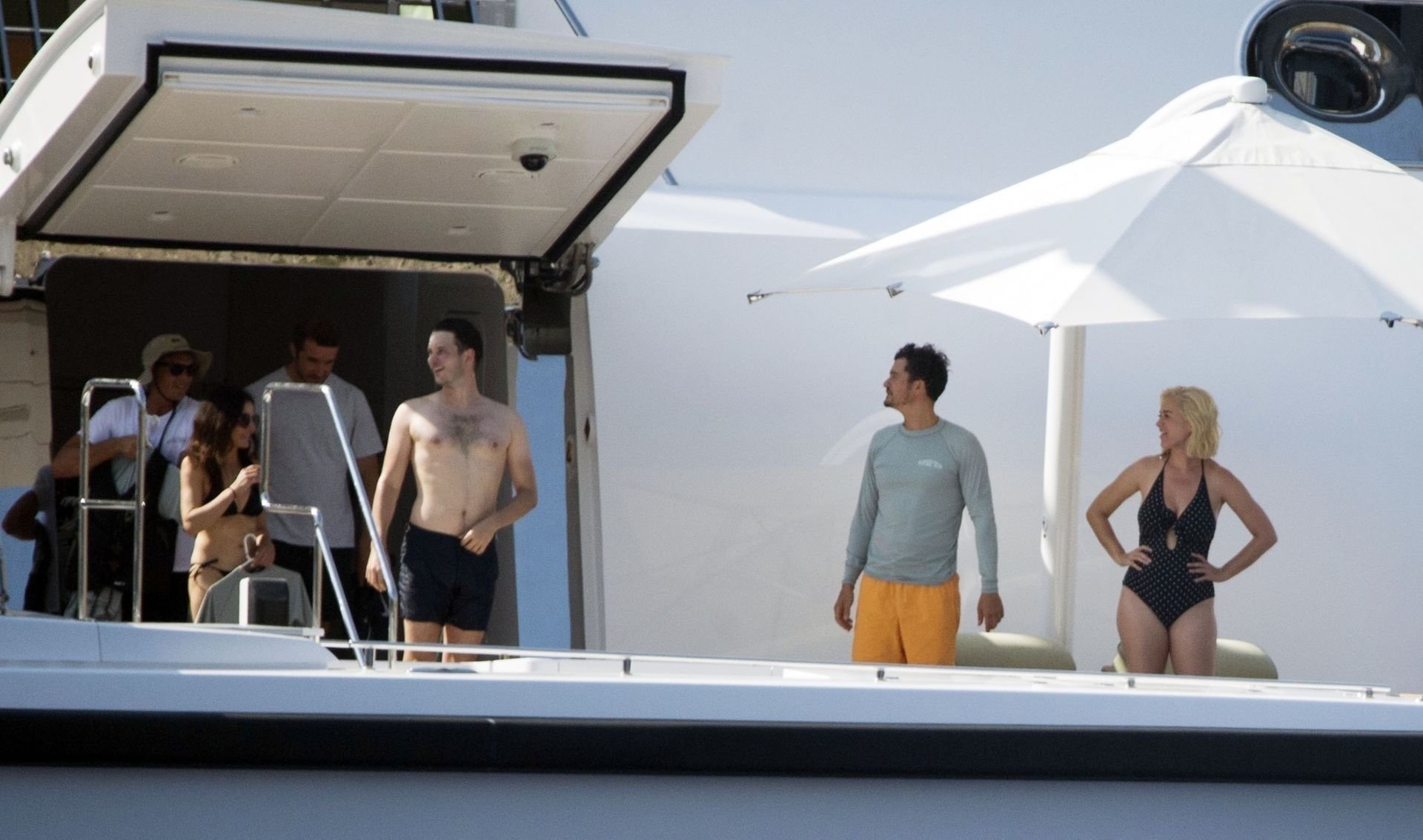 O casal feliz foi fotografado escalando um penhasco juntos antes de pular no mar, Katy mostrou coragem ao dar o salto do penhasco enquanto seus amigos a incentivavam. O grupo então voltou para seu megaiate de luxo onde relaxaram juntos acompanhados por alguns amigos, incluindo a ex de Roman Abramovich, Dasha Zhukova, o jornalista americano Derek Blasberg e o casal poderoso Michael Kives e Lydia Gray Kives.