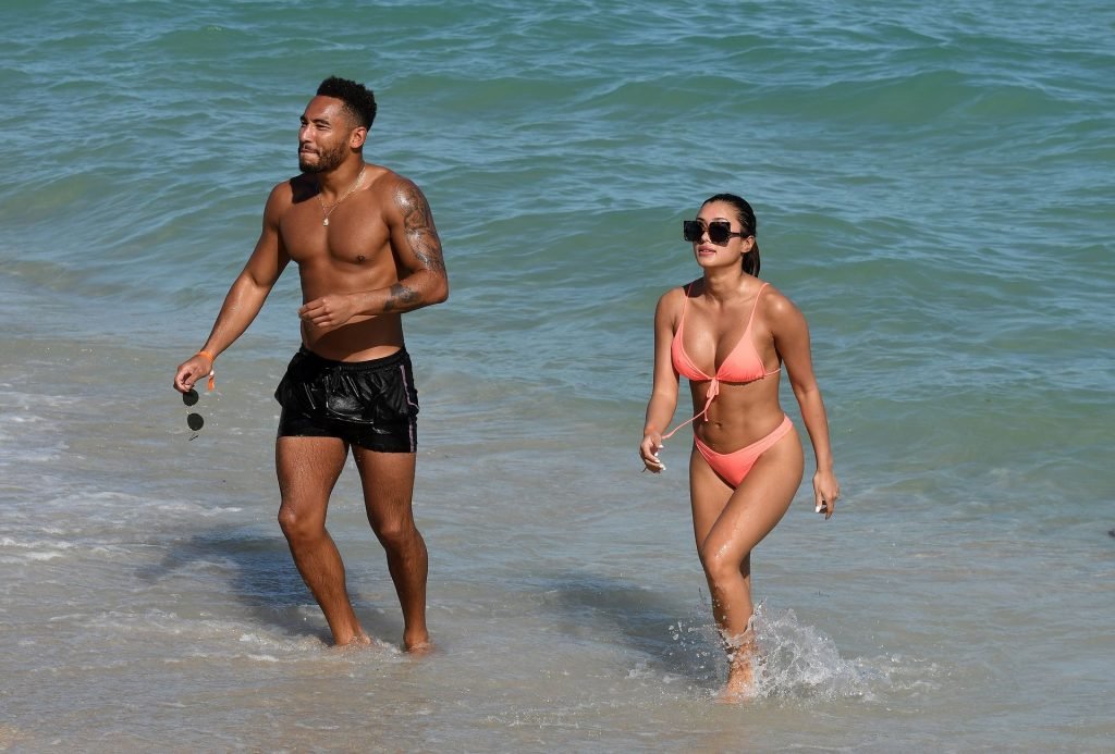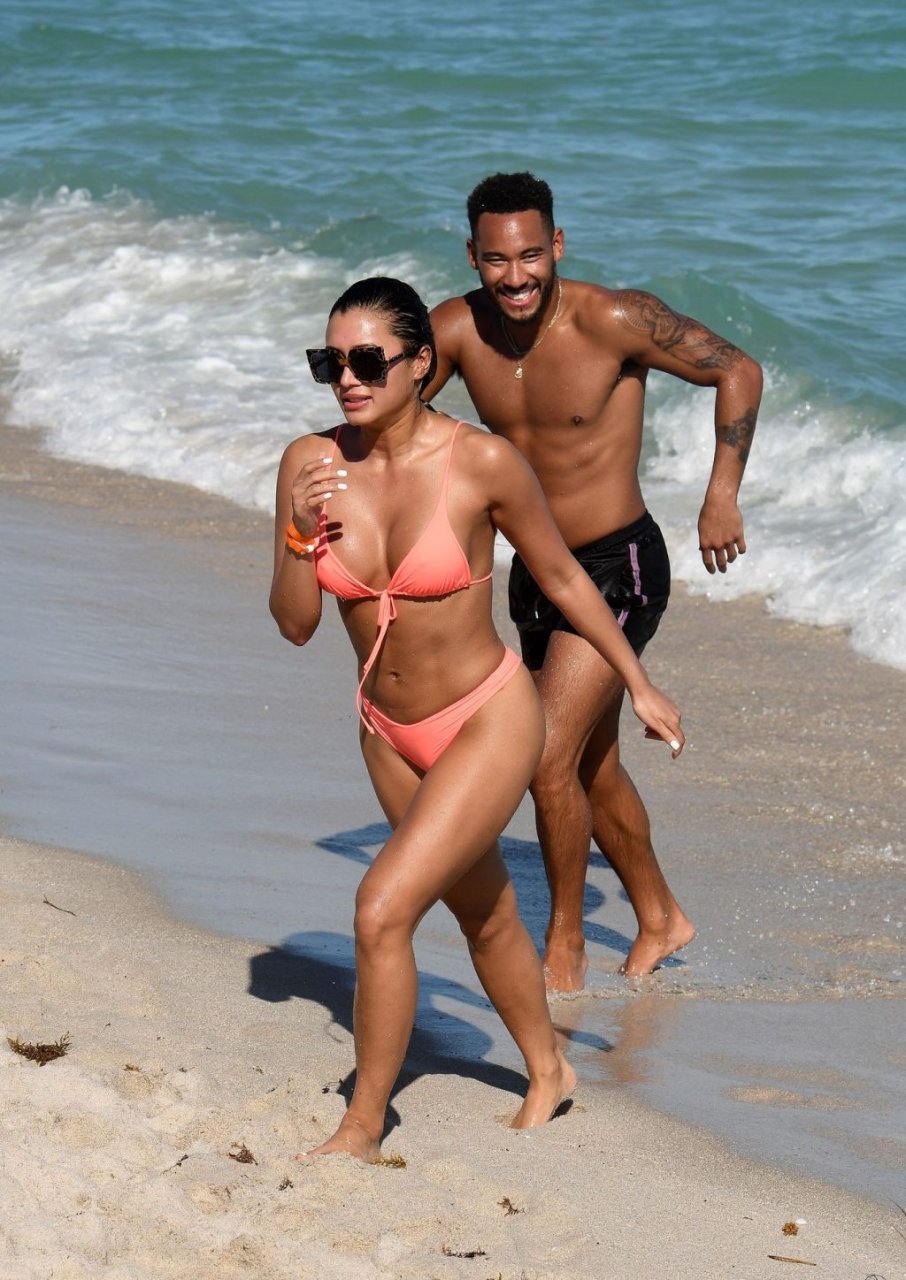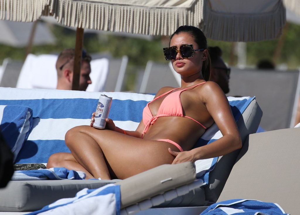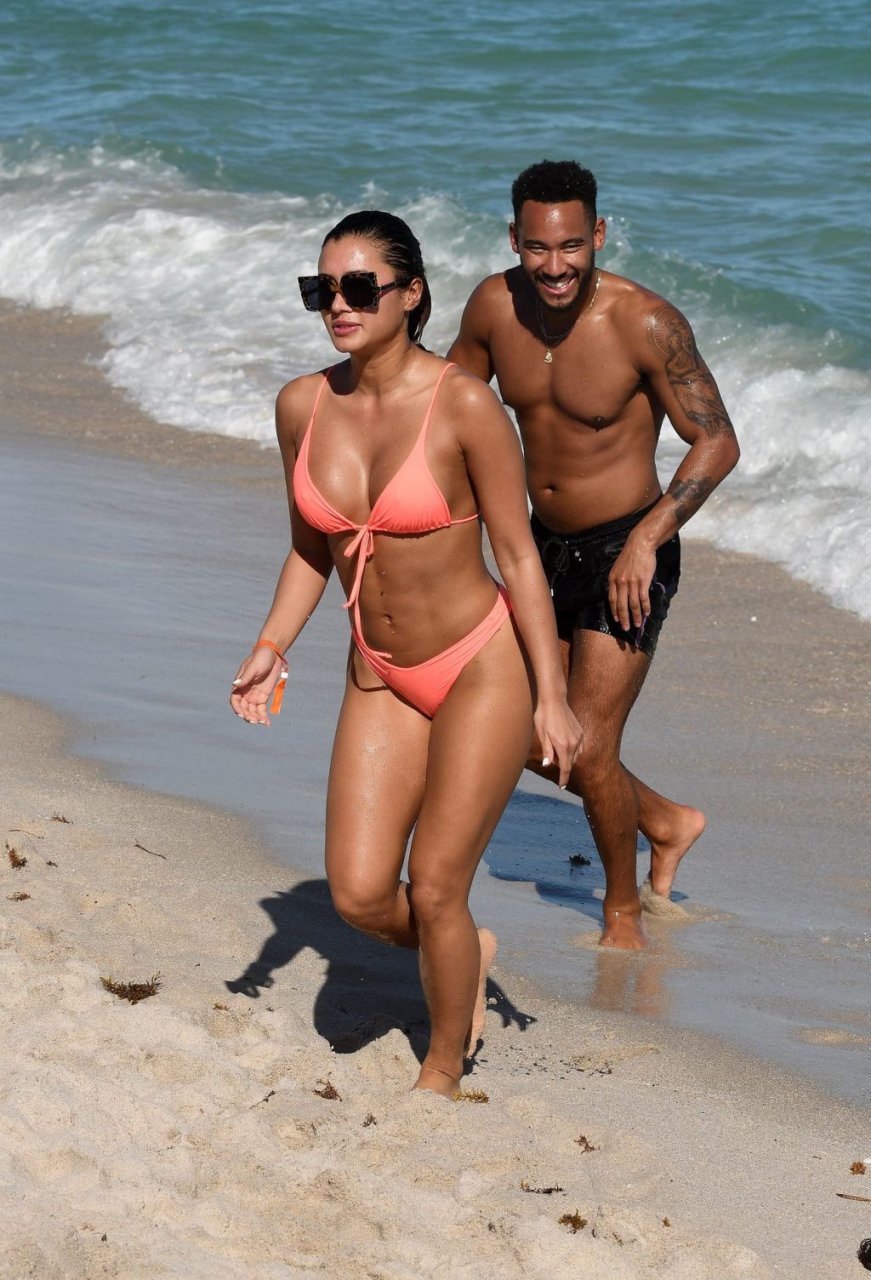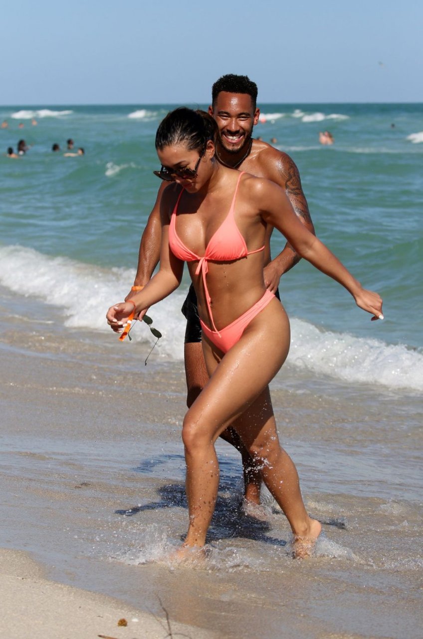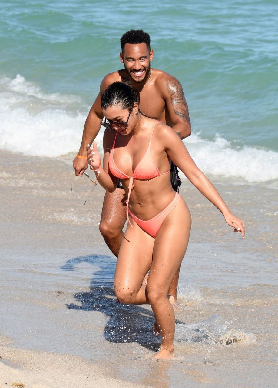 Kazimir “Kaz” Crossley, do Love Island, usa um biquíni pêssego enquanto aproveita a praia com o namorado Josh Denzel em Miami, 01/02/2019.