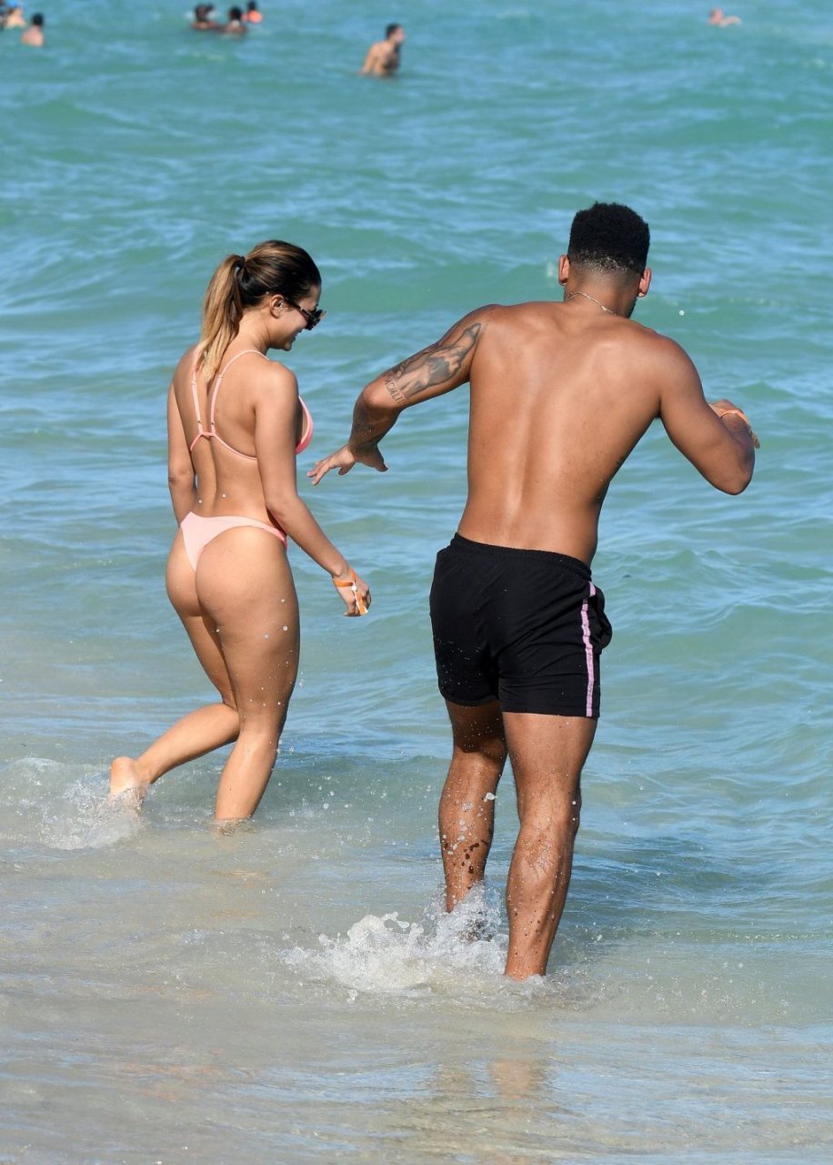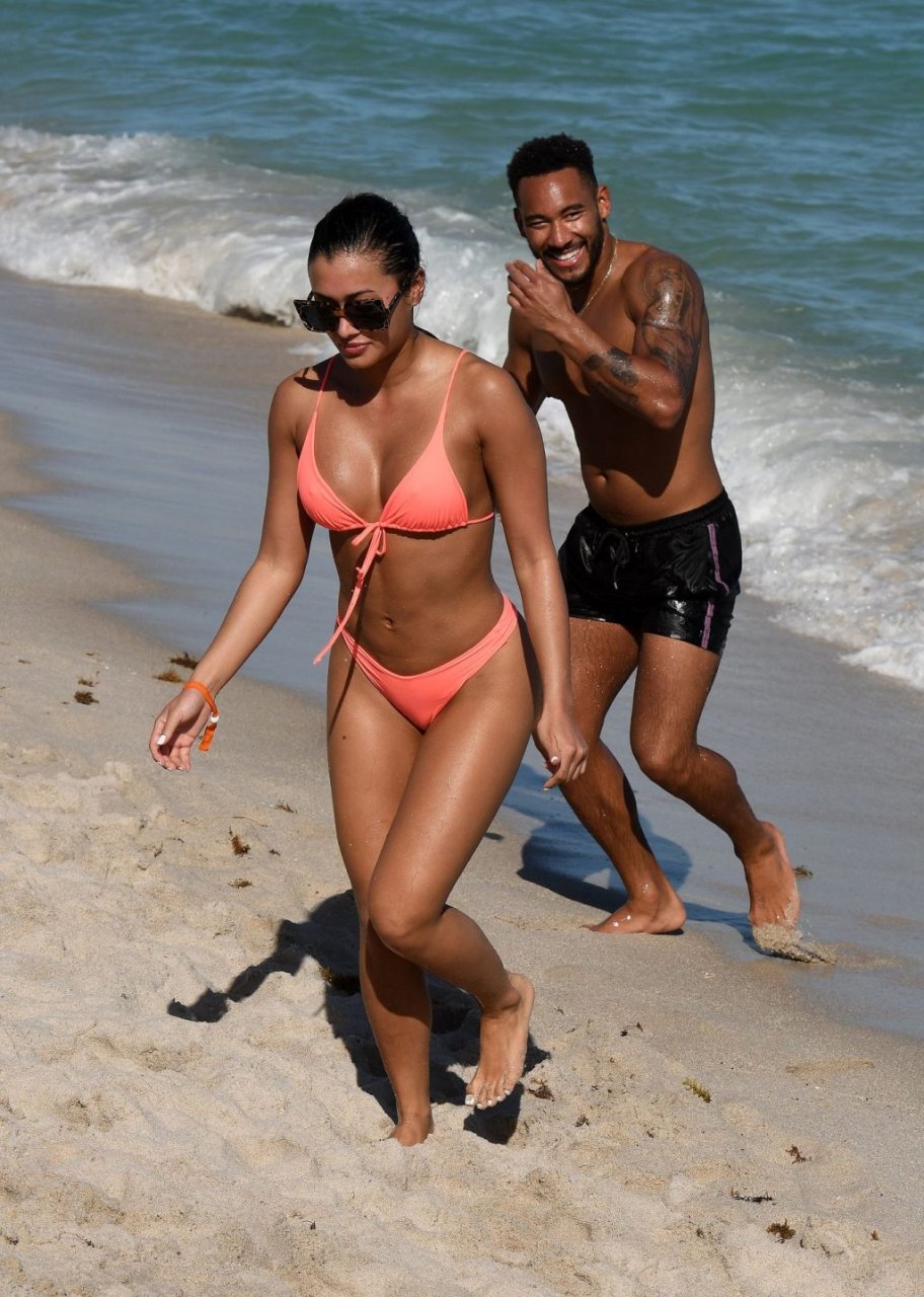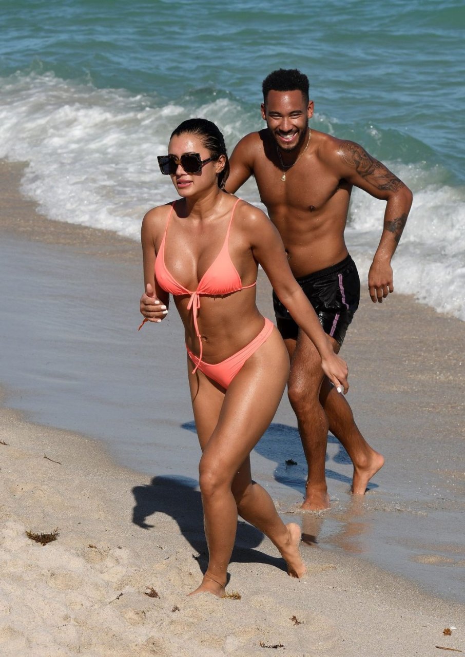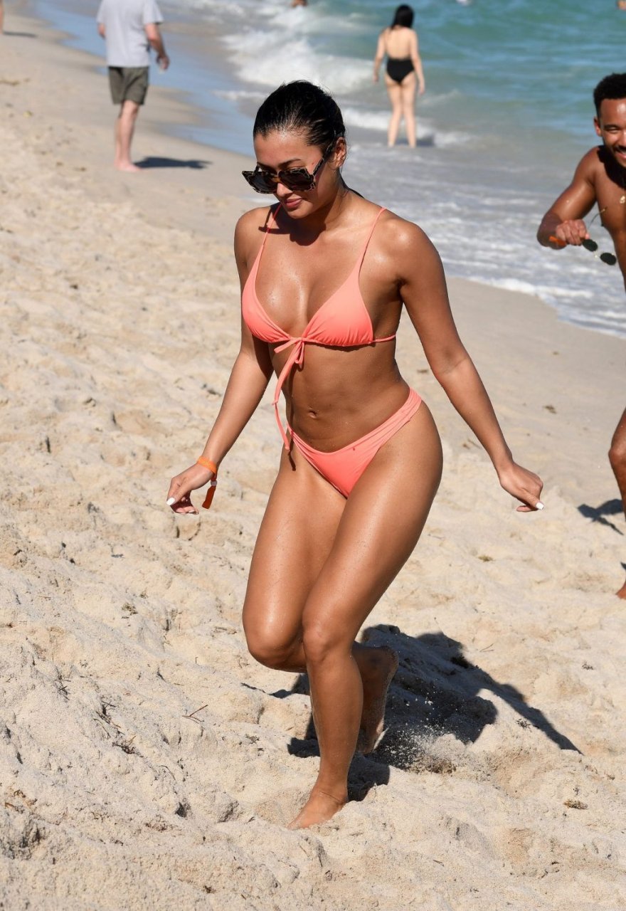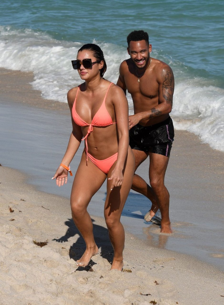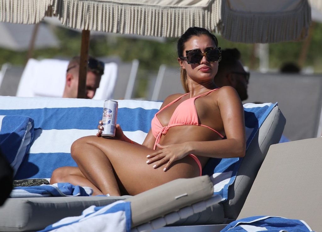 Kazimir “Kaz” Crossley, do Love Island, usa um biquíni pêssego enquanto aproveita a praia com o namorado Josh Denzel em Miami, 01/02/2019.