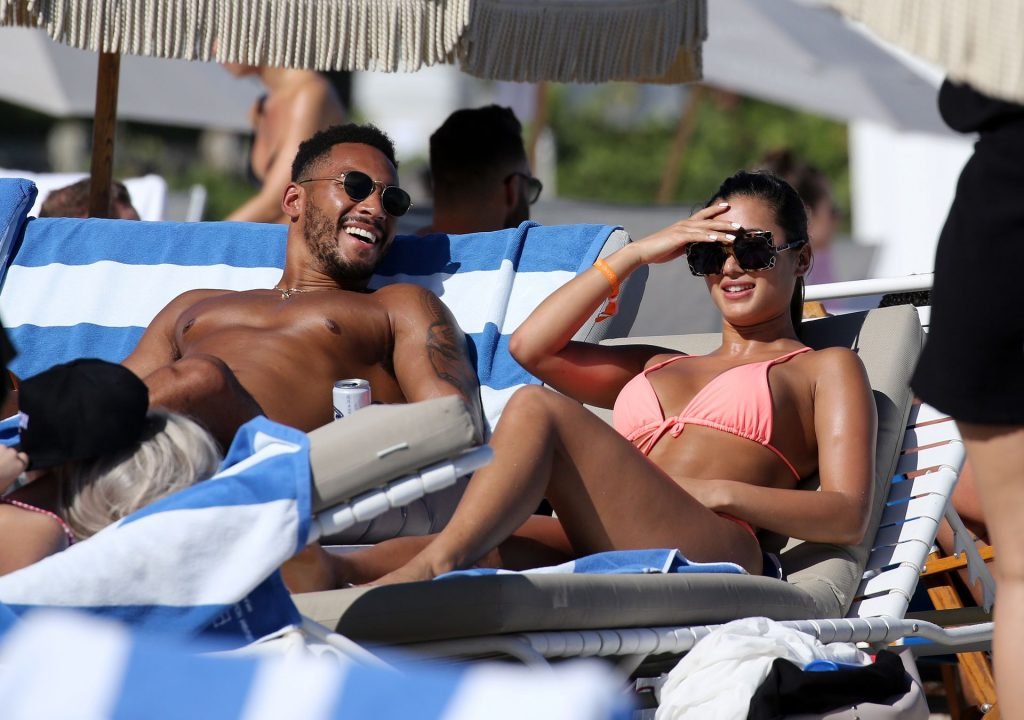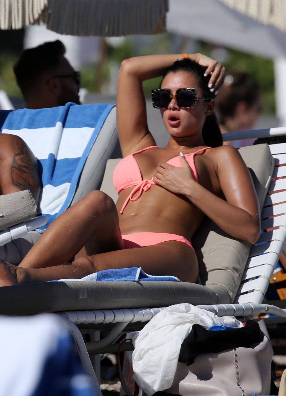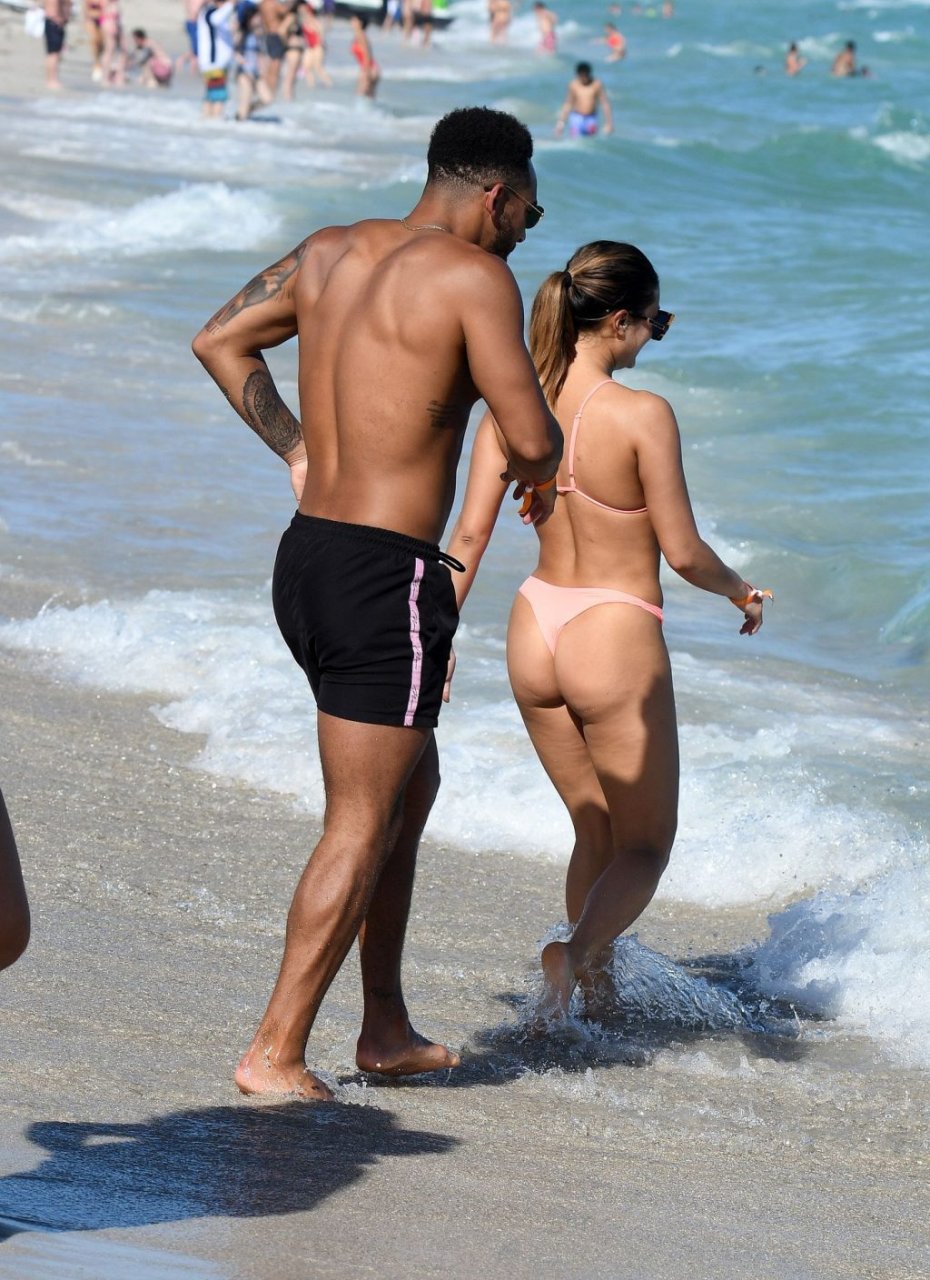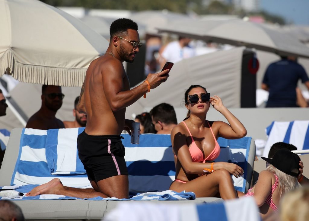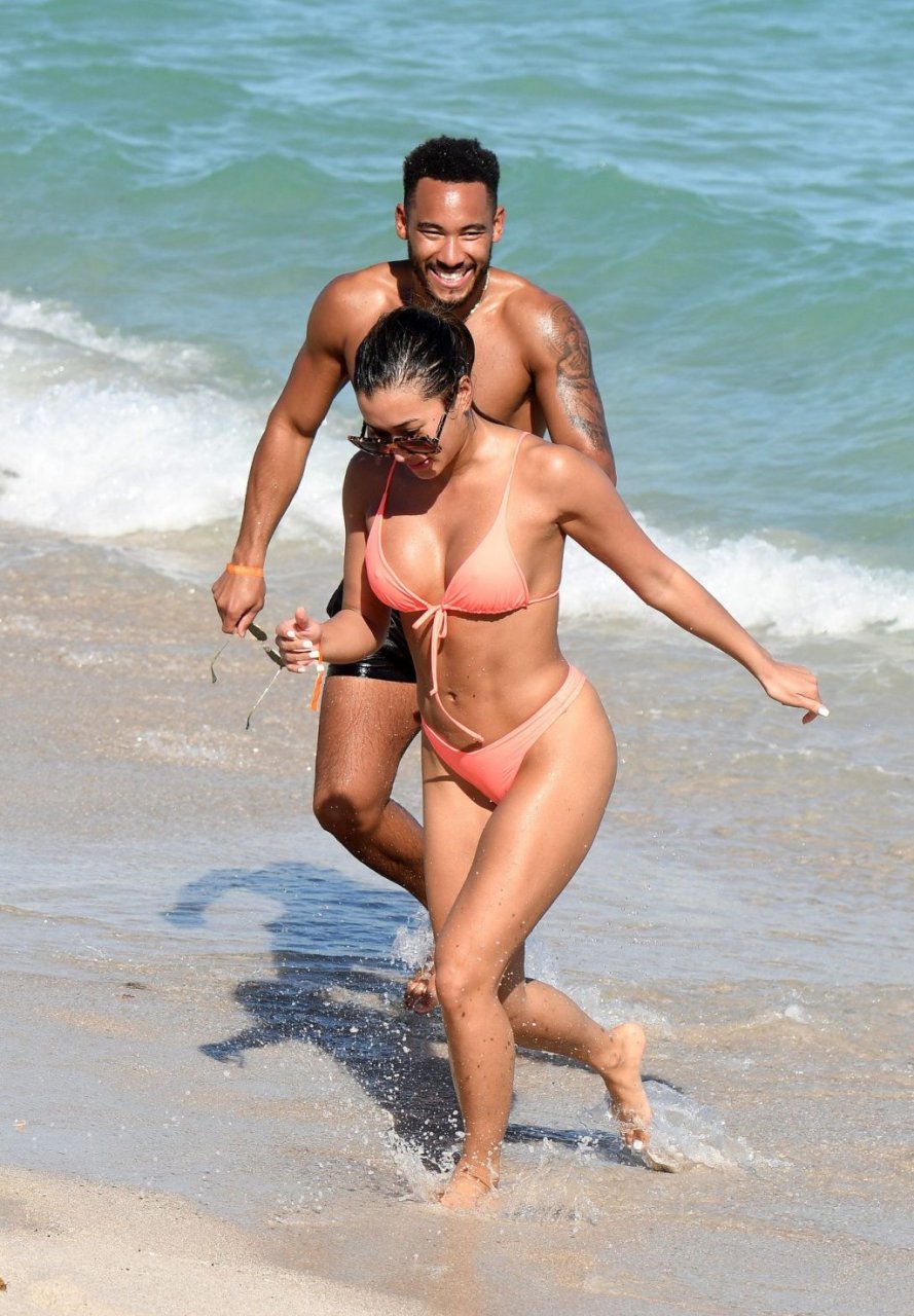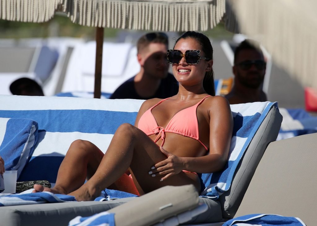 Kazimir “Kaz” Crossley, do Love Island, usa um biquíni pêssego enquanto aproveita a praia com o namorado Josh Denzel em Miami, 01/02/2019.
