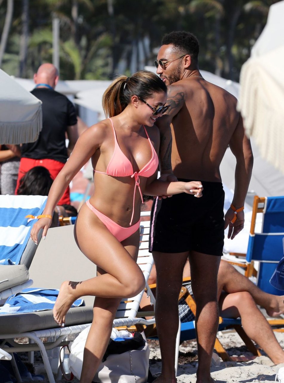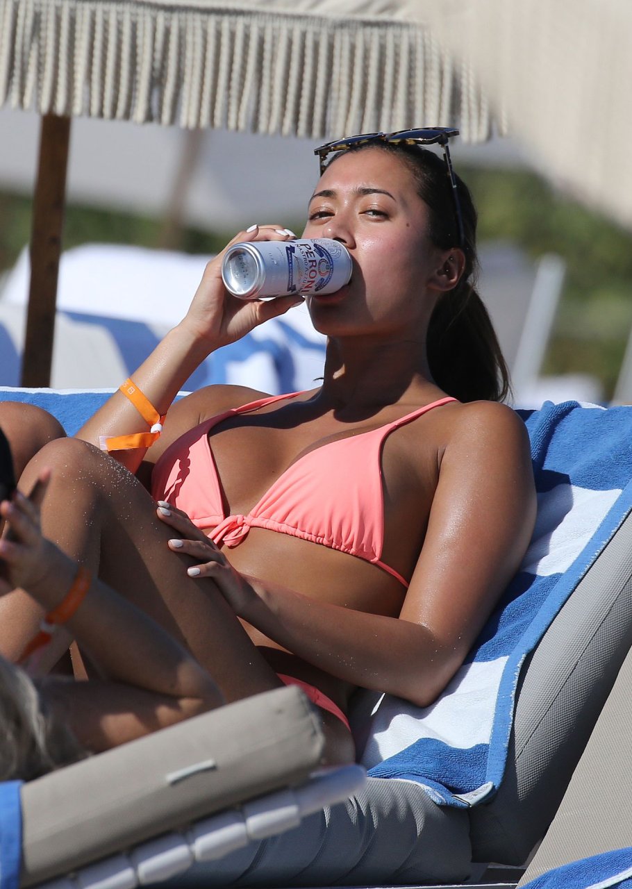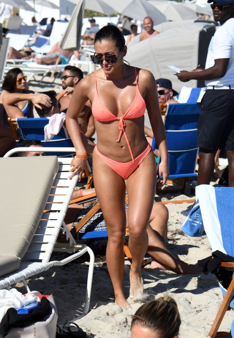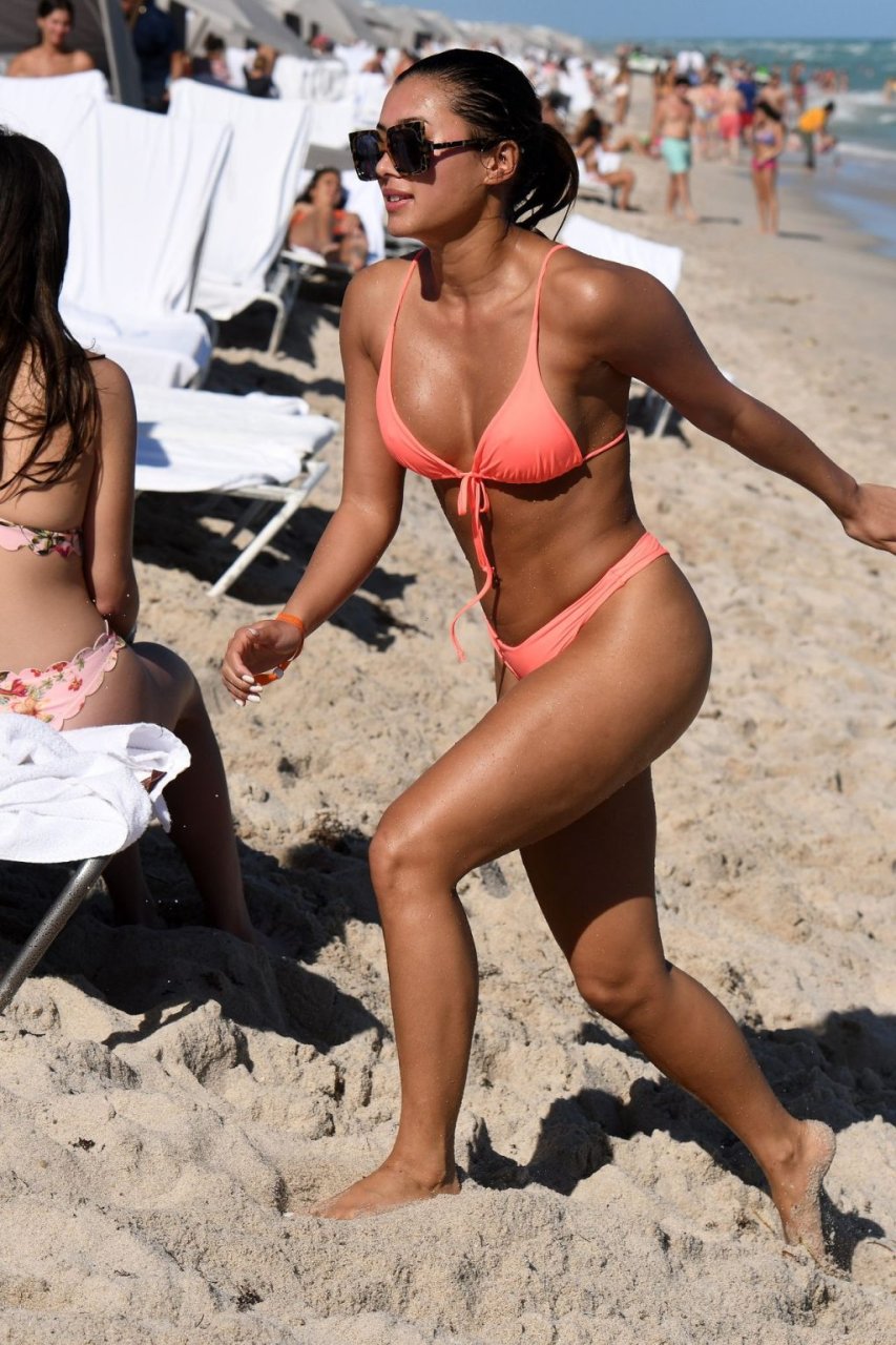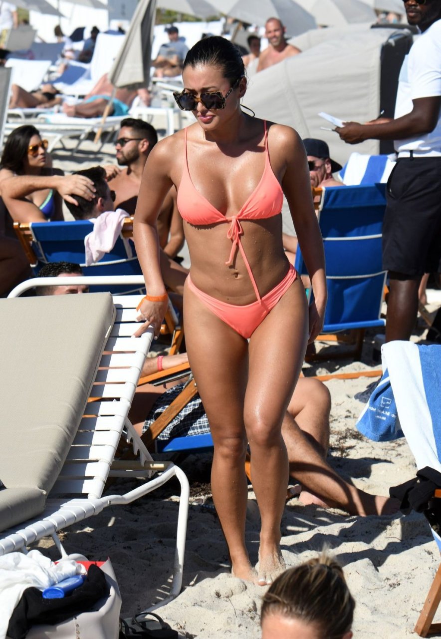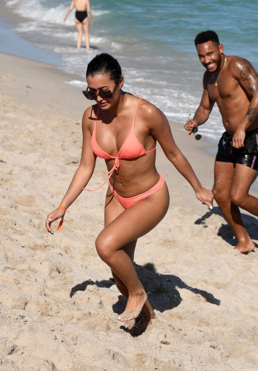 Kazimir “Kaz” Crossley, do Love Island, usa um biquíni pêssego enquanto aproveita a praia com o namorado Josh Denzel em Miami, 01/02/2019.