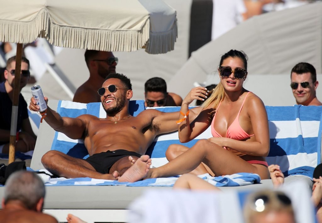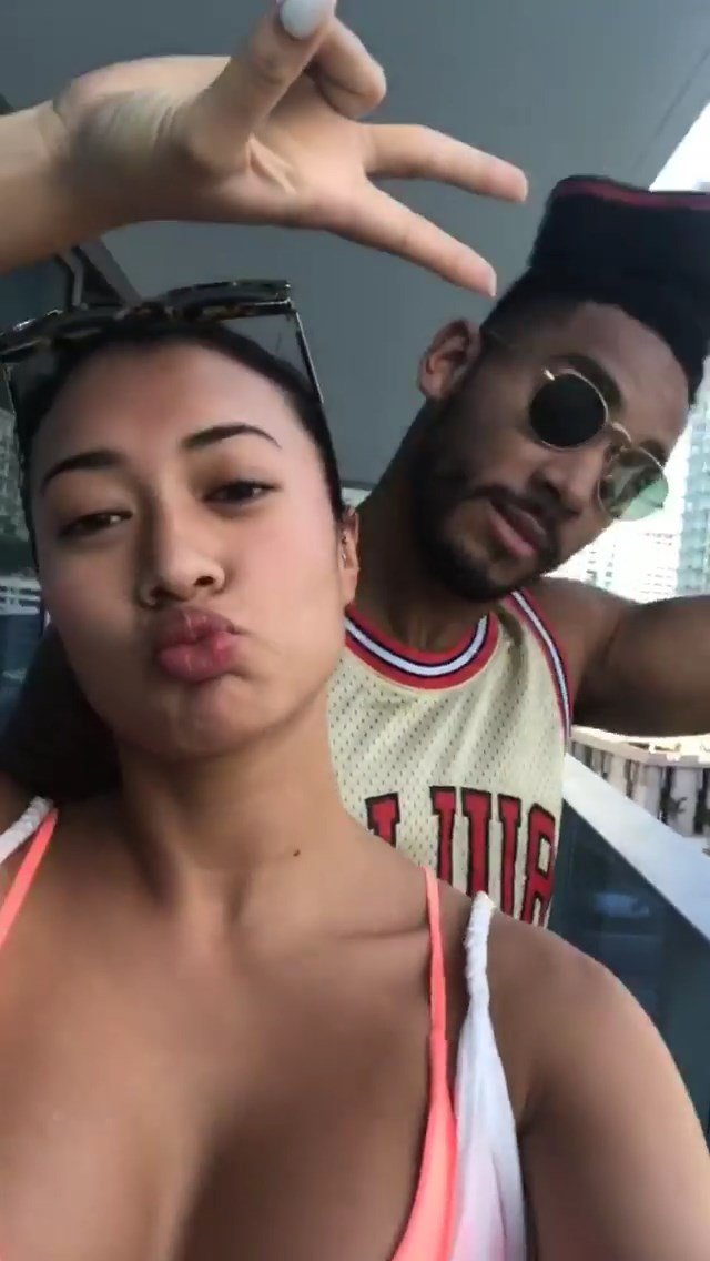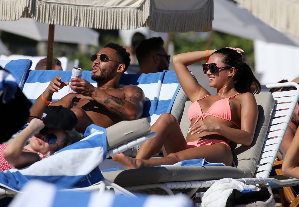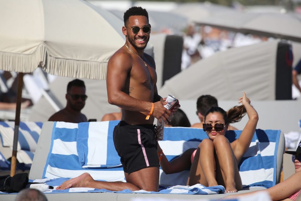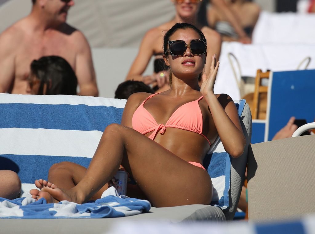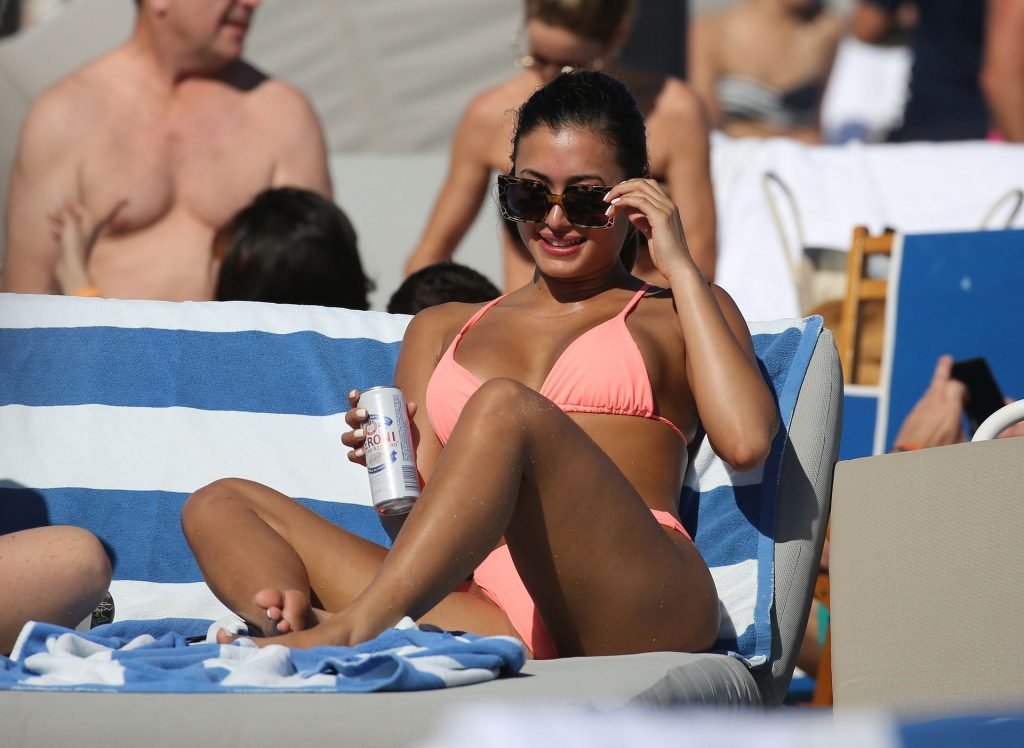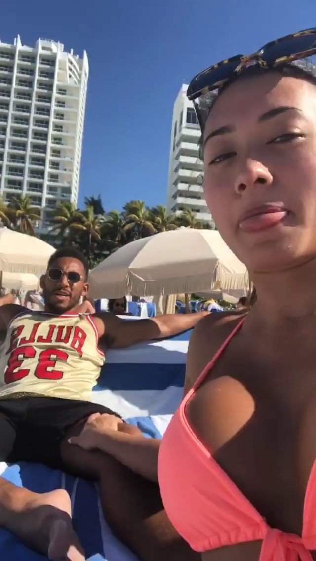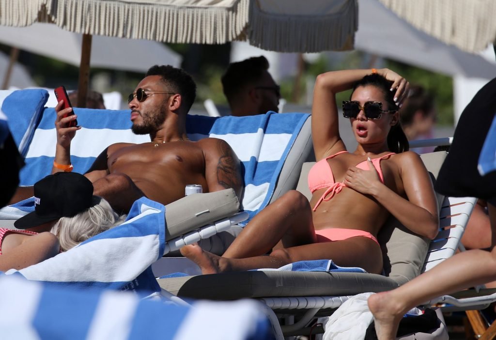Kazimir “Kaz” Crossley, do Love Island, usa um biquíni pêssego enquanto aproveita a praia com o namorado Josh Denzel em Miami, 01/02/2019.