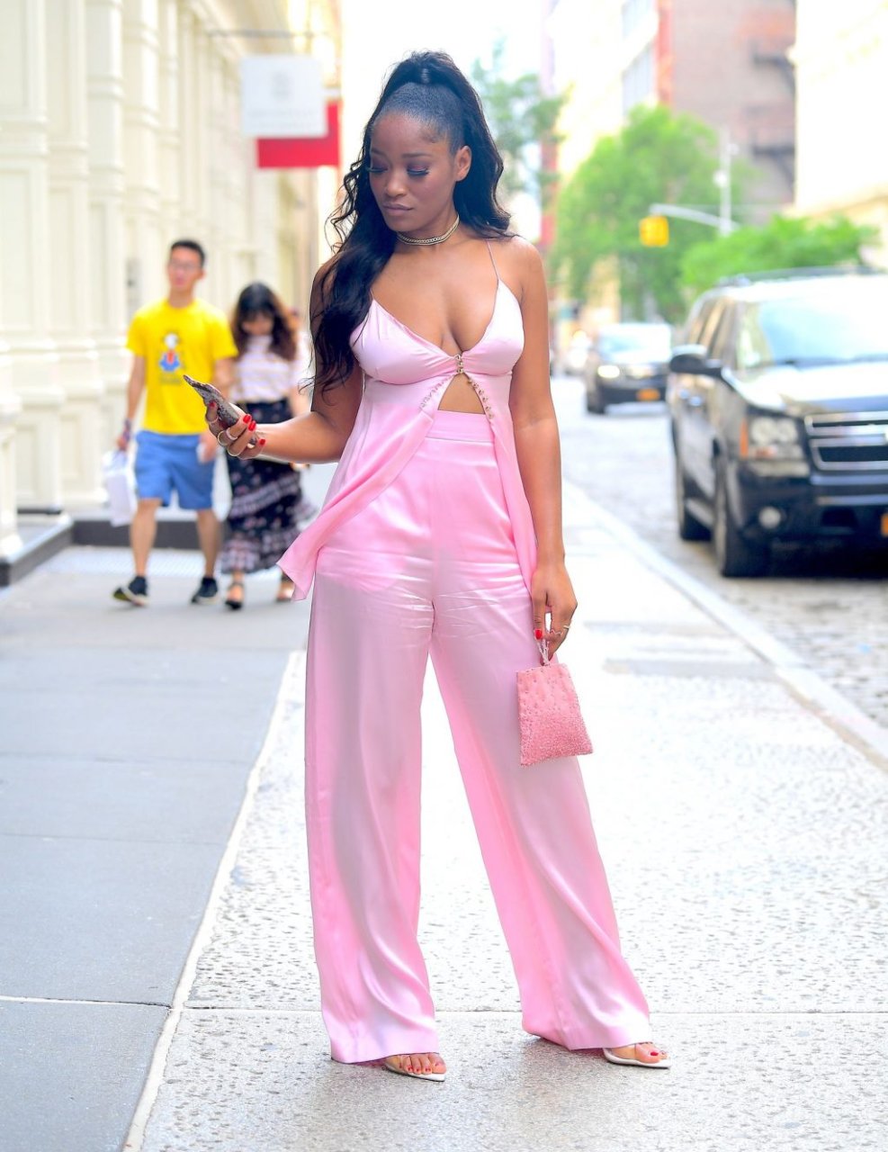 Atriz/cantora Keke Palmer (25) foi vista fazendo compras em Soho na quarta-feira, parecendo deslumbrante em um conjunto rosa decotado (2019).