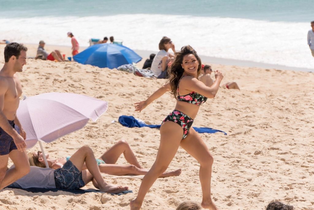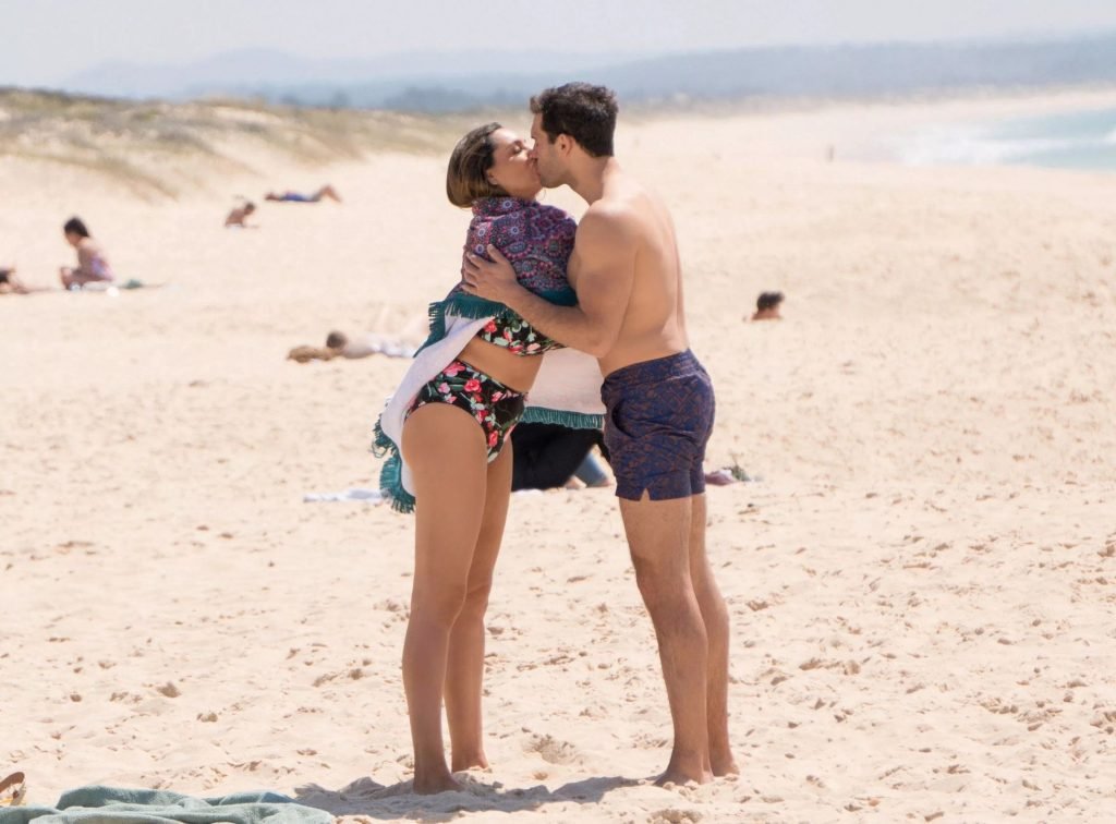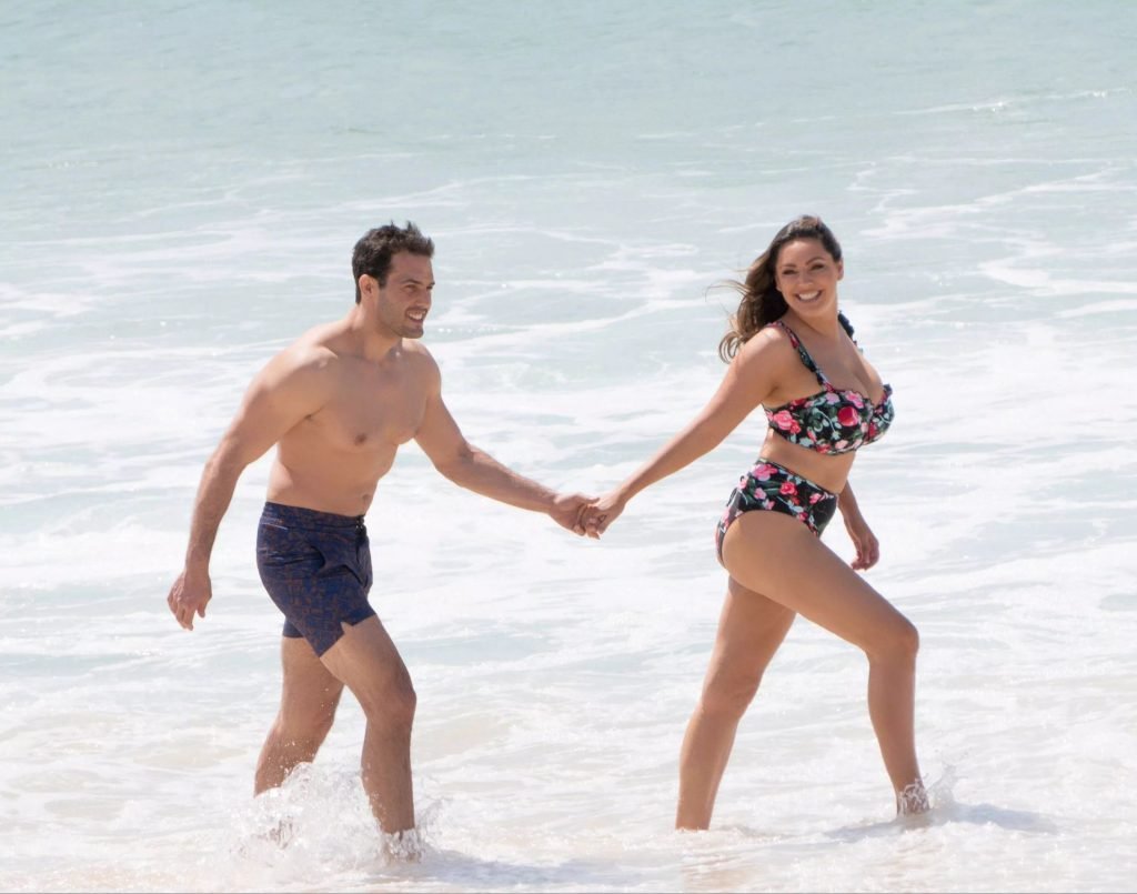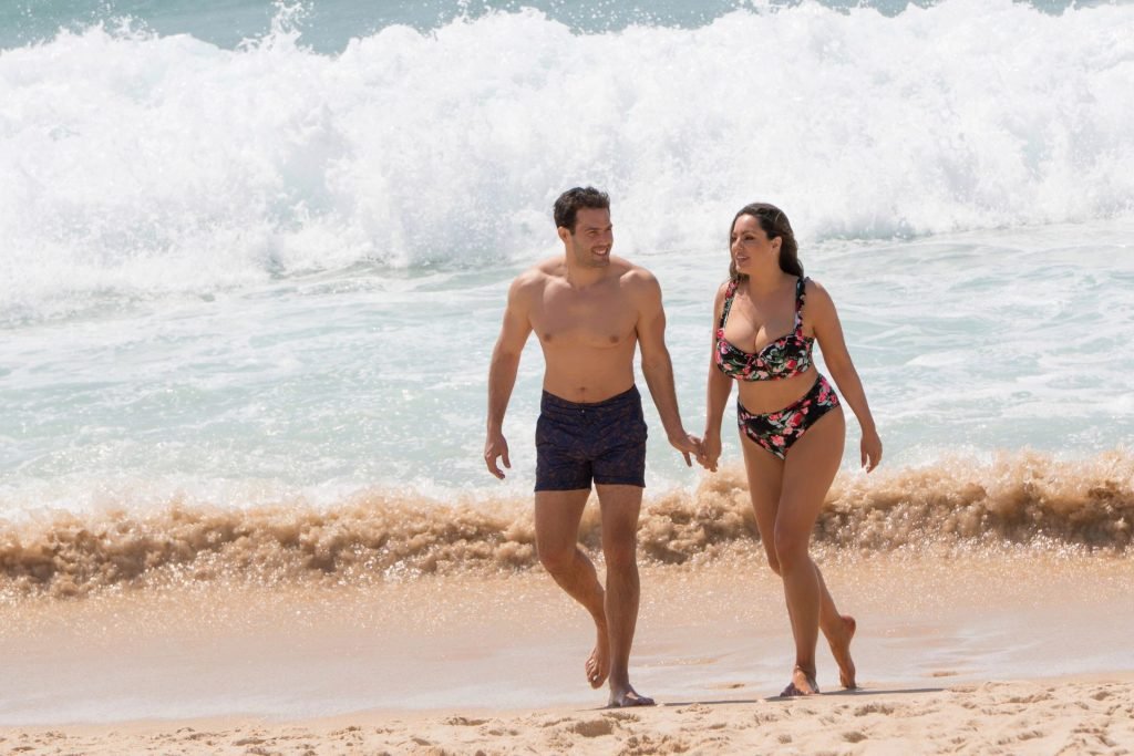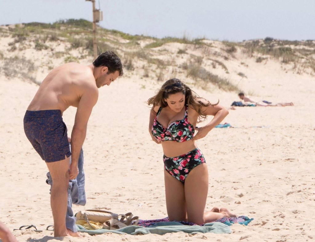 A atriz e modelo Kelly Brook exibiu suas curvas usando um biquíni estampado com flores durante as férias em Setúbal, Portugal (abril de 2019).