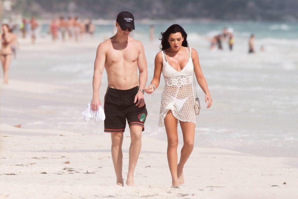 A modelo norueguesa-italiana Kelsie Jean Smeby é vista posando com um biquíni branco minúsculo nas praias de Tulum para uma sessão de fotos improvisada durante suas férias no México, 30/12/2019.