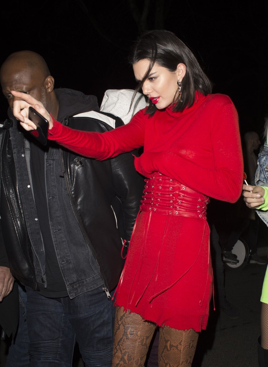 Kendall Jenner usa um vestido vermelho transparente sem sutiã em Paris, 03/04/2017. Kendall Jenner é uma personalidade da TV, modelo, atriz (Hawaii Five-0, Série de TV) de Los Angeles (EUA). Idade – 21 (nascida em 3 de novembro de 1995). Altura – 178 cm.