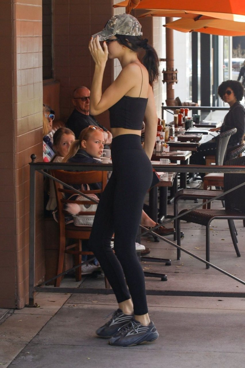 Kendall sai sem sutiã e exibe seu físico em forma com leggings justas e um top preto cropped.