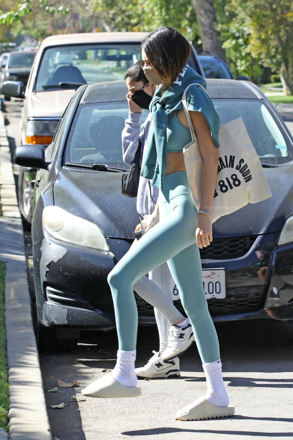 Model Kendall Jenner é vista usando Yeezy Slides ‘Bone’ e conjunto colorido de treino, saindo de sua aula matinal de Pilates em West Hollywood, 27/03/2021.