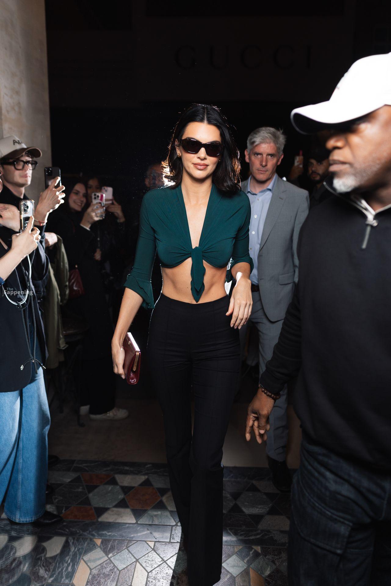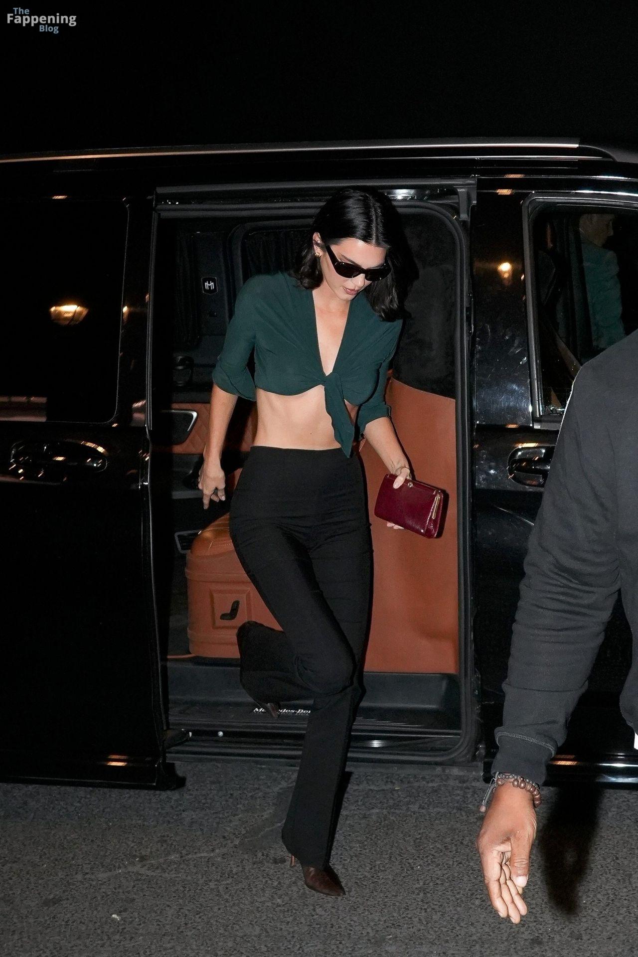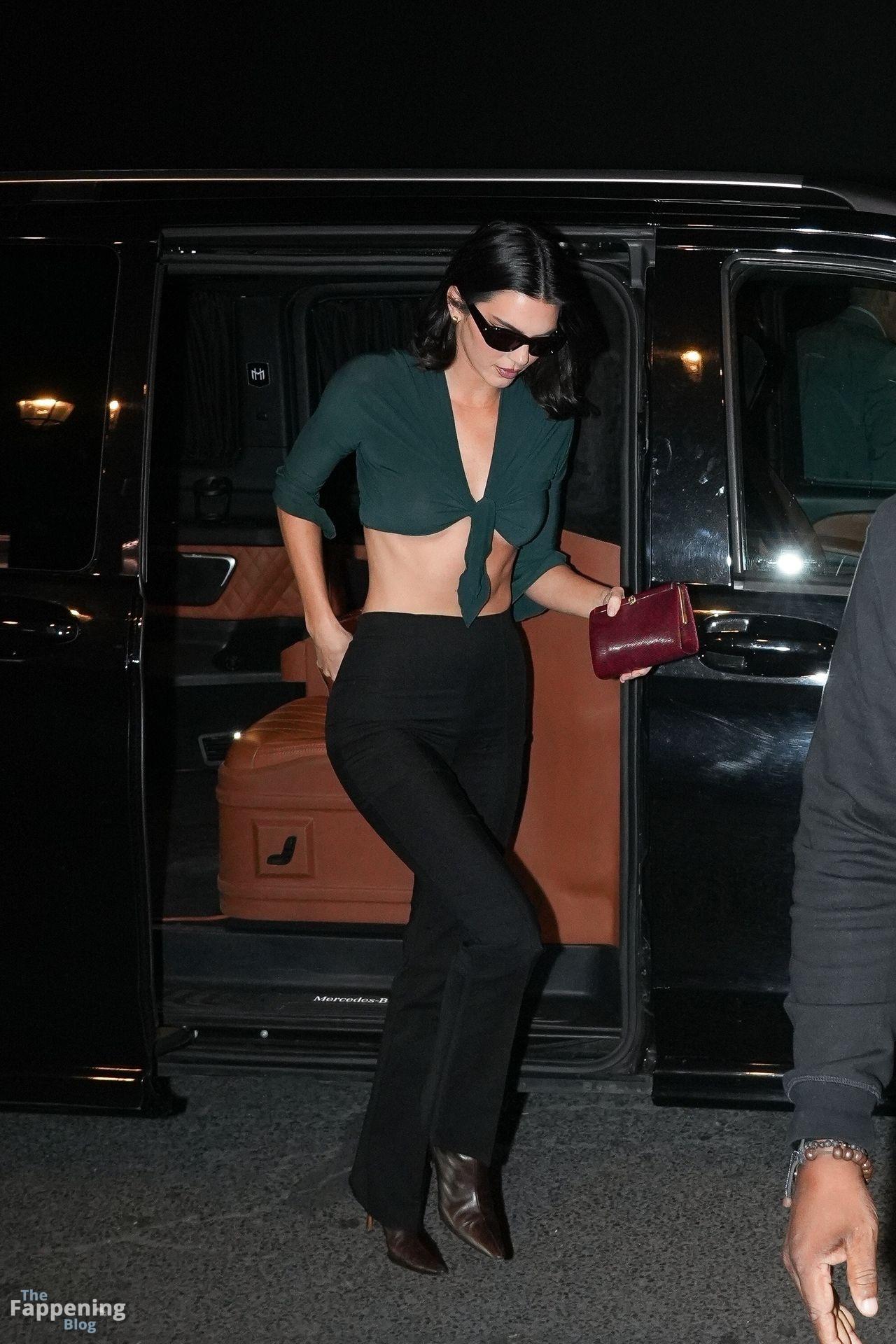 Kendall Jenner exibiu seus abdômenes e provocou com os mamilos em um top curto minúsculo e calças justíssimas. Ela foi vista voltando para o Hotel Costes em Paris após uma noite durante a Semana de Moda de Paris.