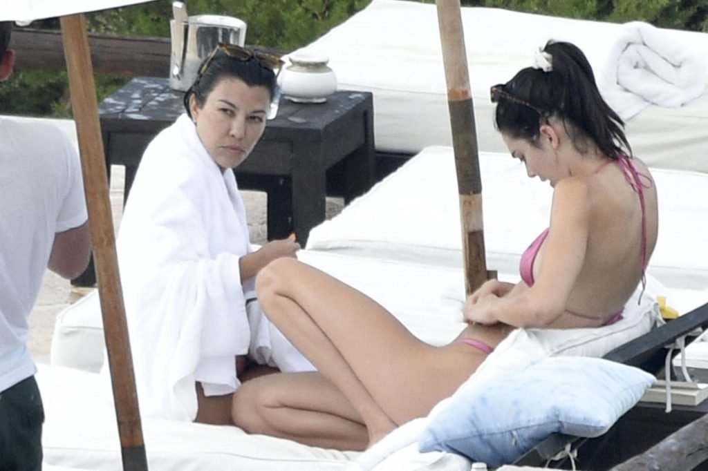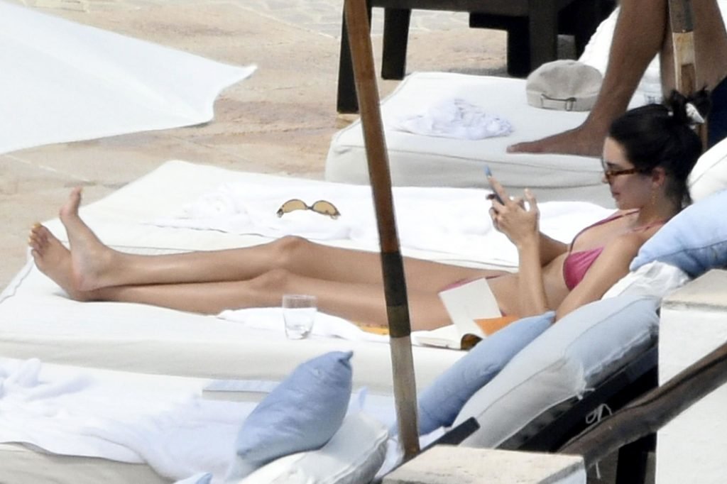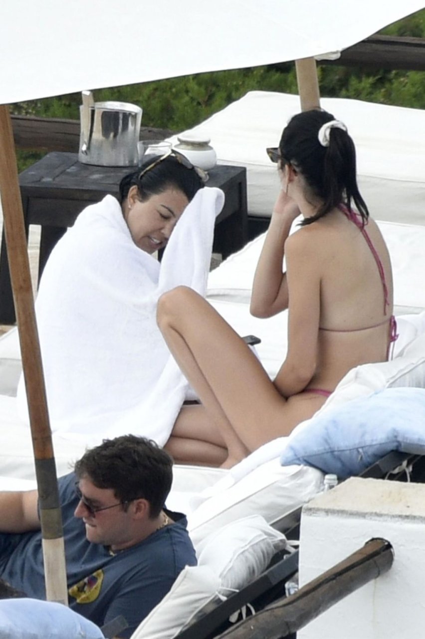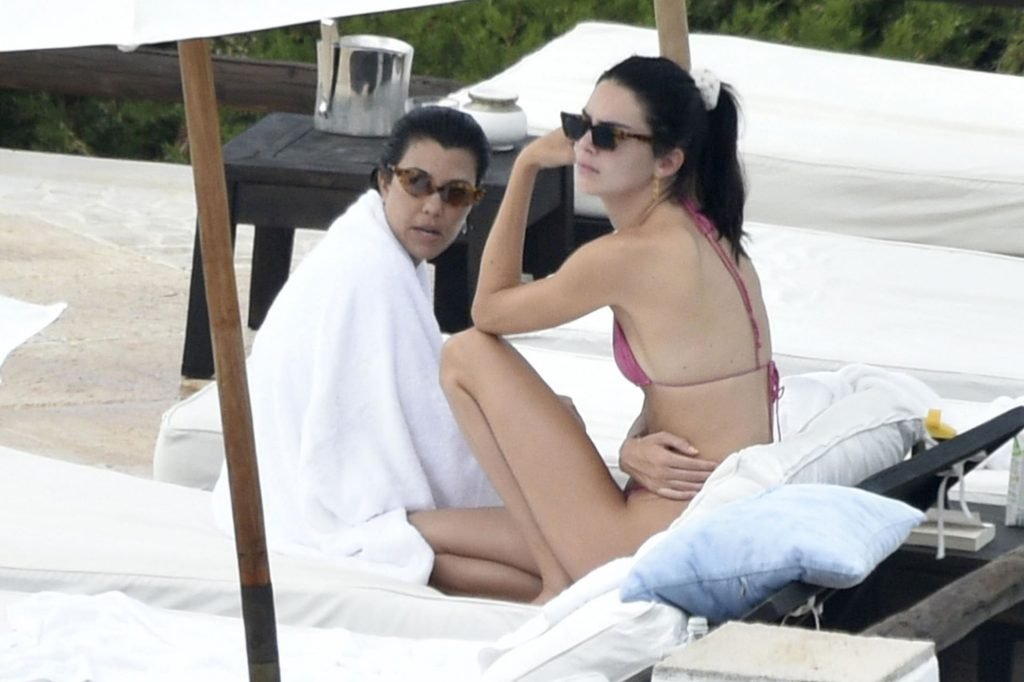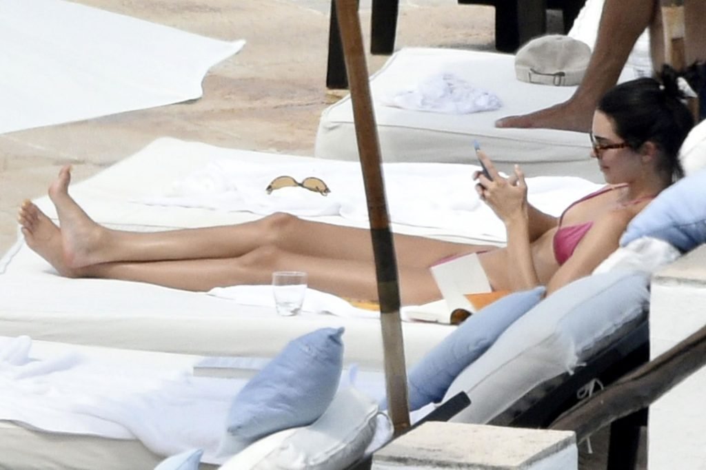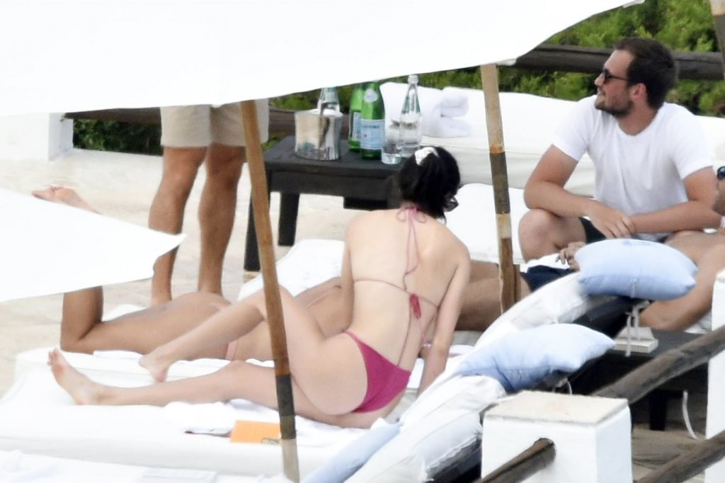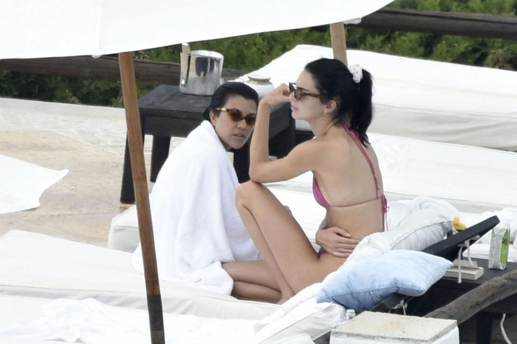 Kendall Jenner aproveita suas férias enquanto exibe seu corpo esguio à beira da piscina com Kourtney Kardashian e amigos em Costa Smeralda, Sardenha, 27/07/2019. Kendall pode ser vista lendo um livro enquanto toma sol.