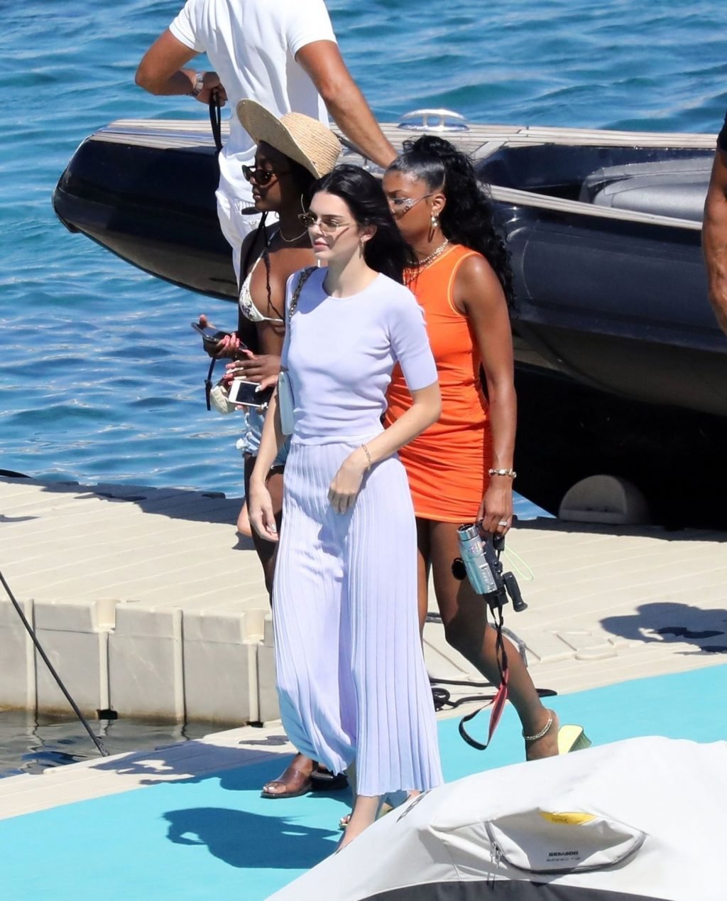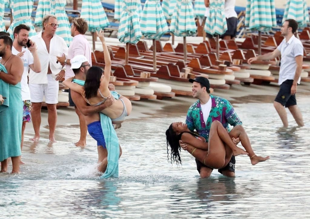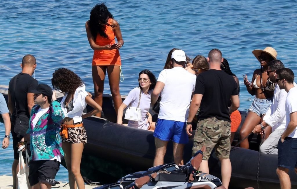 As garotas foram fotografadas chegando de barco ao restaurante da praia Nammos com seu séquito, antes de seguirem para a praia para festejar durante o pôr do sol. Kendall e suas amigas pareciam muito animadas enquanto posavam para selfies no mar antes de caírem, o que fez Kendall e Shanina rirem histéricas.